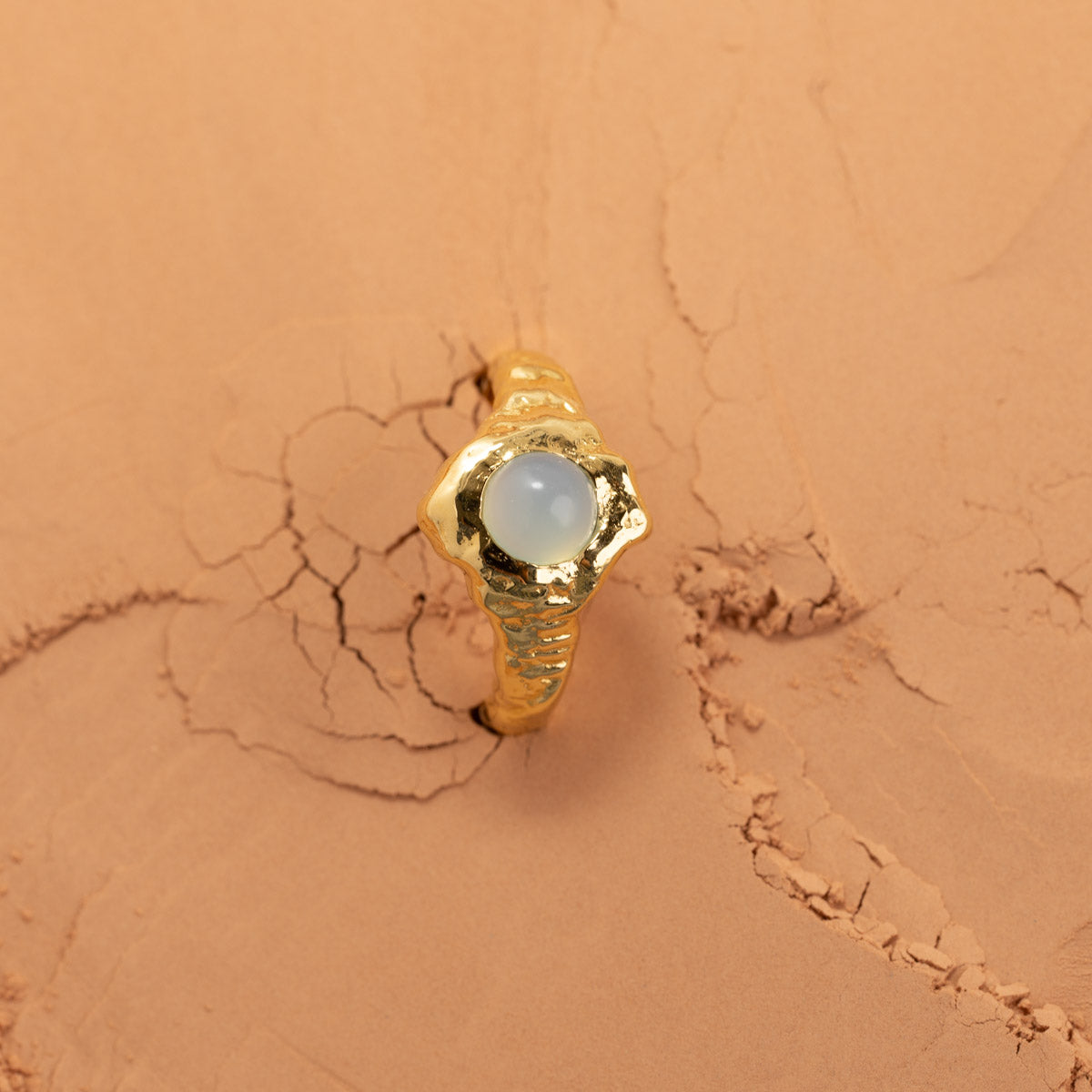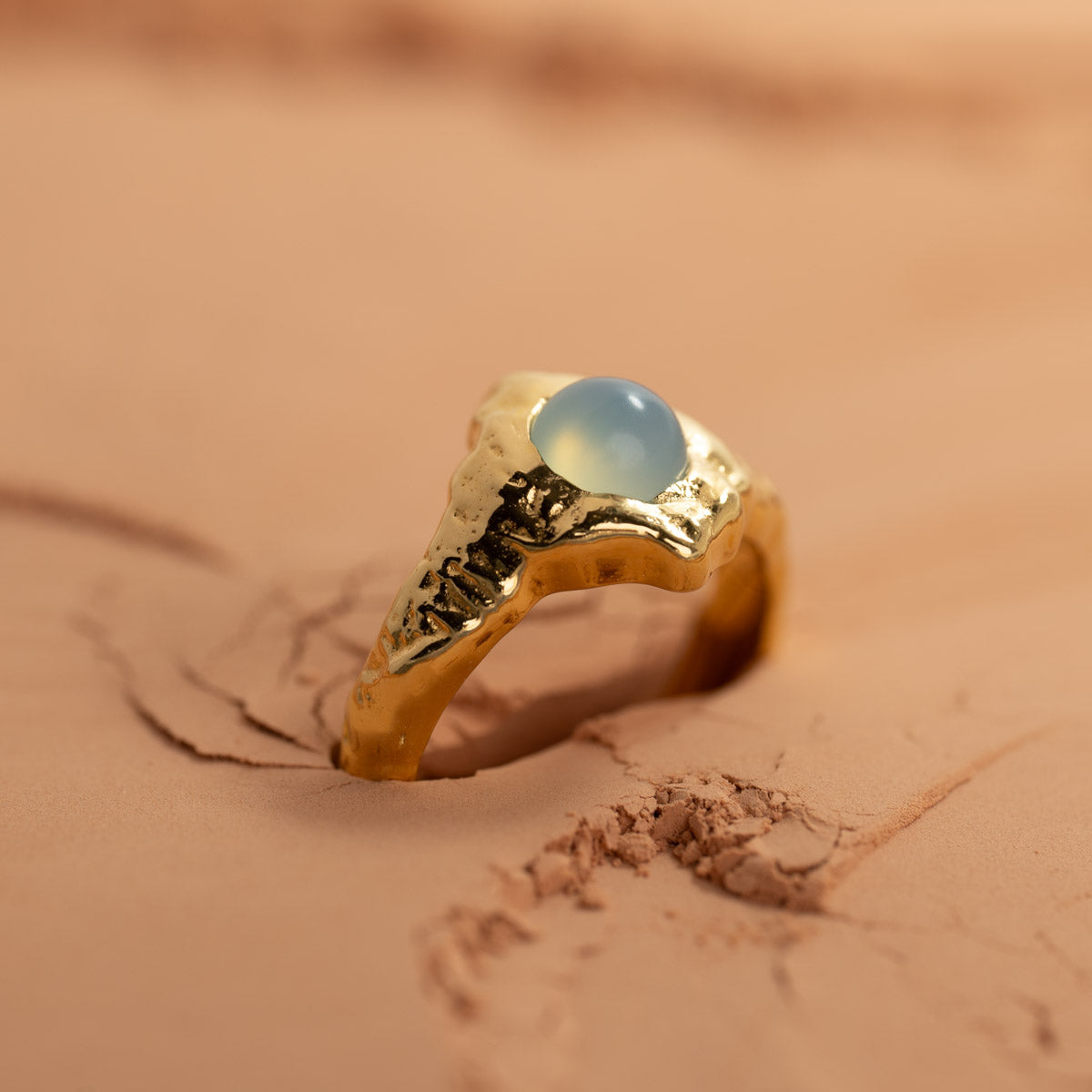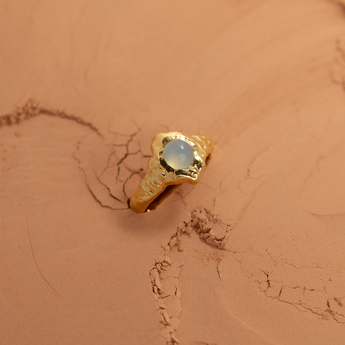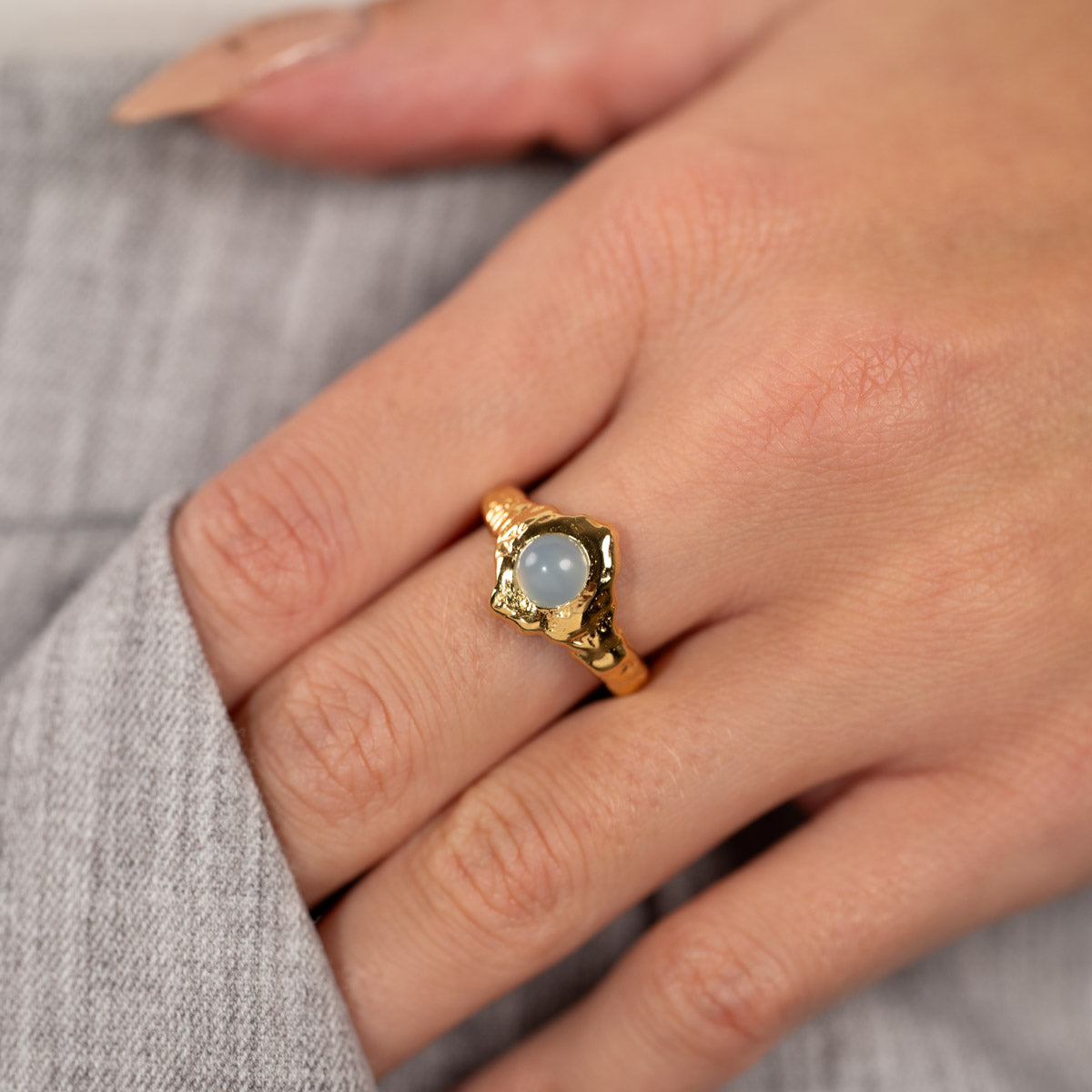 The Gigi ring is crafted in recycled 18-karat gold-plated silver with a cabochon-cut blue aqua chalcedony. The ring has an organic shape with a textured surface, giving it a unique and exciting expression.