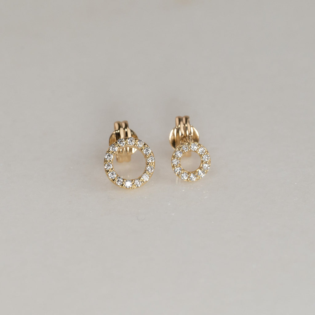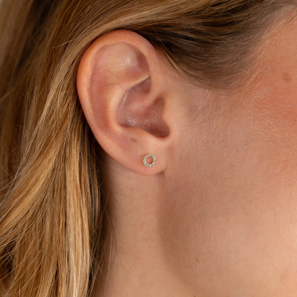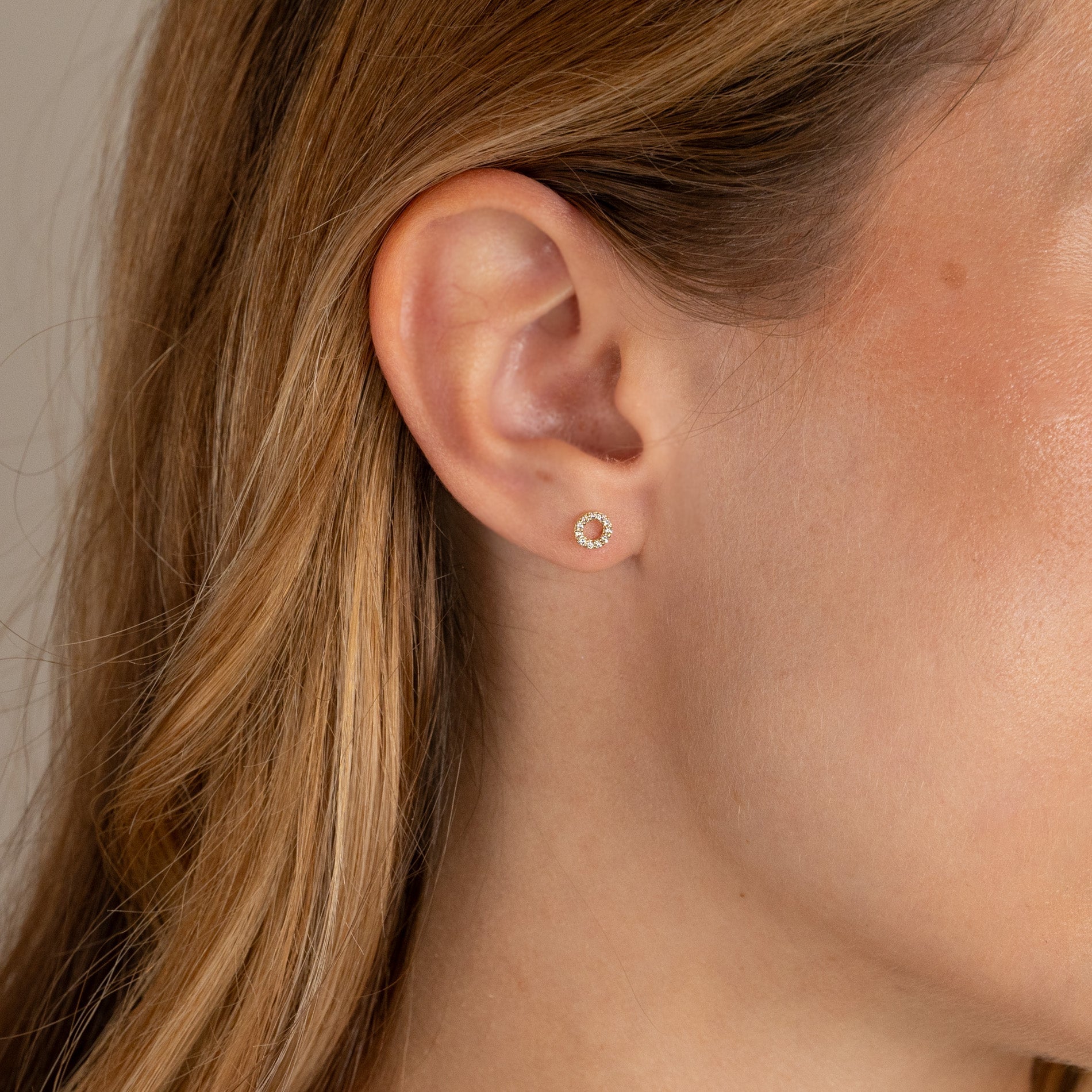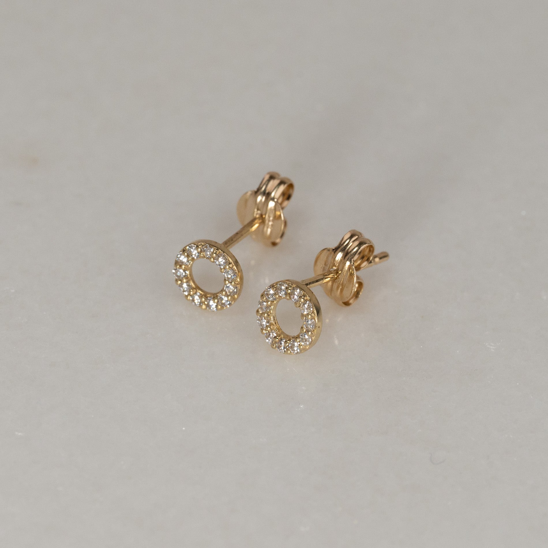 The studs consist of an open circle adorned with small white cubic zirconia stones, which create a beautiful play of light and they sparkle elegantly.