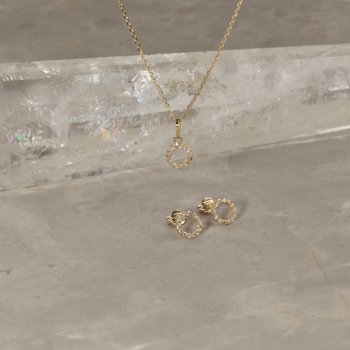 These earrings are made from 100% recycled solid 9-karat gold. They are adorned with many small and exquisite white cubic zirconia stones that create a beautiful play of light and shine brilliantly. The earrings have an incredibly elegant and timeless design.