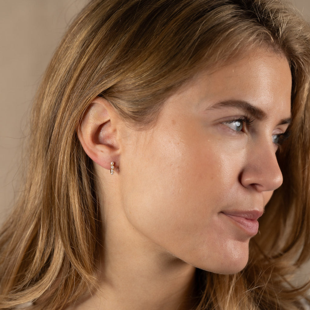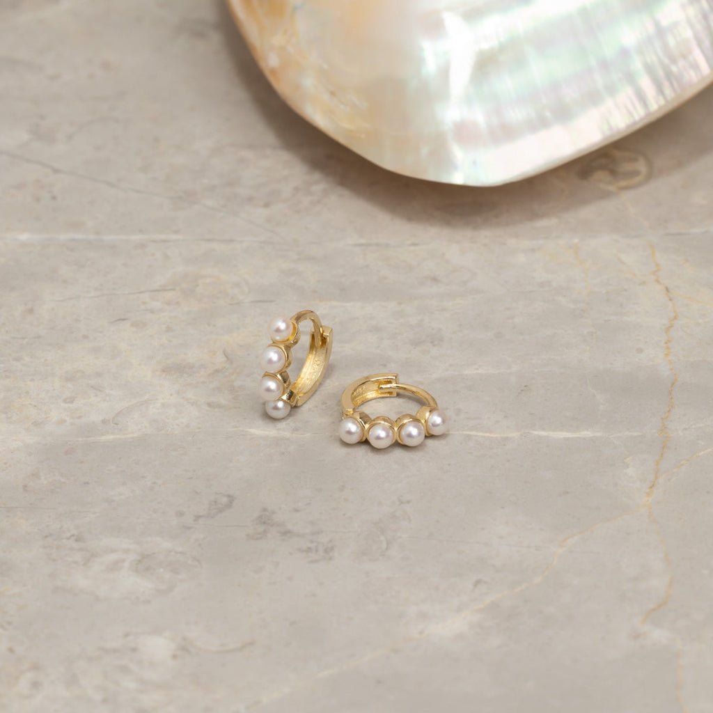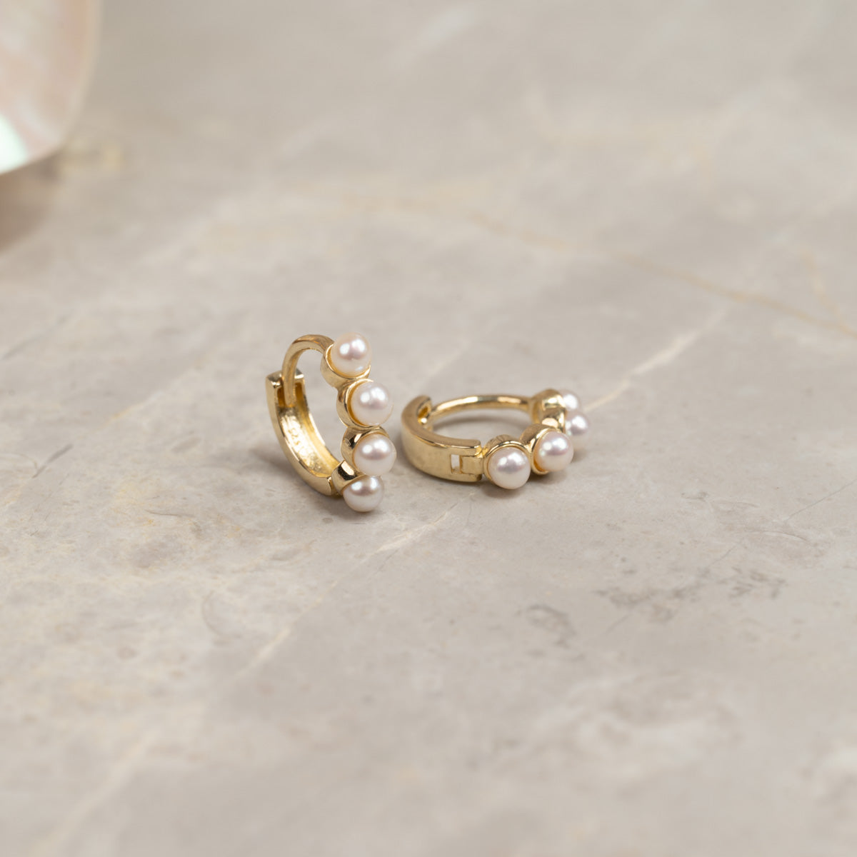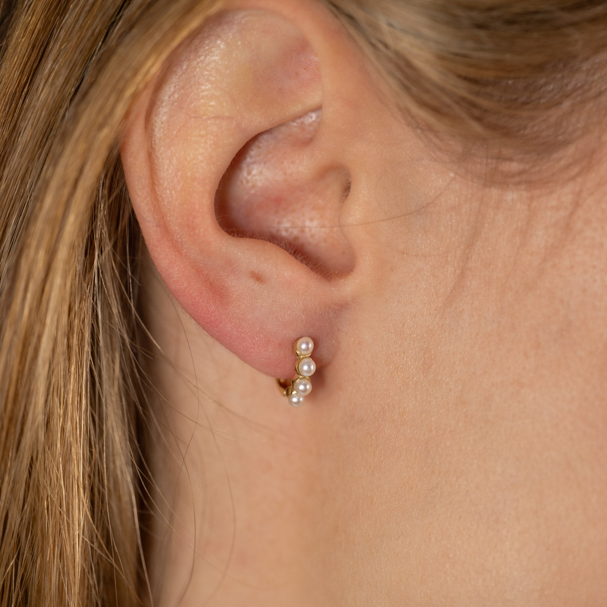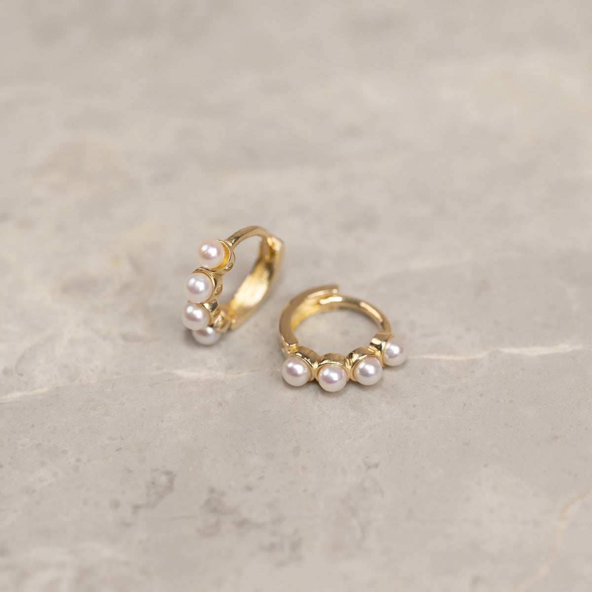 Our Gudnare Mini earrings are made from 100% recycled solid 9 karat gold. These small earrings are delicate and elegant. Each earring features four small white freshwater pearls. The hoops have a diameter of 9mm.