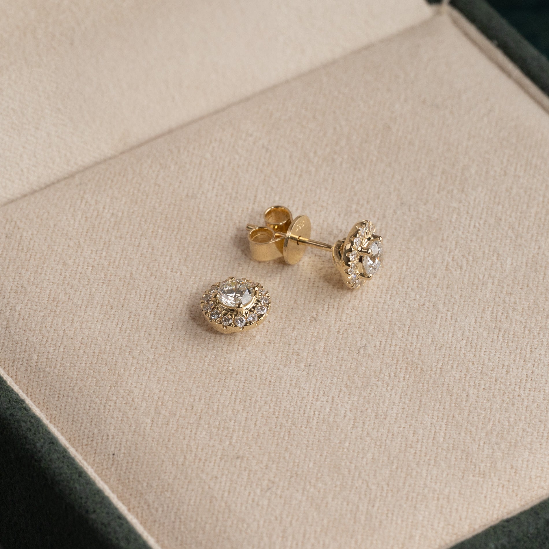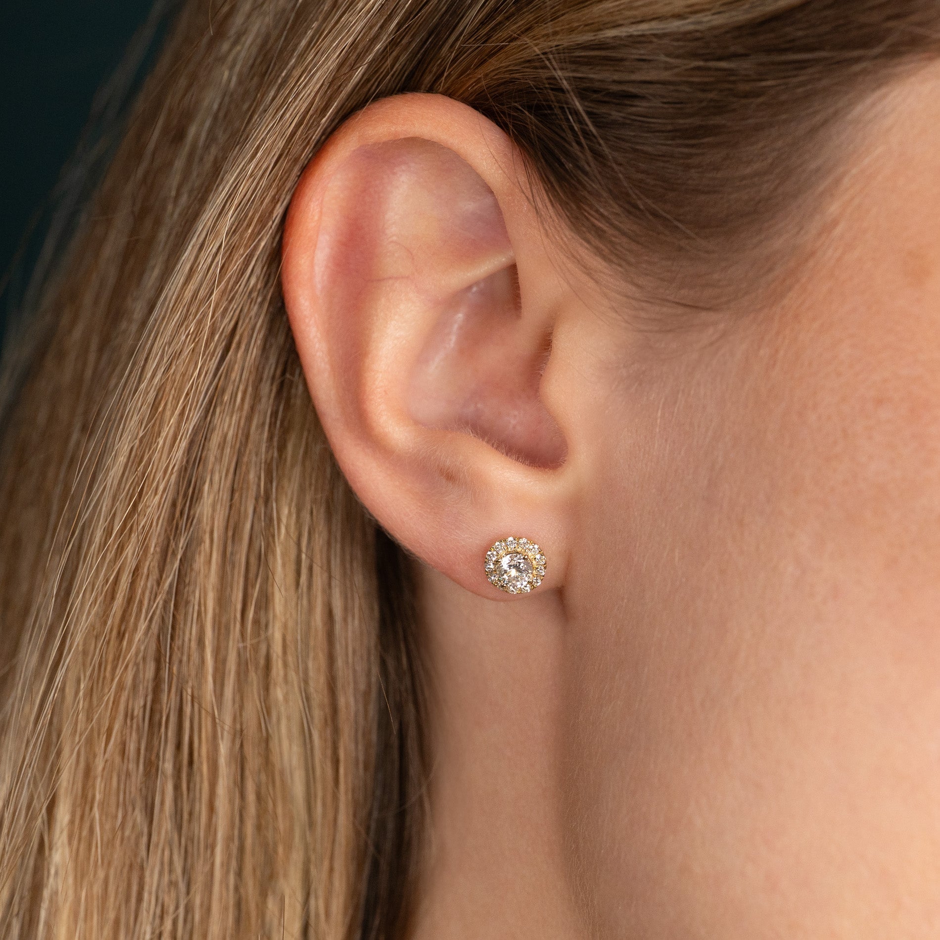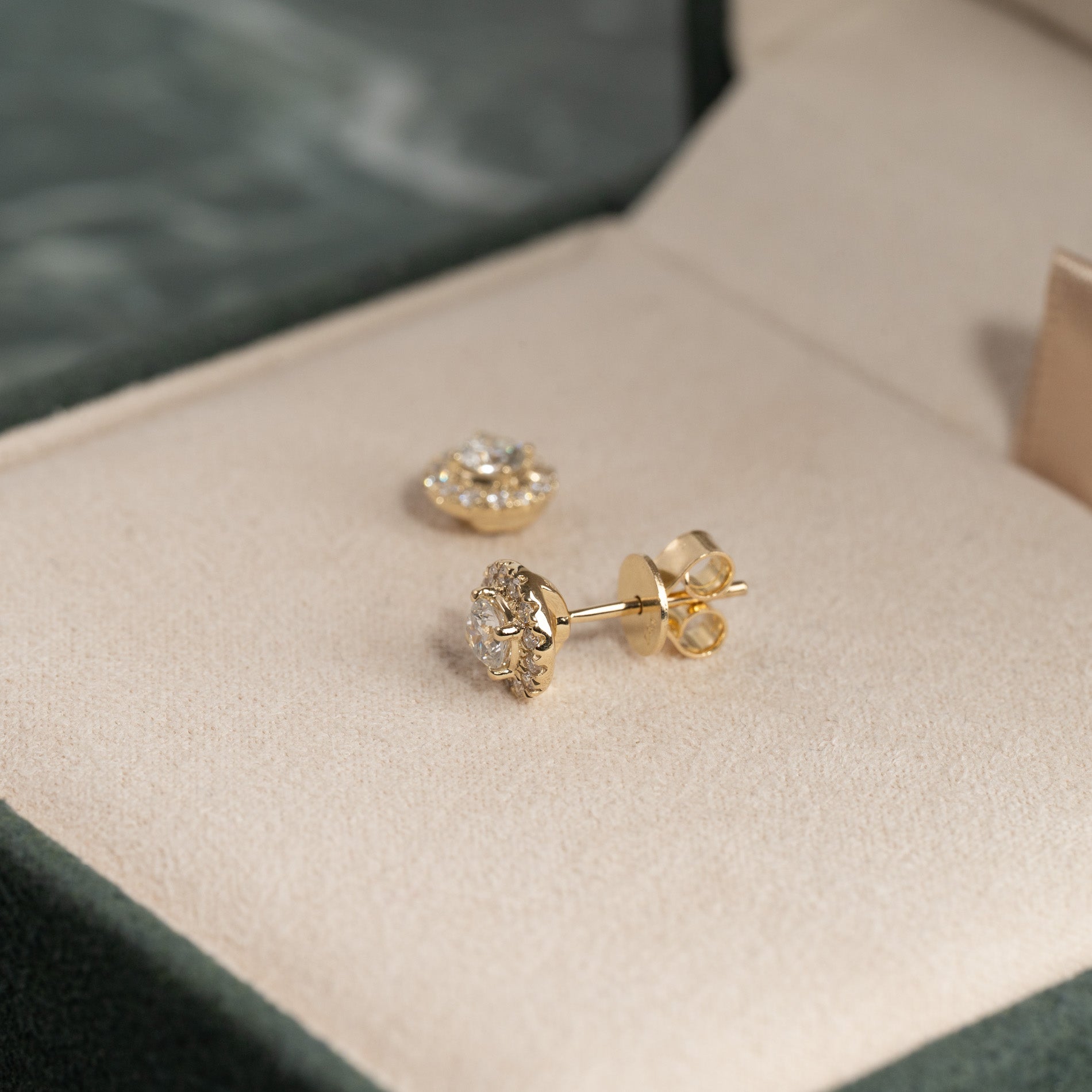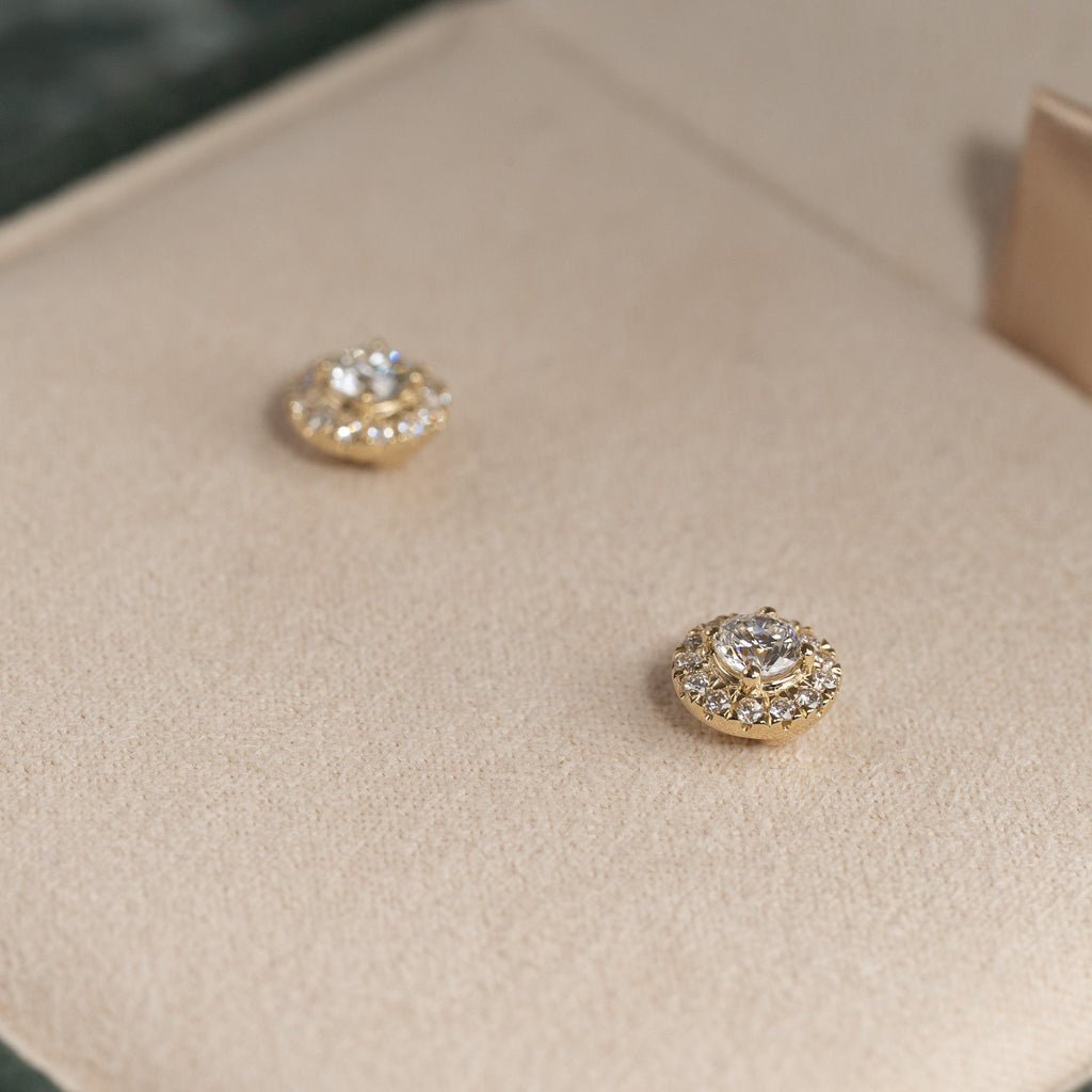 Diamond stud earrings in 14k gold. These diamond stud earrings feature a brilliant-cut lab-grown diamond at the center, surrounded by a delicate halo of 12 smaller brilliant-cut diamonds. The halo design creates an elegant and feminine piece, with the earrings achieving a beautiful overall diameter while sitting closely against the ear.