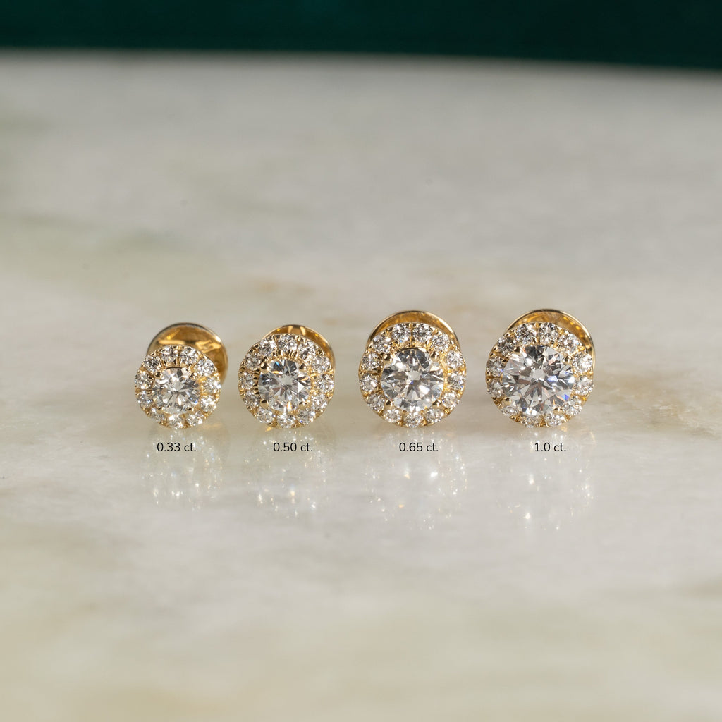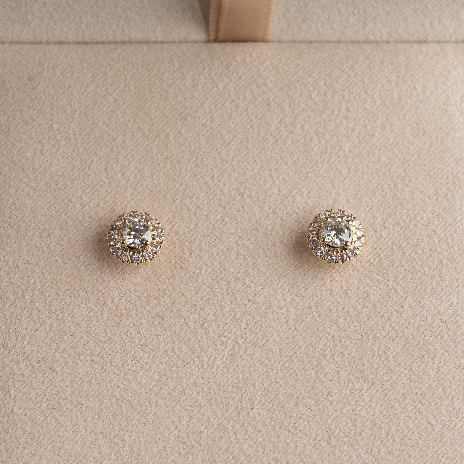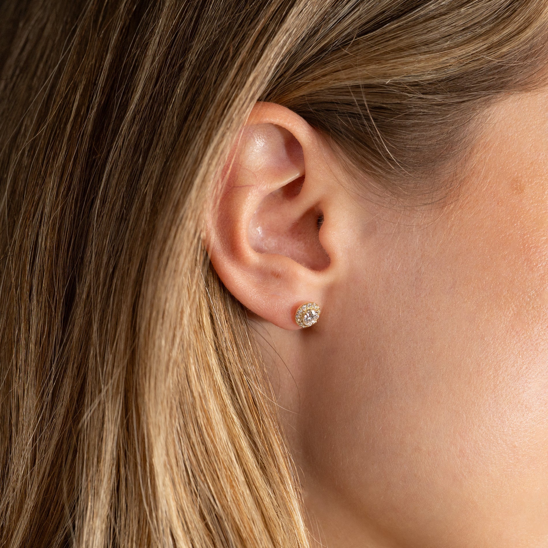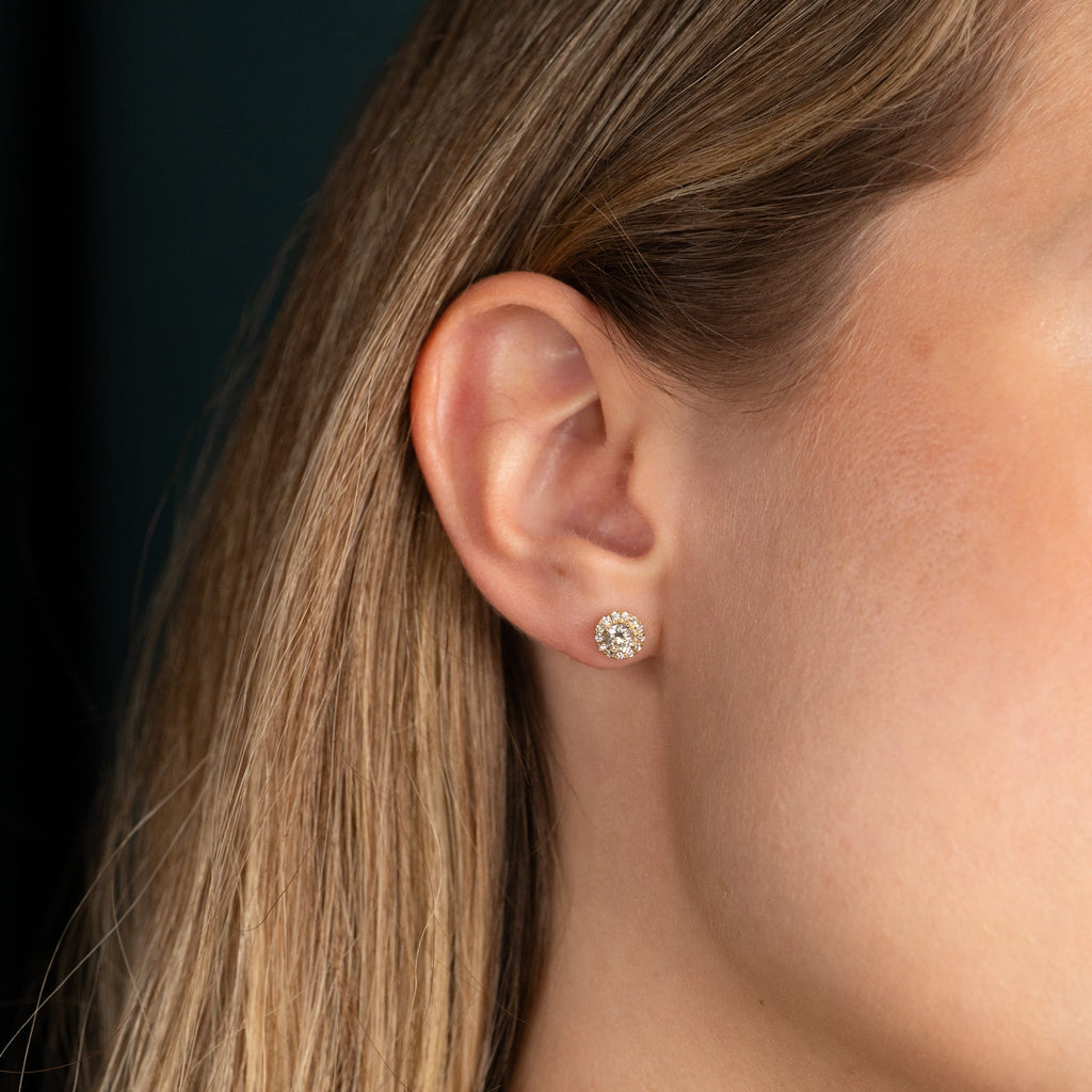 Diamond stud earrings in 14k gold. These diamond stud earrings feature a brilliant-cut lab-grown diamond at the center, surrounded by a delicate halo of 12 smaller brilliant-cut diamonds. The halo design creates an elegant and feminine piece, with the earrings achieving a beautiful overall diameter while sitting closely against the ear.
