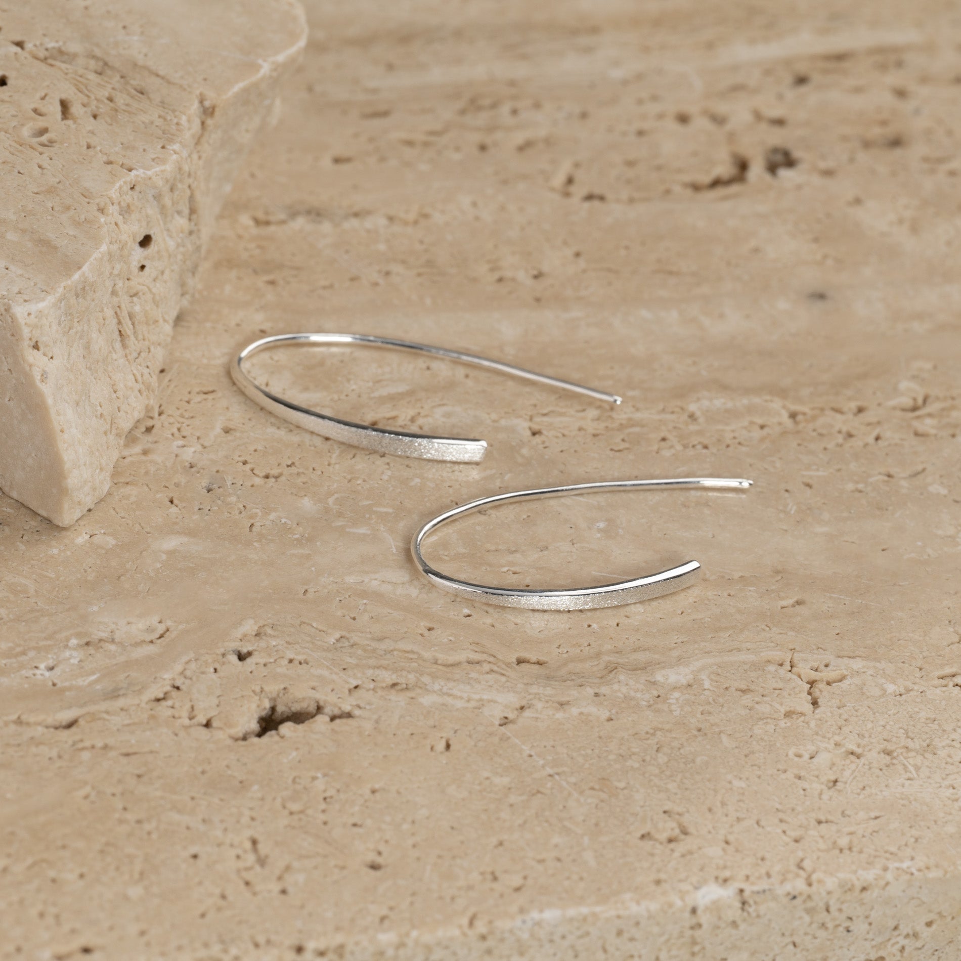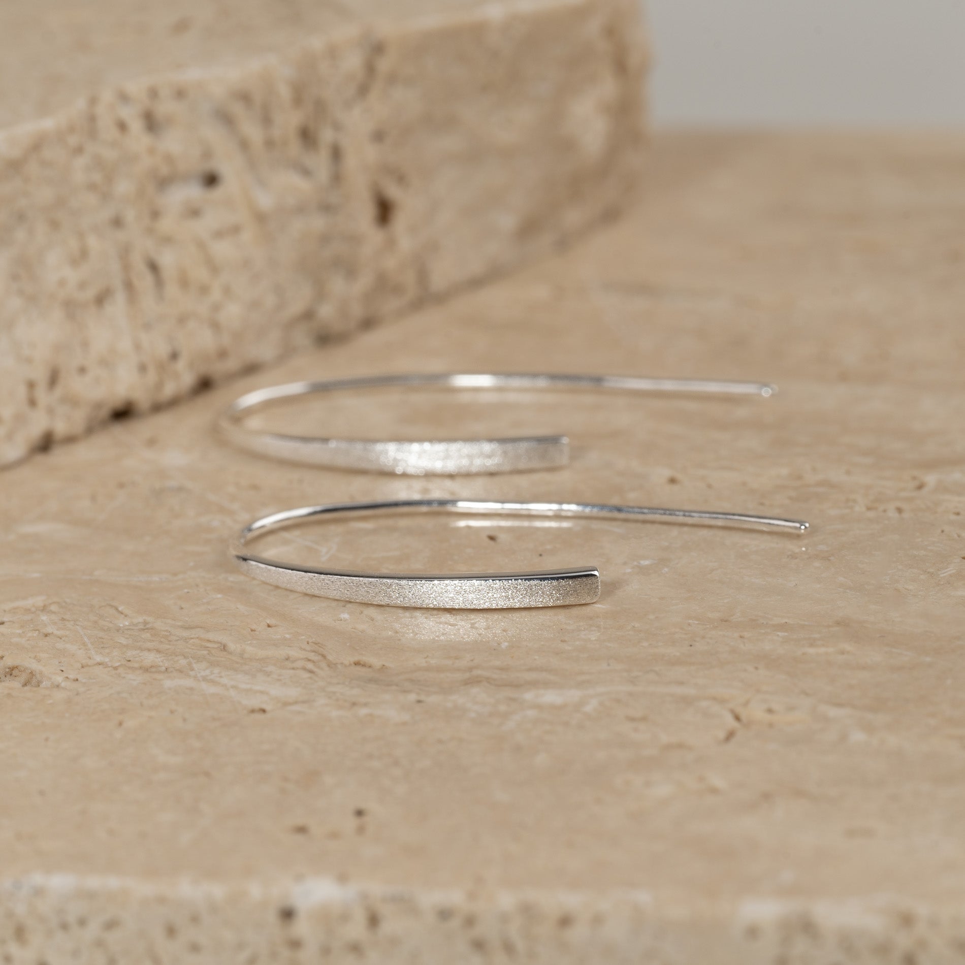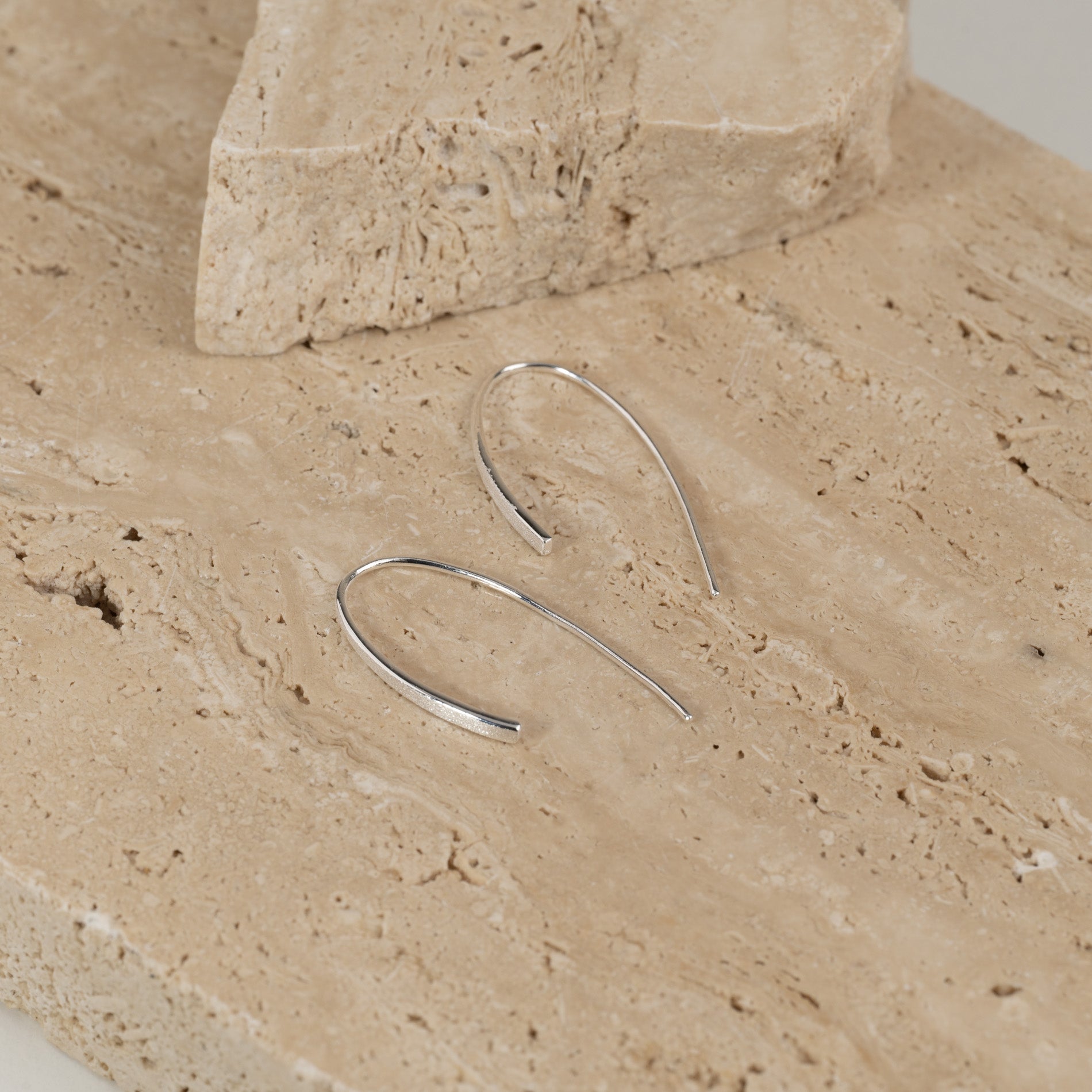 Our Hedva earrings are made from 100% recycled sterling silver. They are designed as elongated open earrings without a clasp or back stopper.