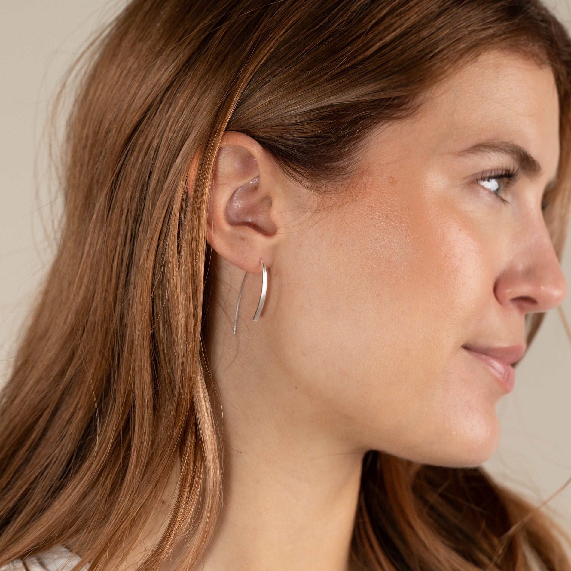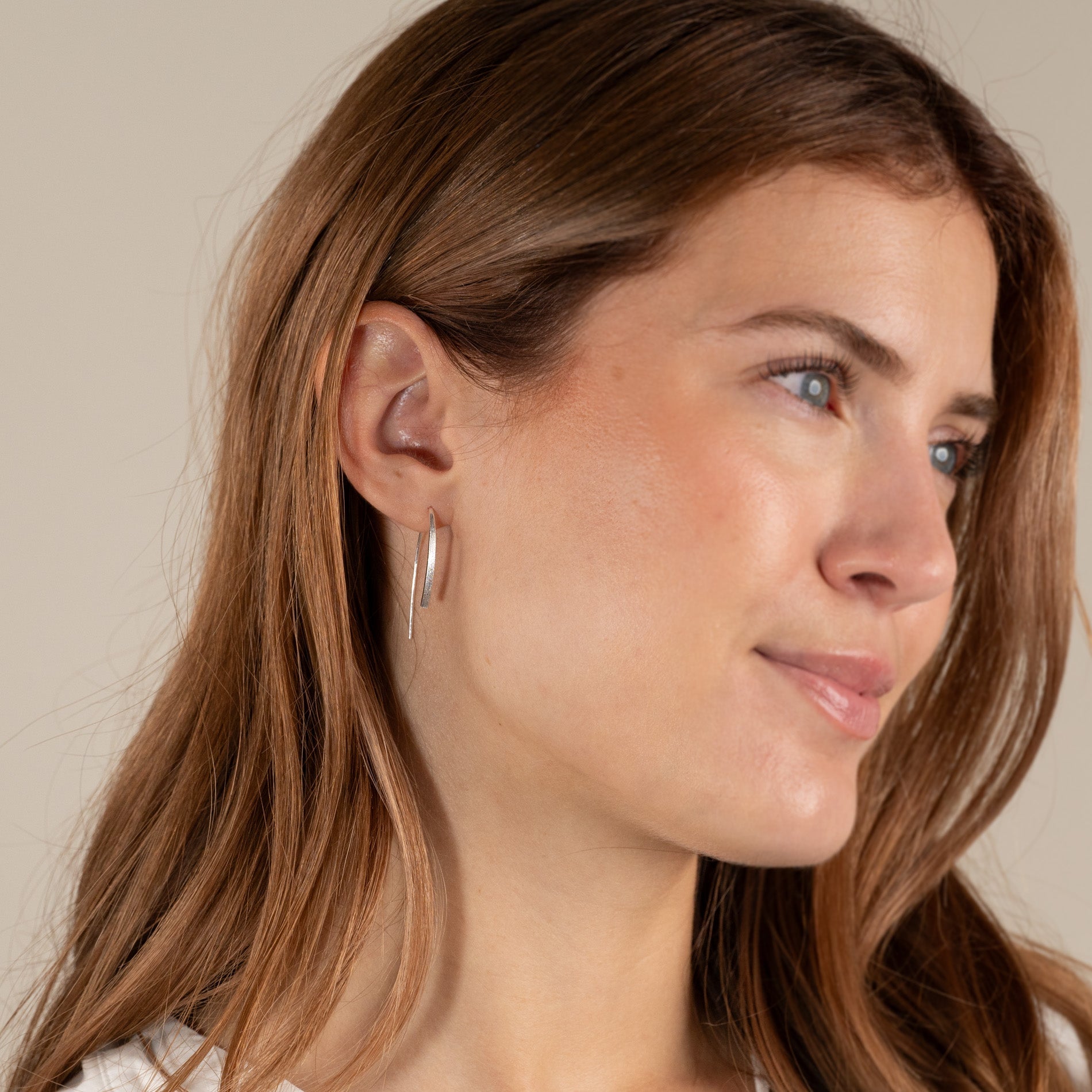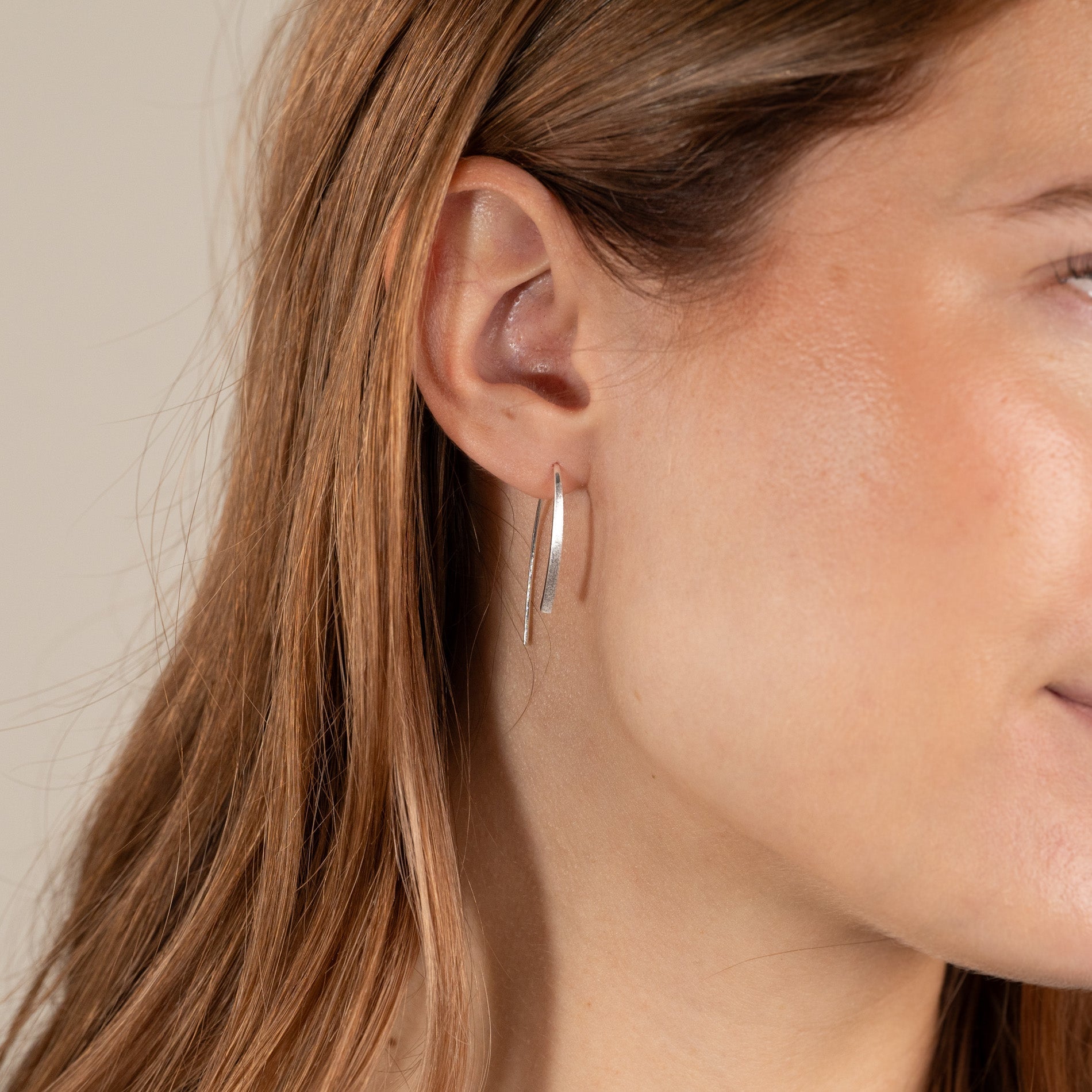 Our Hedva earrings are made from 100% recycled sterling silver. They are designed as elongated open earrings without a clasp or back stopper.
