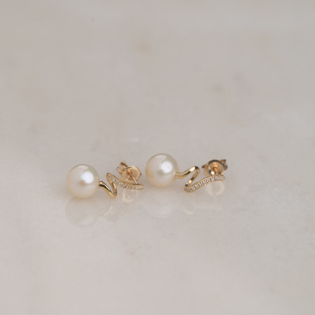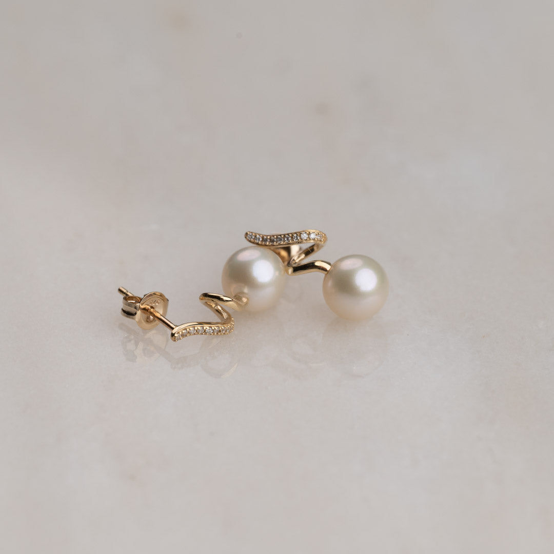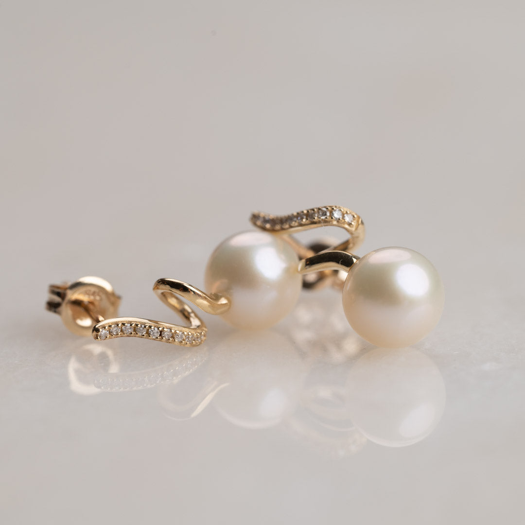 They are designed as a twisted ear stud with a round 7.5mm freshwater pearl hanging beneath. The twisted design creates a light and playful earpiece combined with the fine diamonds elegance.