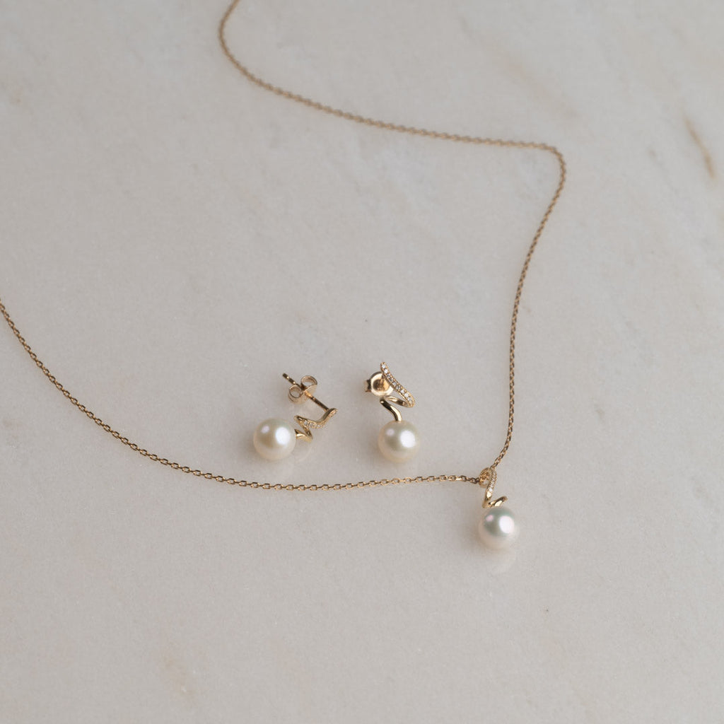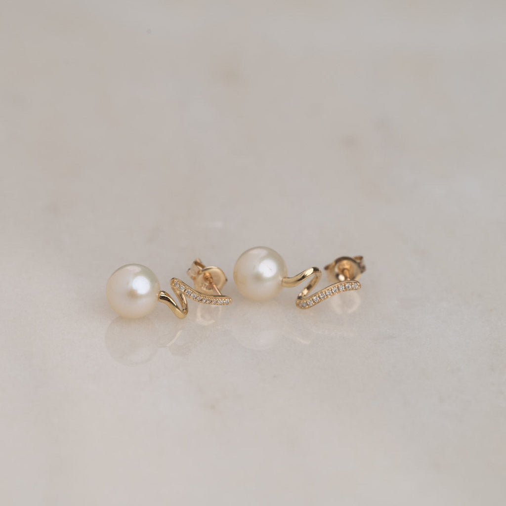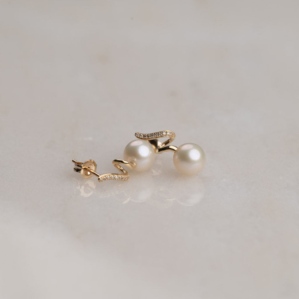 The Lora earrings are made of 100% recycled 9 carat solid gold with real diamonds and white freshwater pearls.