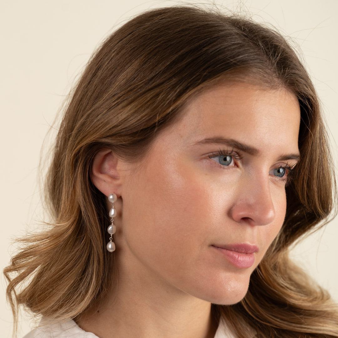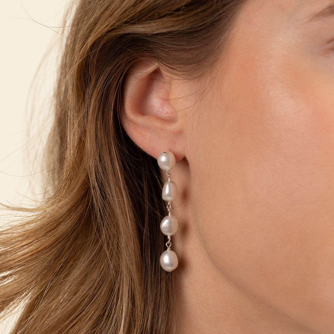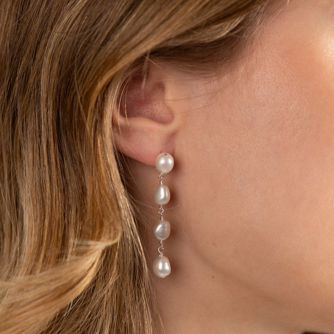 Earrings in 925 sterling silver. The earrings feature four hanging freshwater pearls, each measuring approximately 7-7.5mm. The total length is approximately 45mm. The earrings are secured with a butterfly clasp.