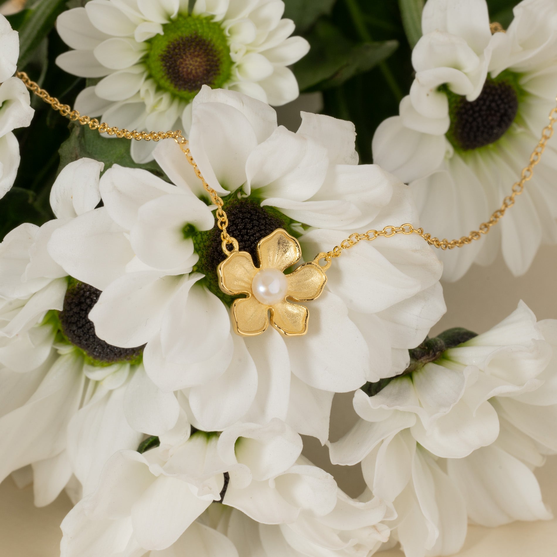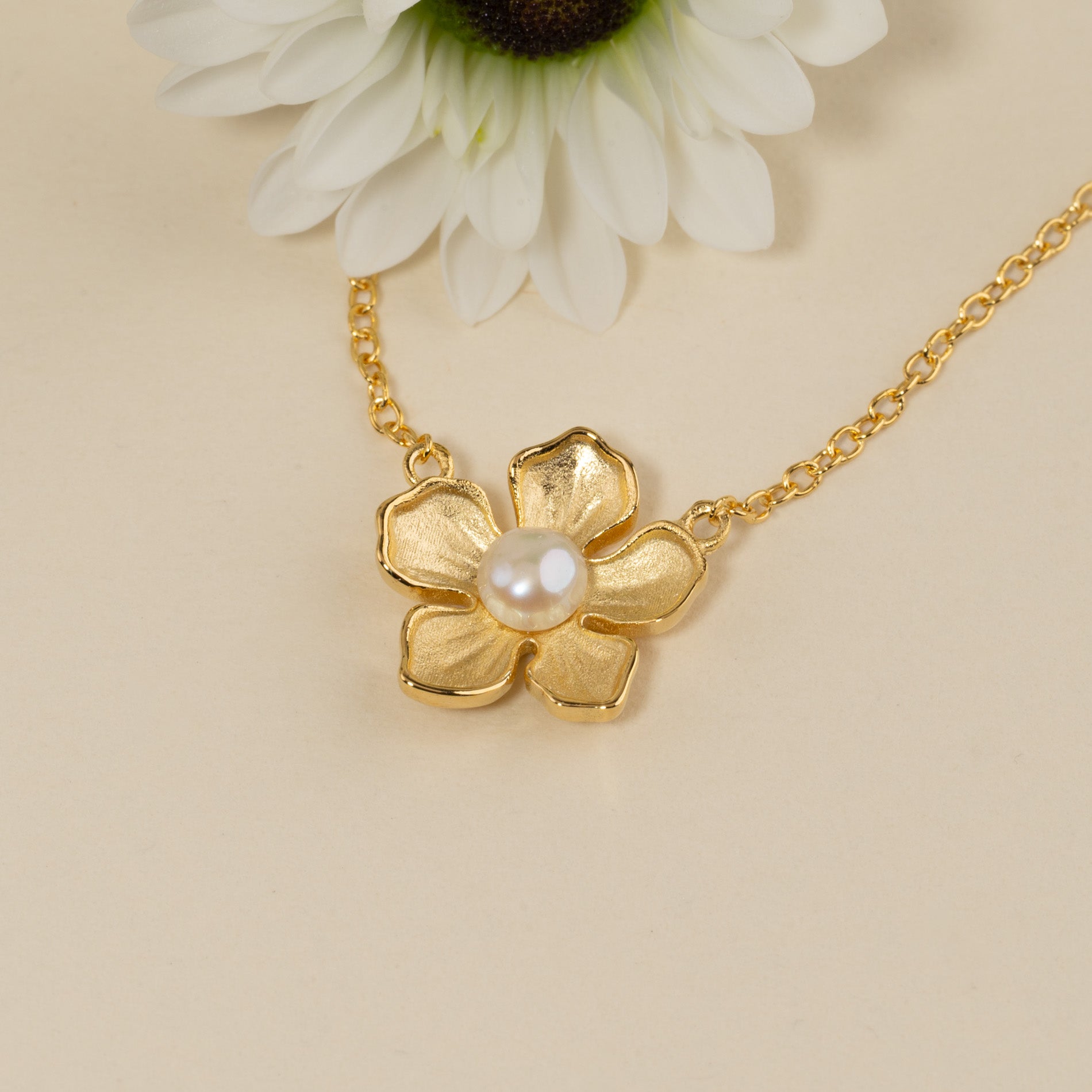 Necklace crafted from 100% recycled 18K gold-plated 925 sterling silver, featuring a delicate flower pendant with a white freshwater pearl at its center, seamlessly integrated into the chain. The organic design lends a unique, feminine charm.