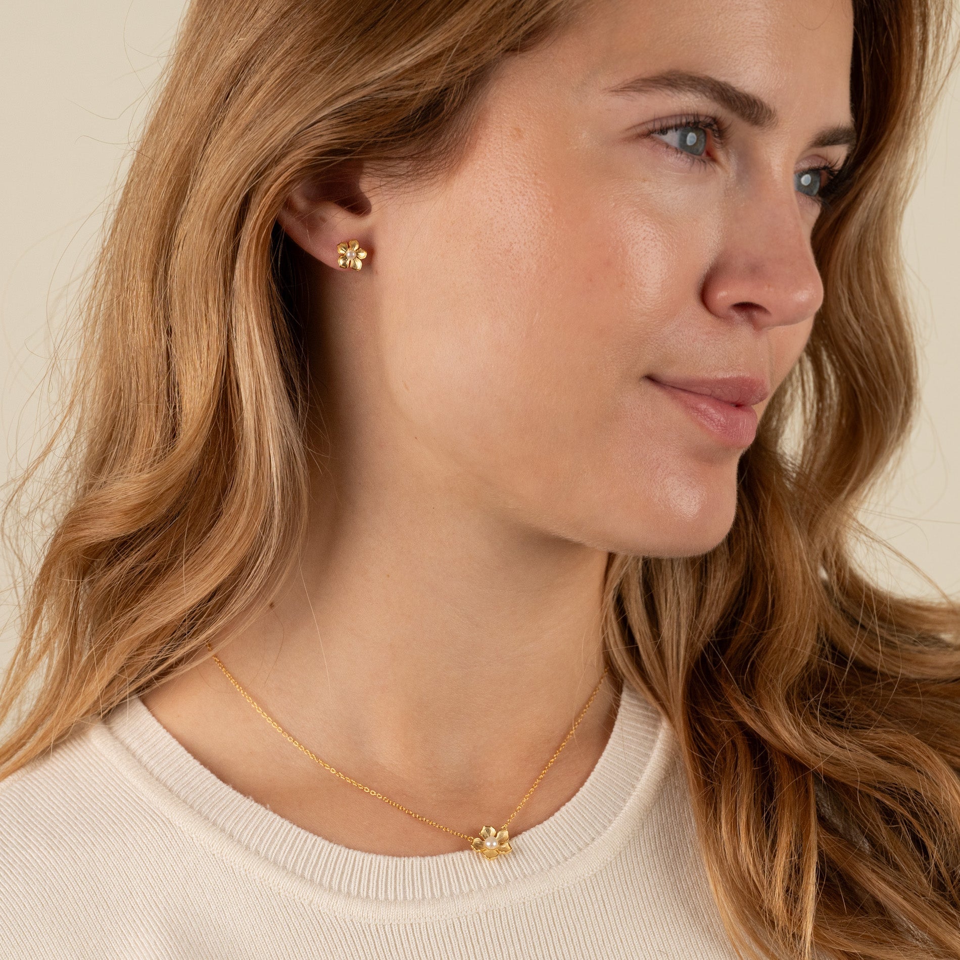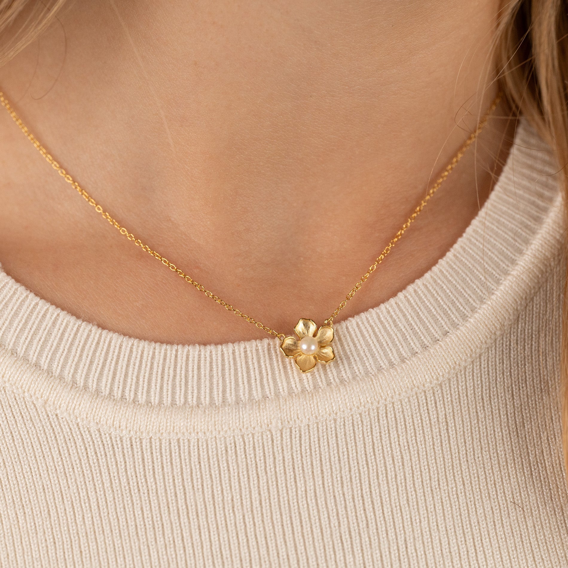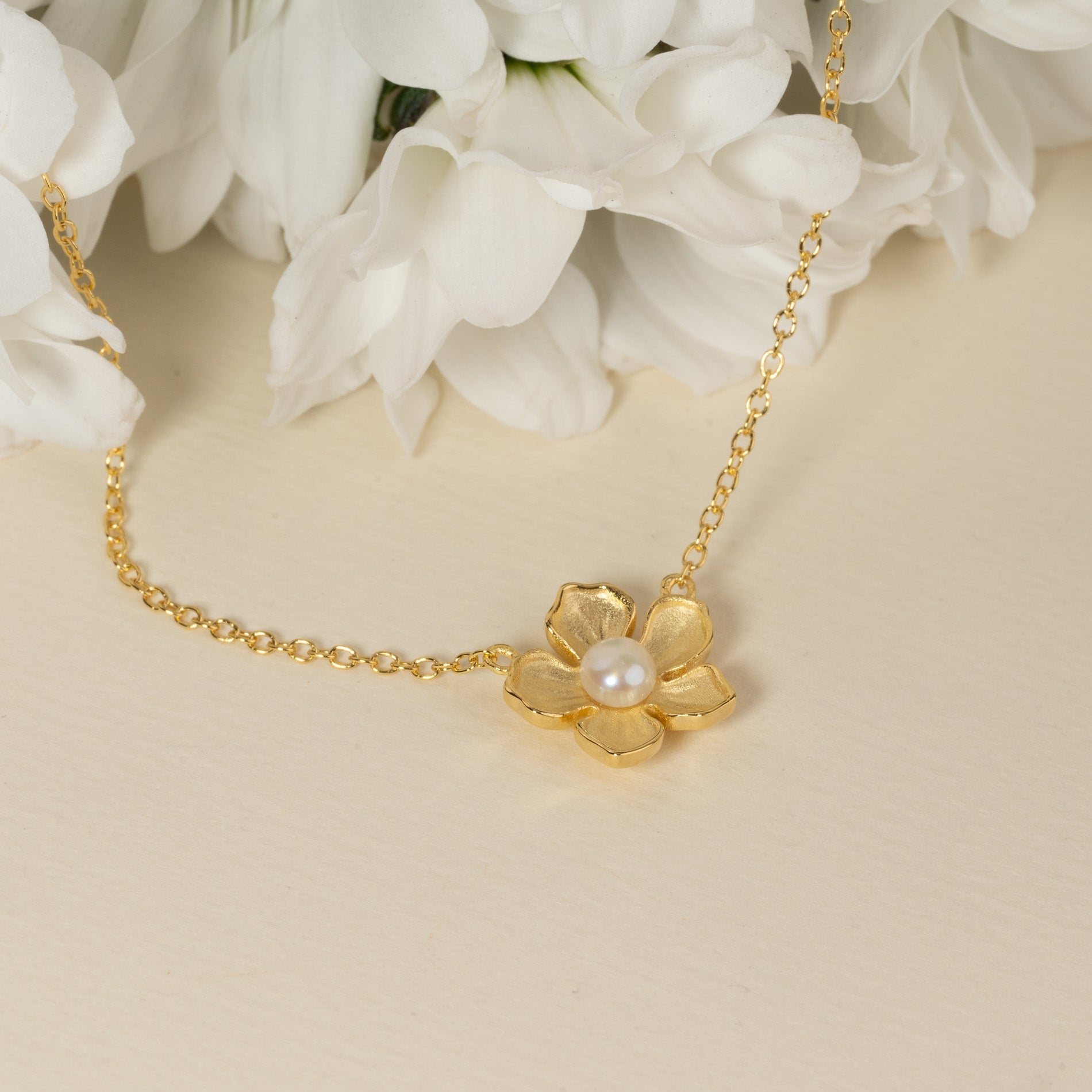 Necklace with a flower and freshwater pearl in gold-plated silver