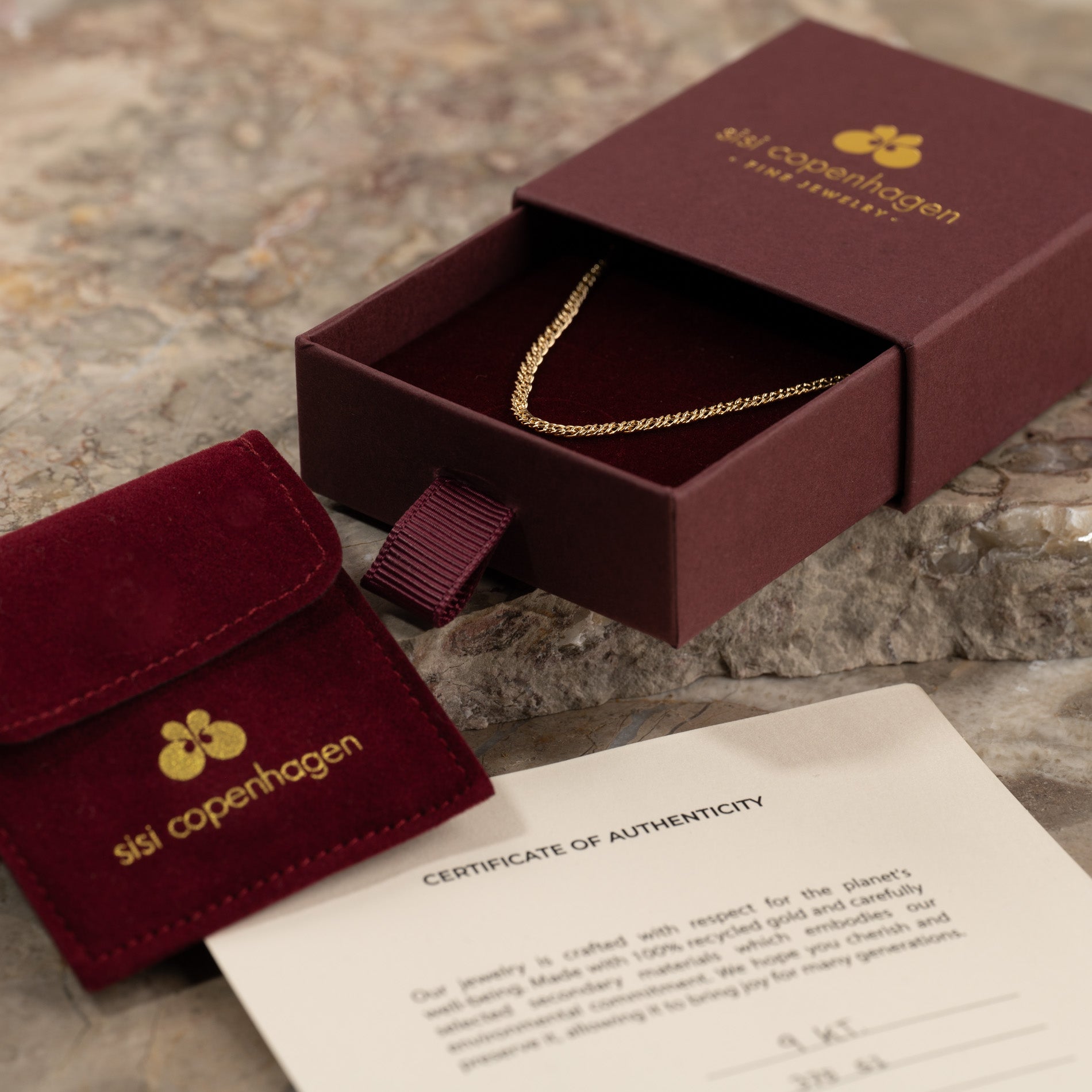 Additionally, you will receive a small jewelry pouch and a 'certificate of authenticity' that contains all the specifications for your new piece.