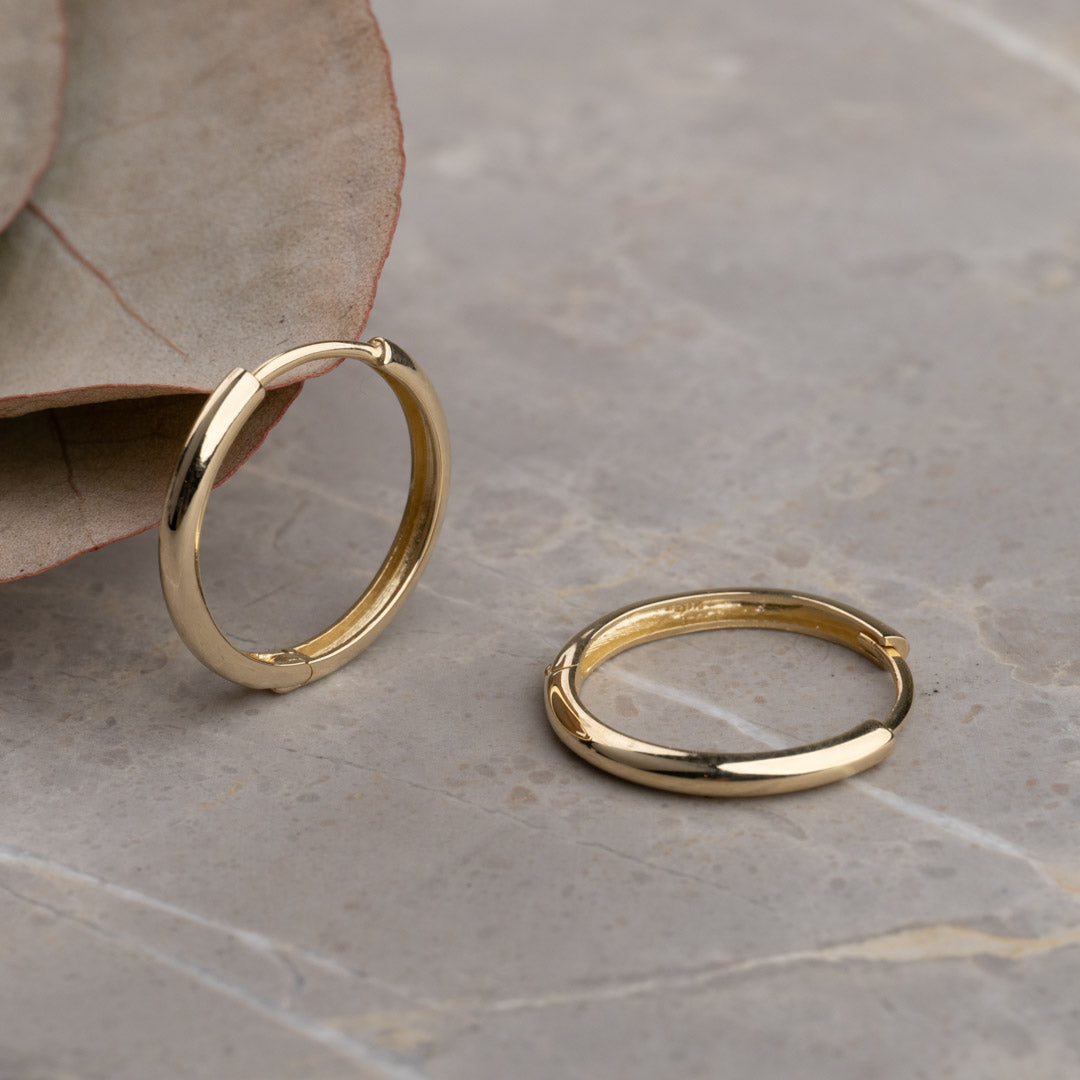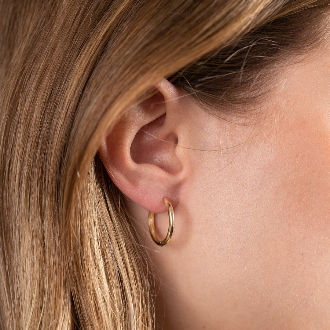 Our Nancy hoop earrings are crafted from 100% recycled 9-karat solid gold. These hoops are designed in the classic hoop style with a hinge and click-lock closure.