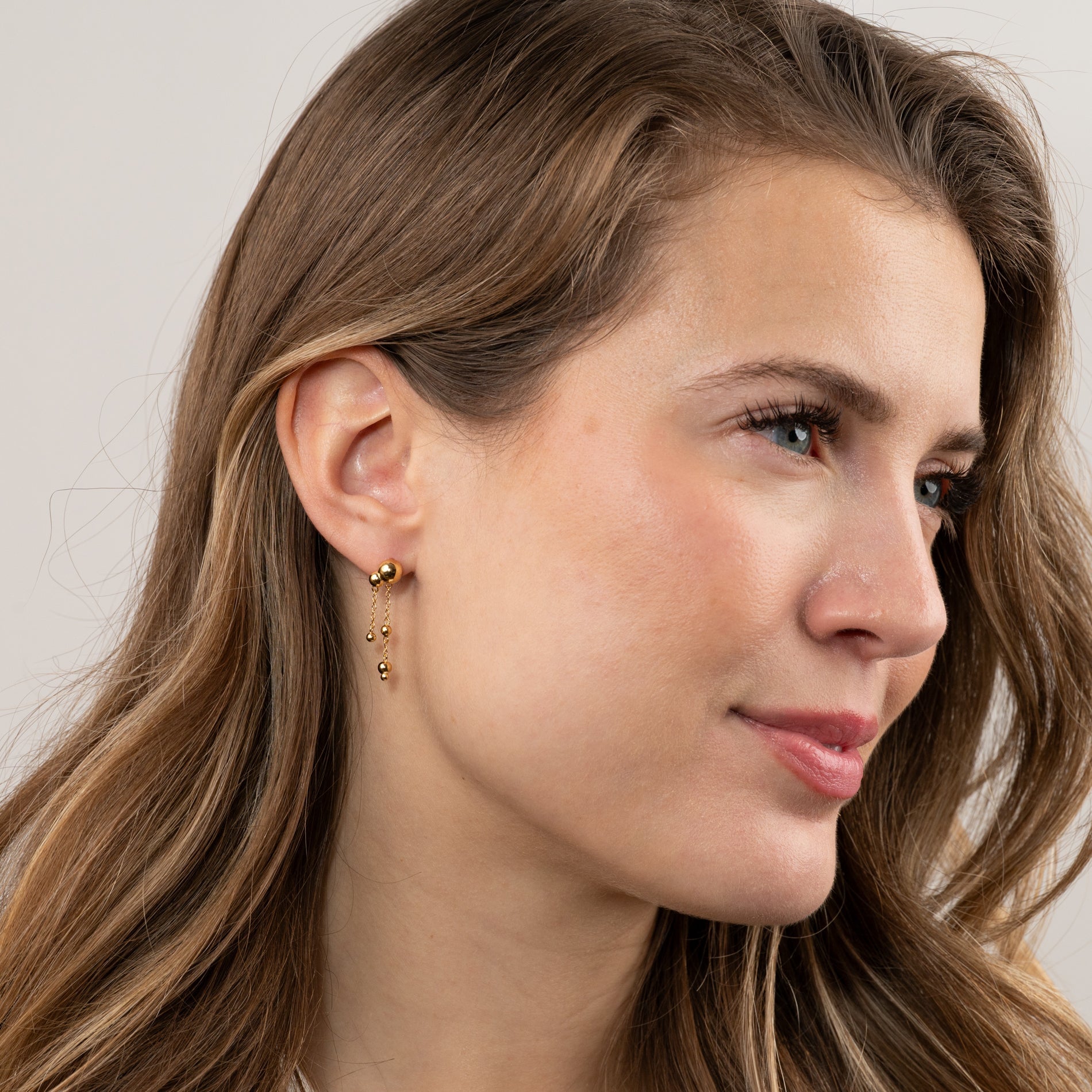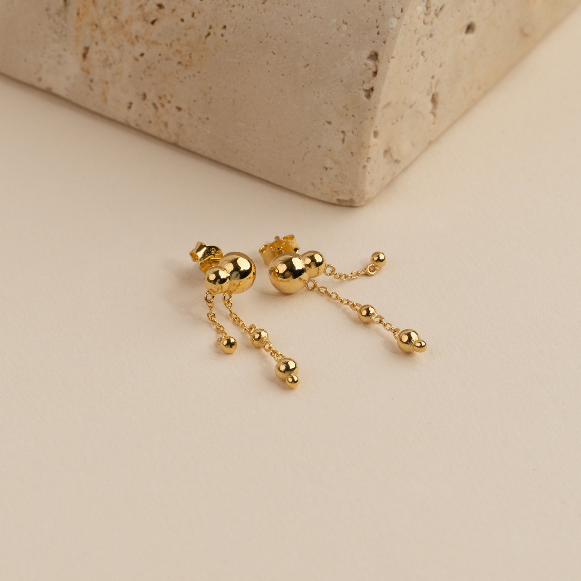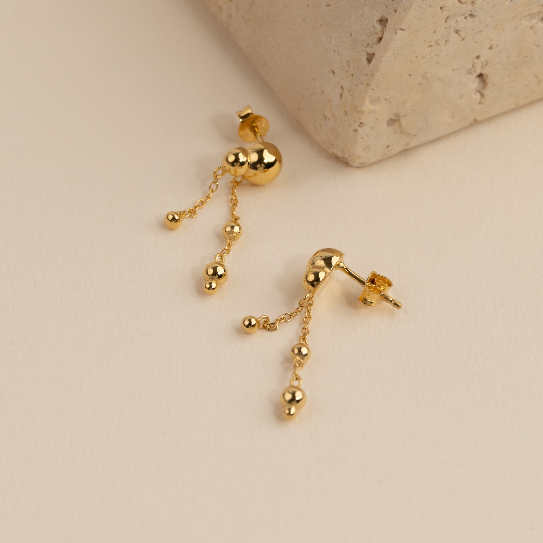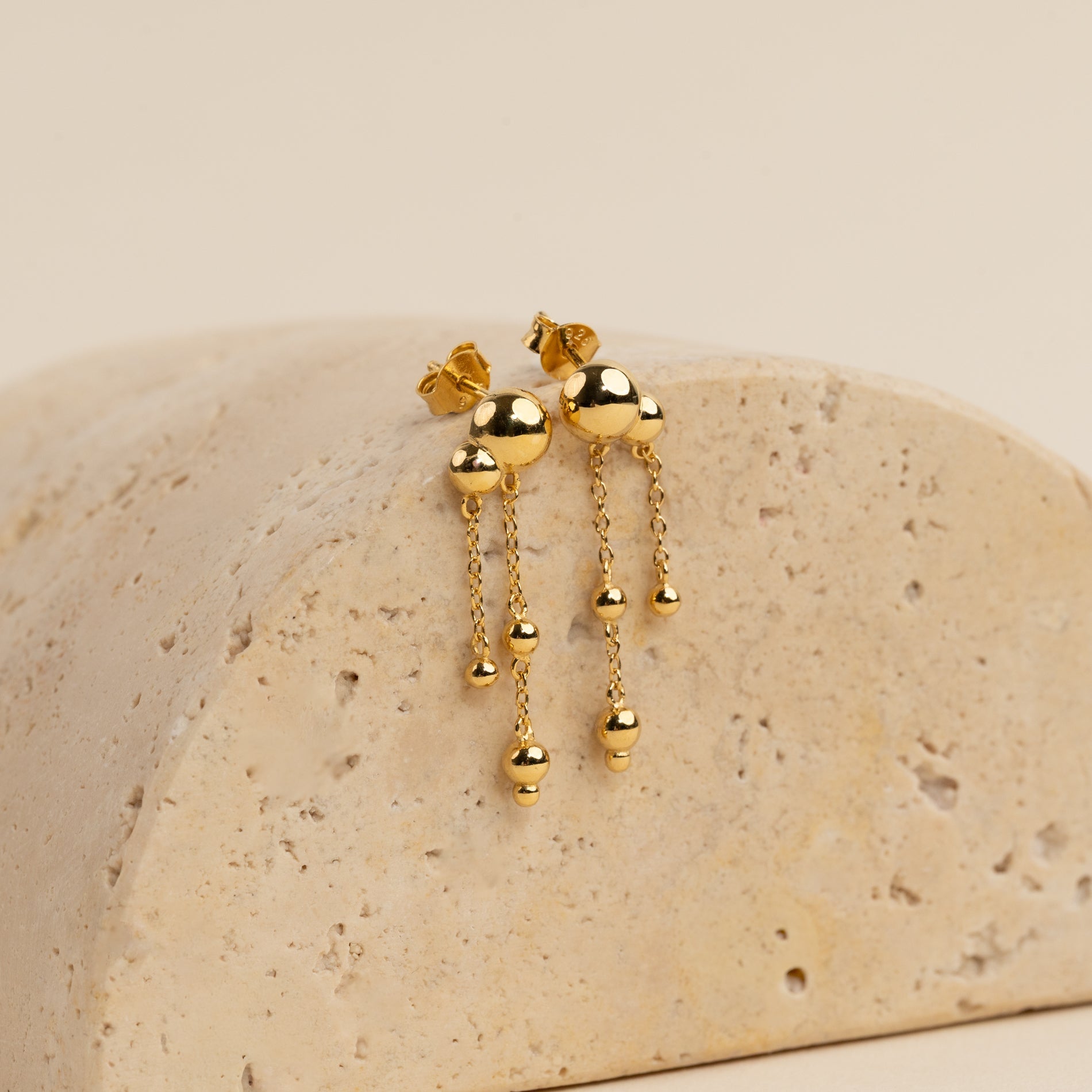 These elegant drop earrings have a modern and feminine design, with small spherical elements connected by delicate chains that move beautifully. The sculptural design gives the earrings a unique and eye-catching look.