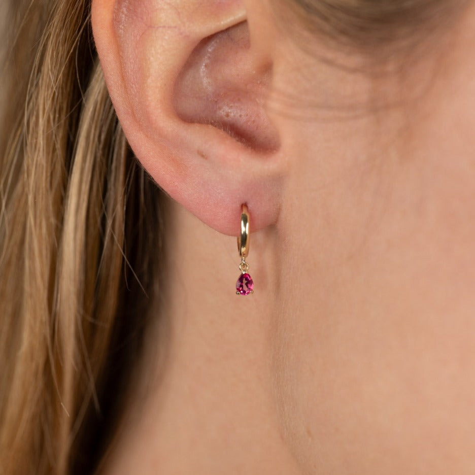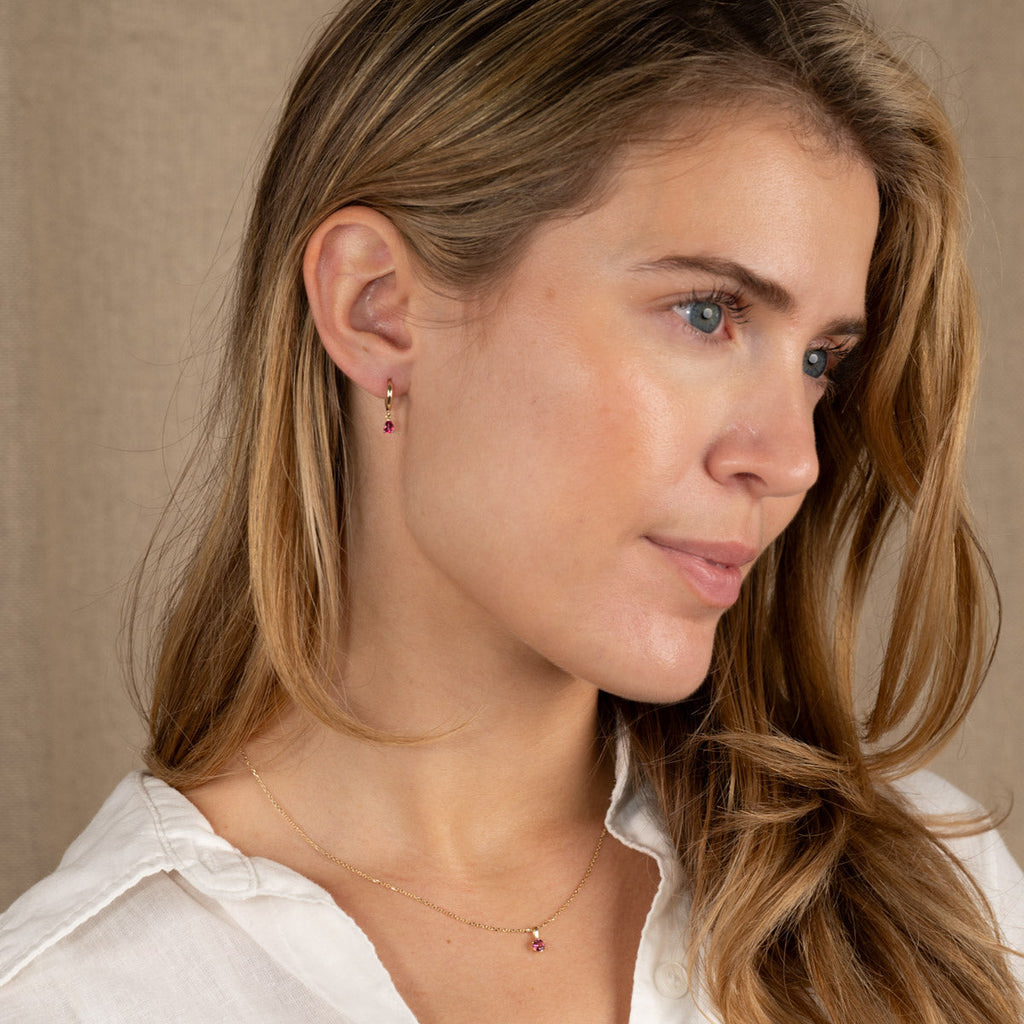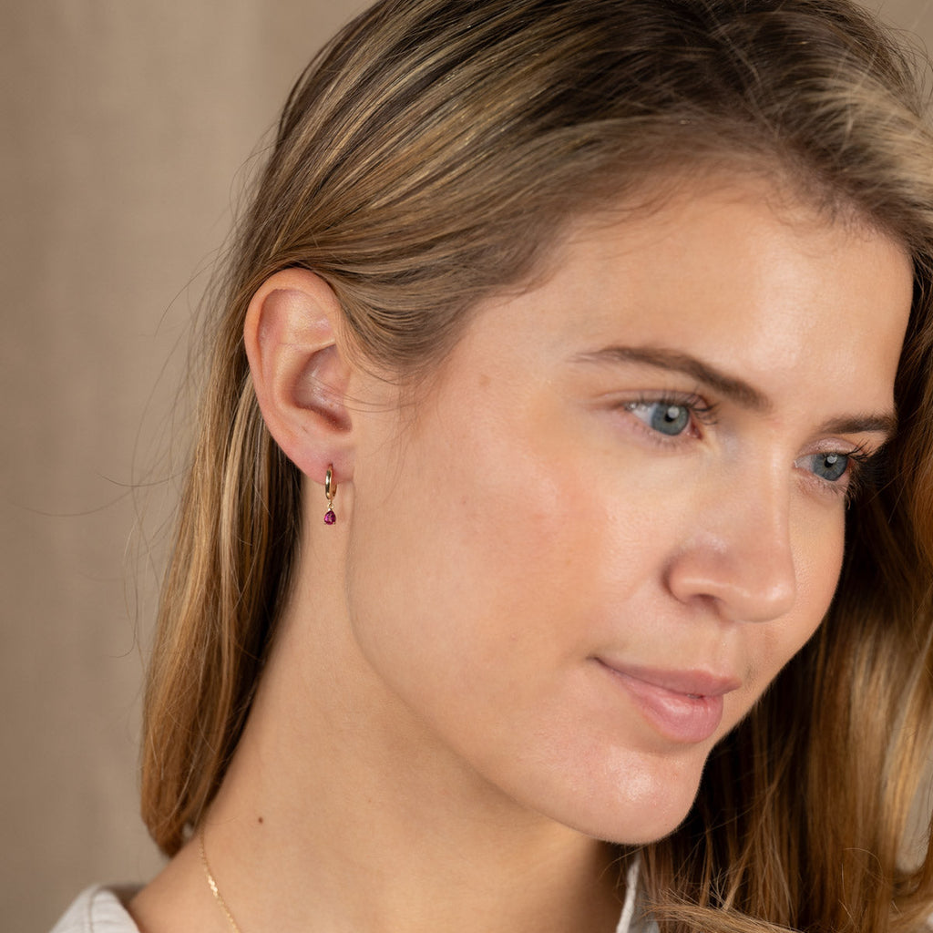 The earrings are made from 100% recycled 9 karat solid gold, with pendants set with a pink topaz. These delicate earrings are a timeless classic that suits both everyday wear and special occasions, and they can be worn alone or paired with other ear jewelry.