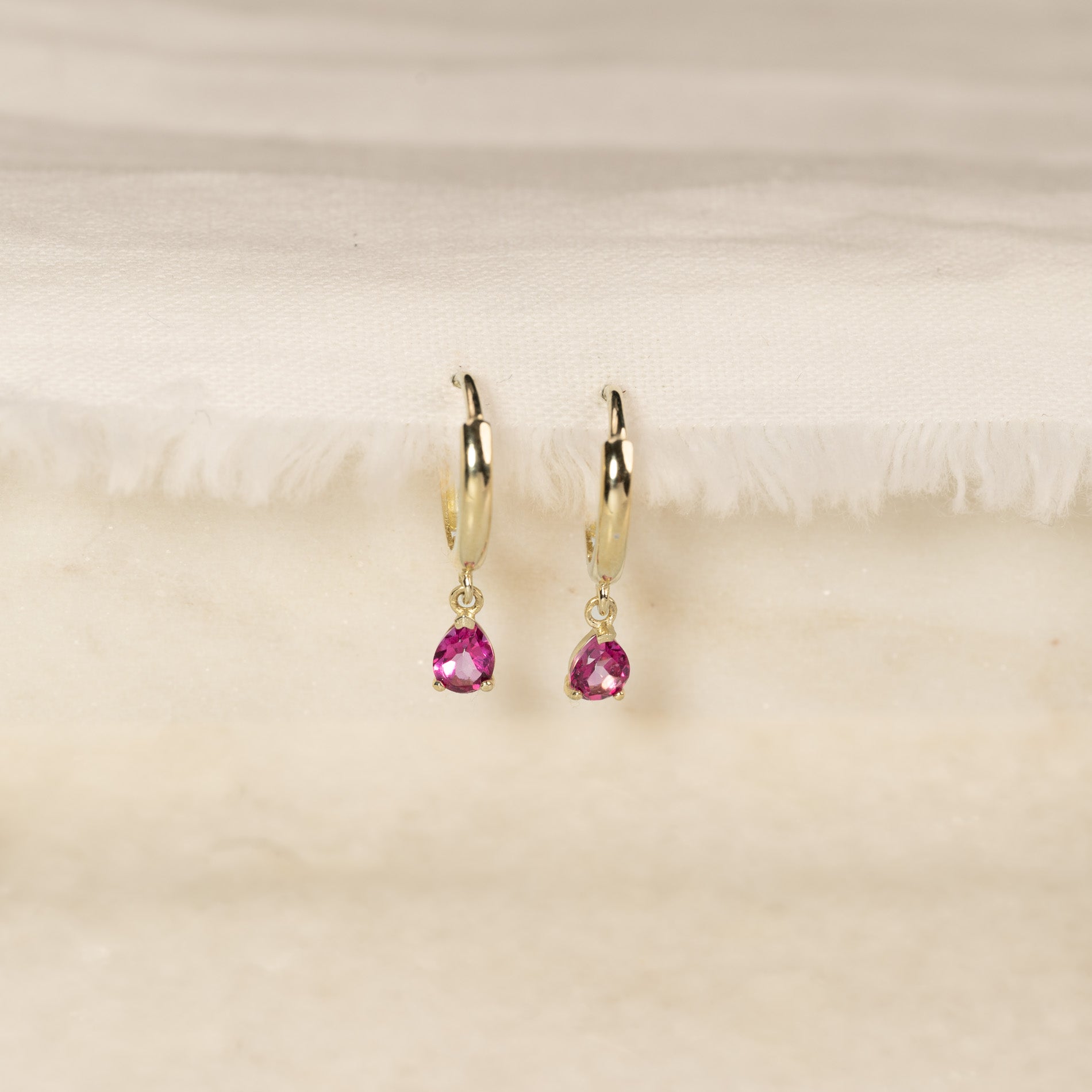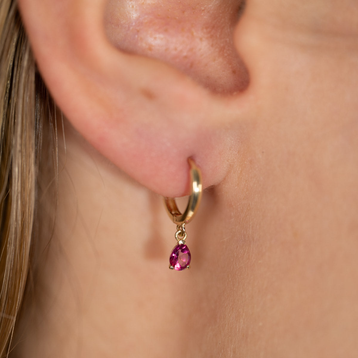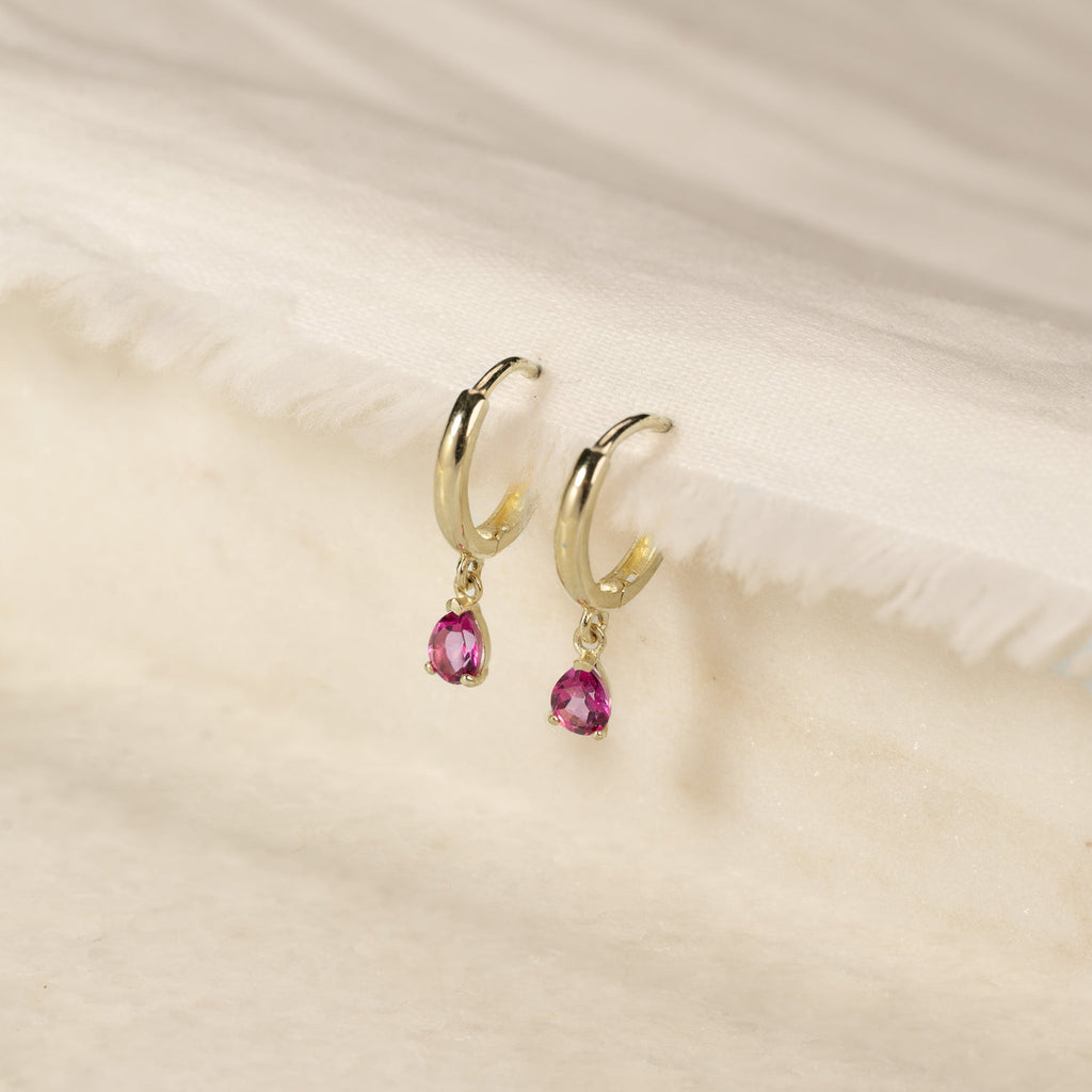 The earrings are made from 100% recycled 9 karat solid gold, with pendants set with a pink topaz. These delicate earrings are a timeless classic that suits both everyday wear and special occasions, and they can be worn alone or paired with other ear jewelry.