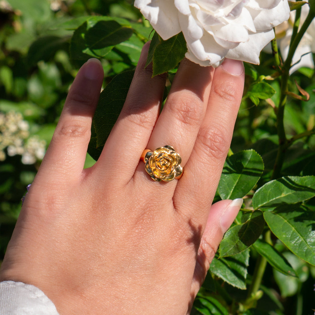 The ring features a detailed rose that rests elegantly across the finger. Soft, elegant petals give the ring a romantic and sculptural feel, making it an eye-catching statement piece that truly stands out.