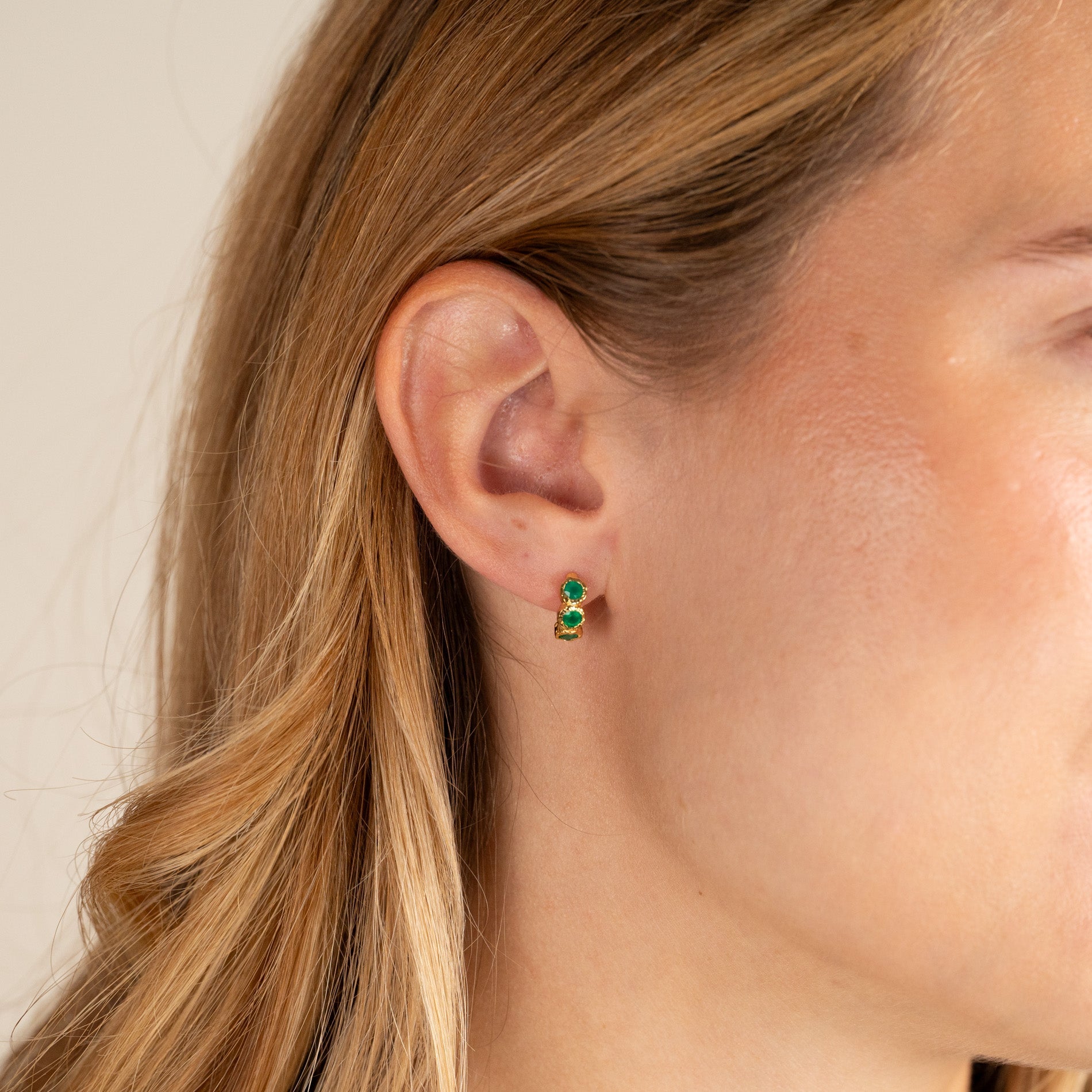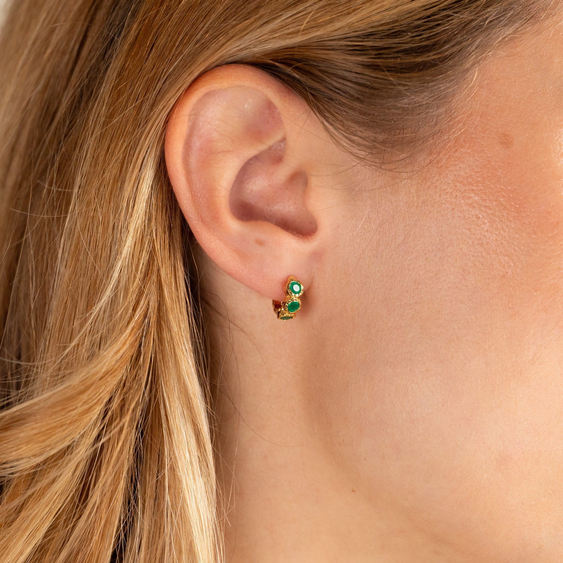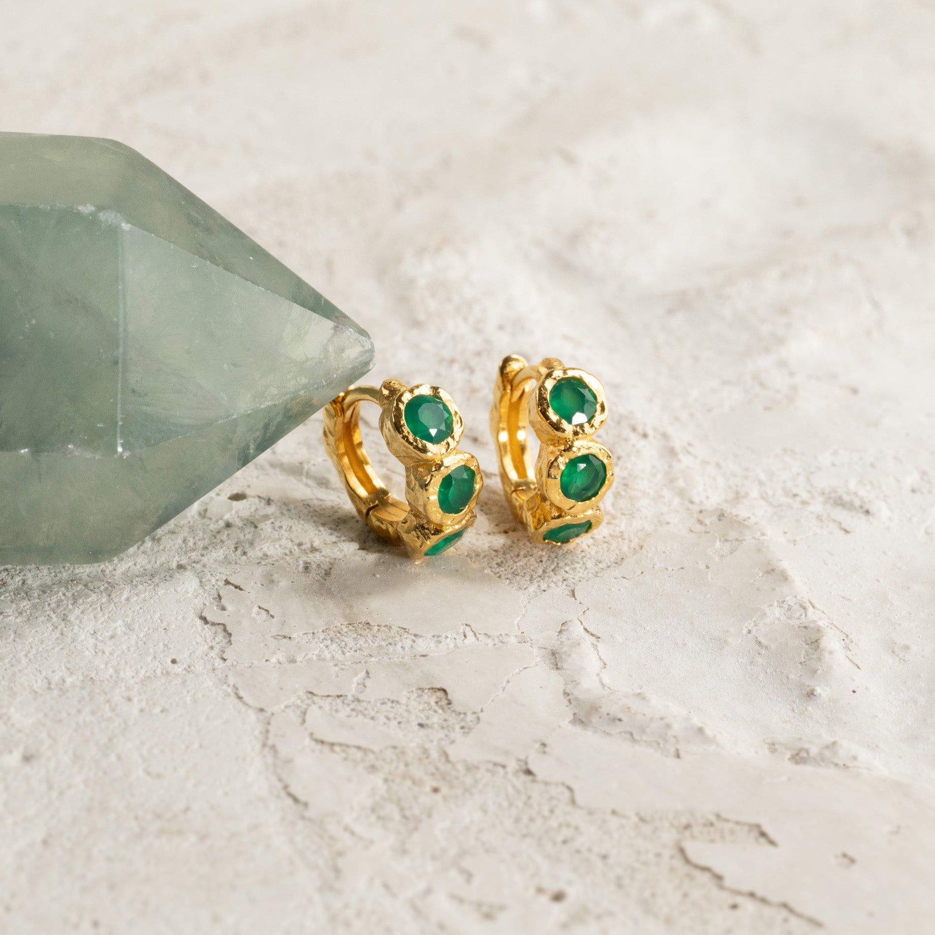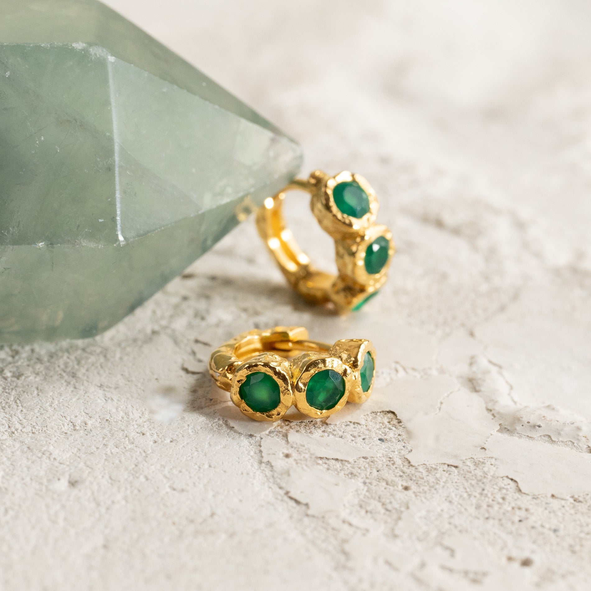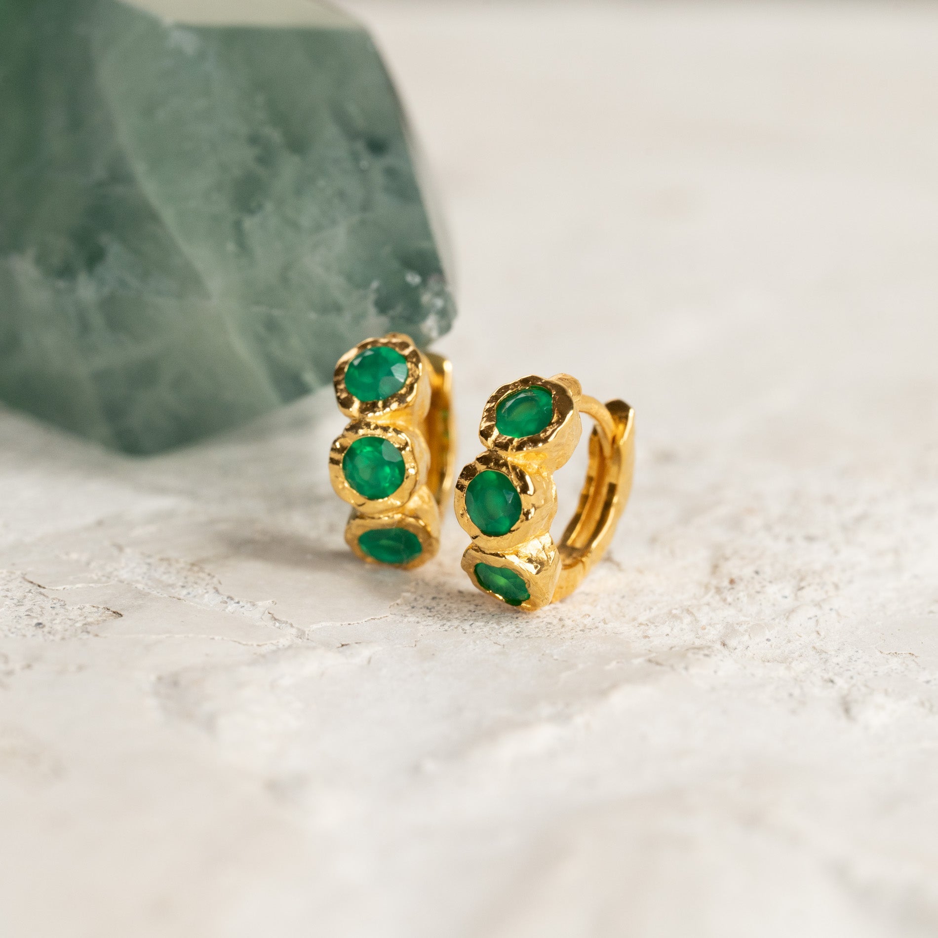 Gold-plated huggies with three faceted green agate stones in a raw design