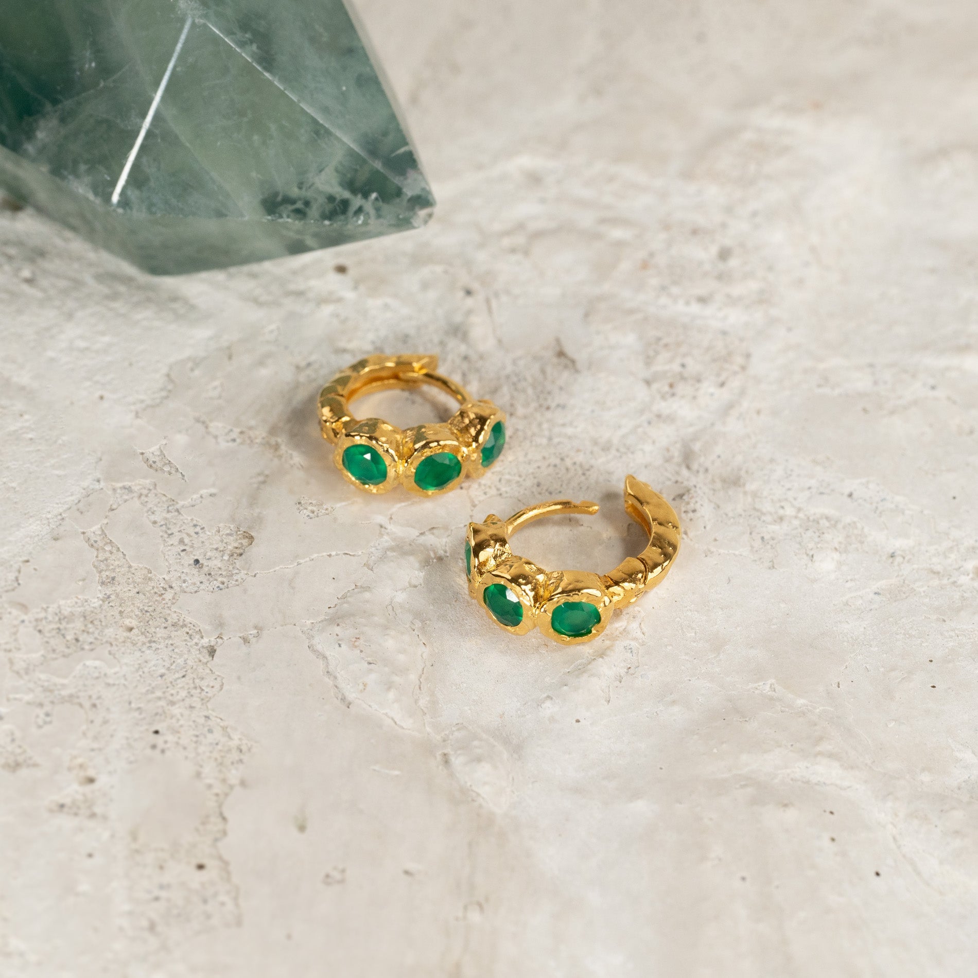 Huggies in 100% recycled 18 karat gold-plated sterling silver with three round green agate stones each. The earring have a melted surface – inspired by melted metal.