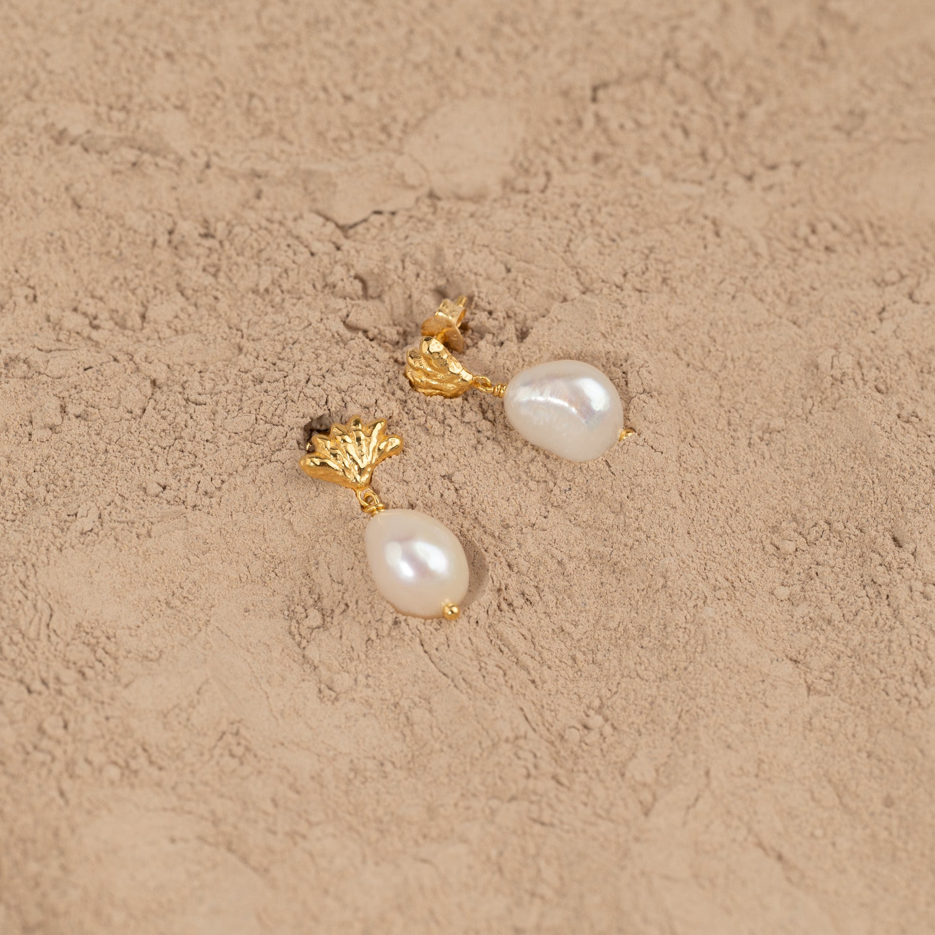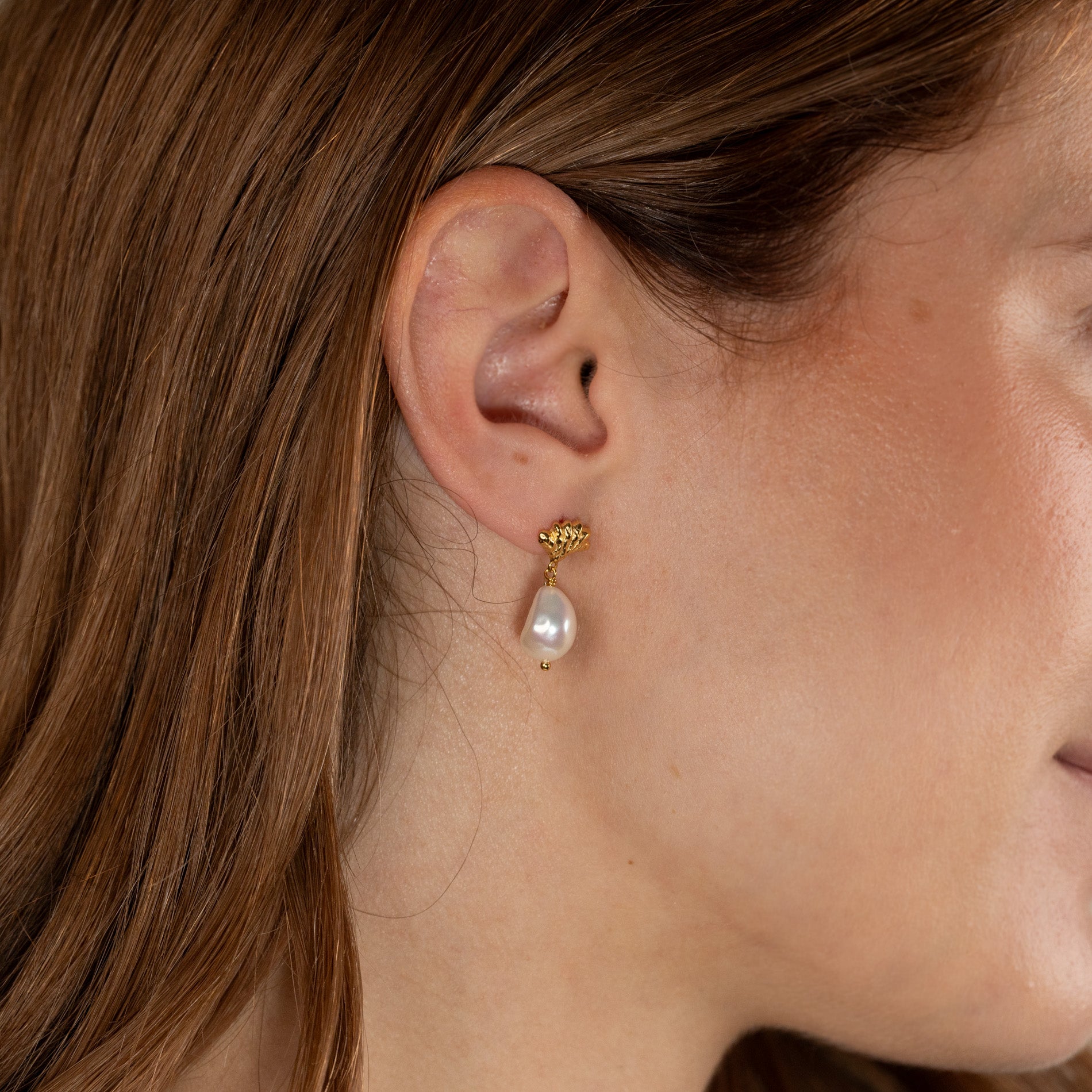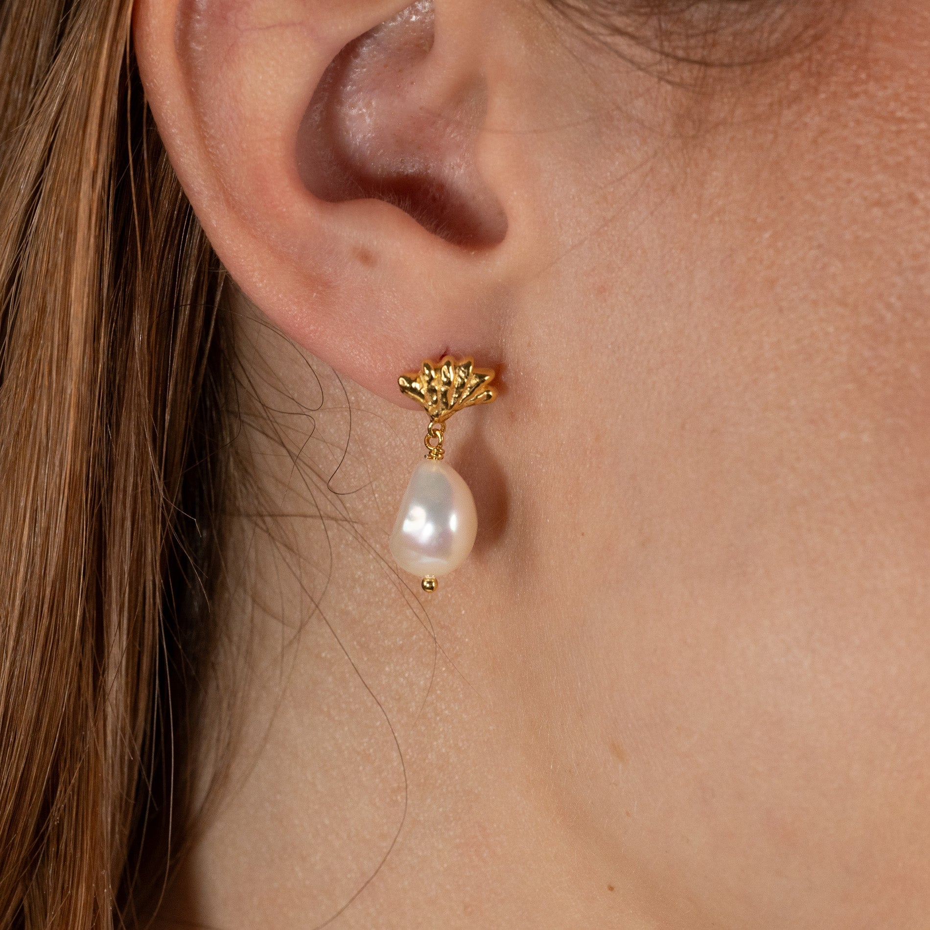 Our Shelly earrings are made from 100% recycled 18-carat gold-plated 925 sterling silver with baroque freshwater pearls.