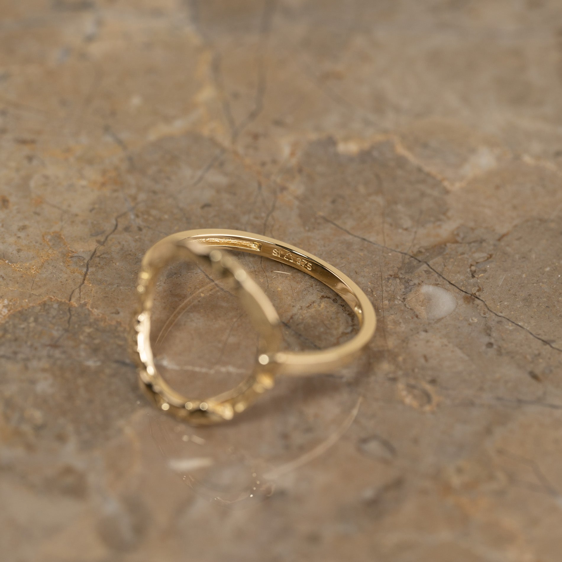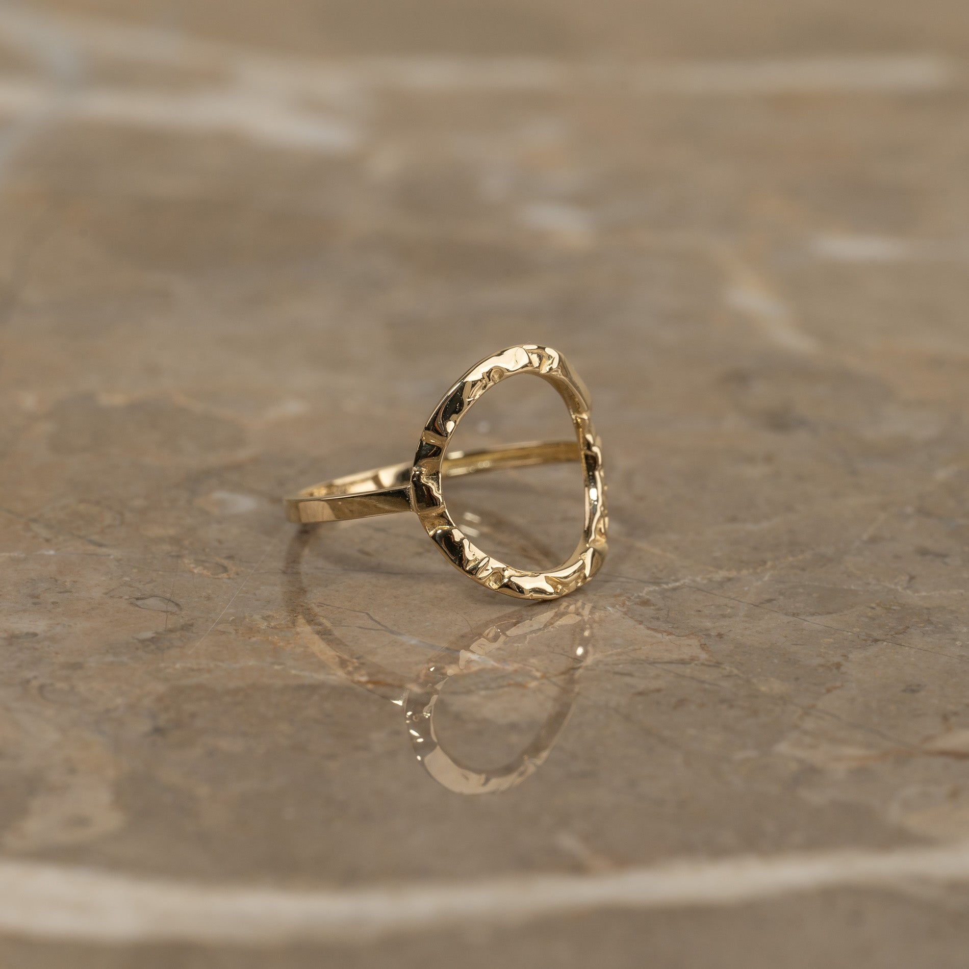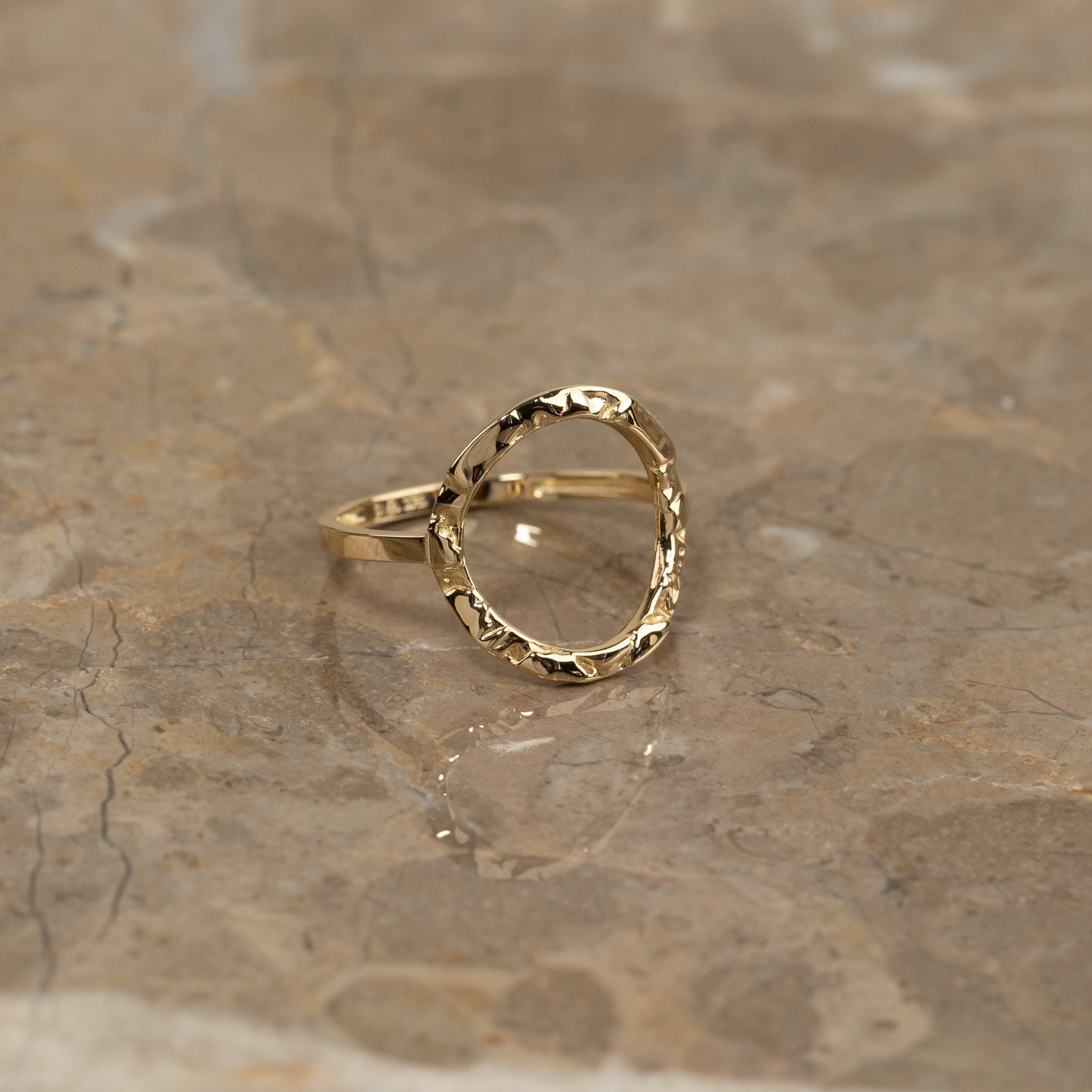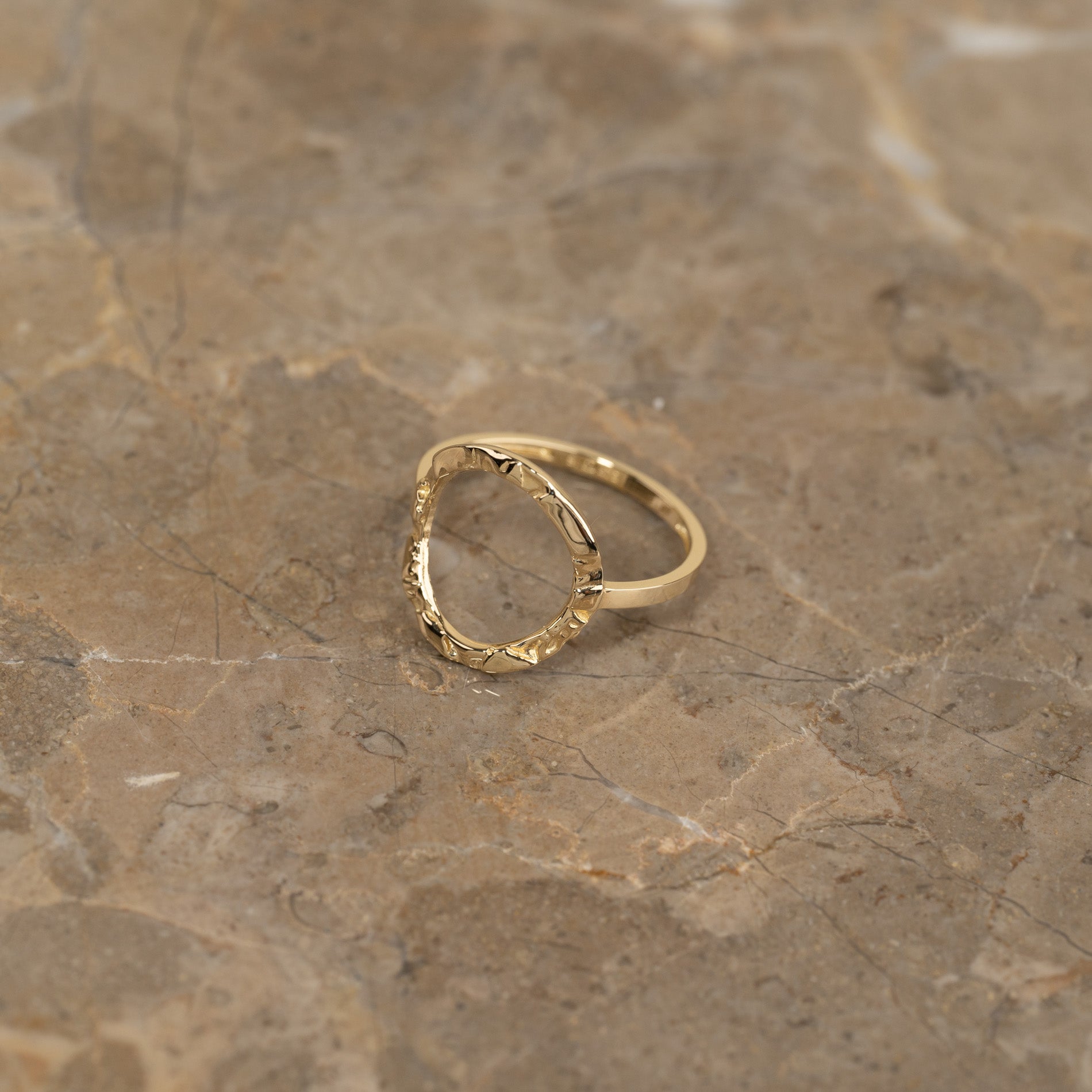 The ring is crafted from 100% recycled solid 9kt. gold. It features an open circle that elegantly wraps over the top of the finger. It has a 'molten' surface, inspired by raw melted metal.