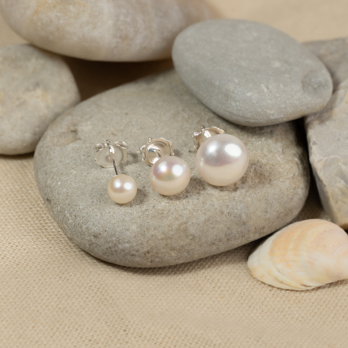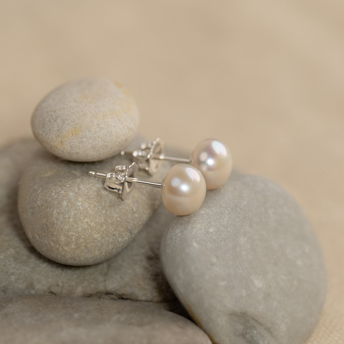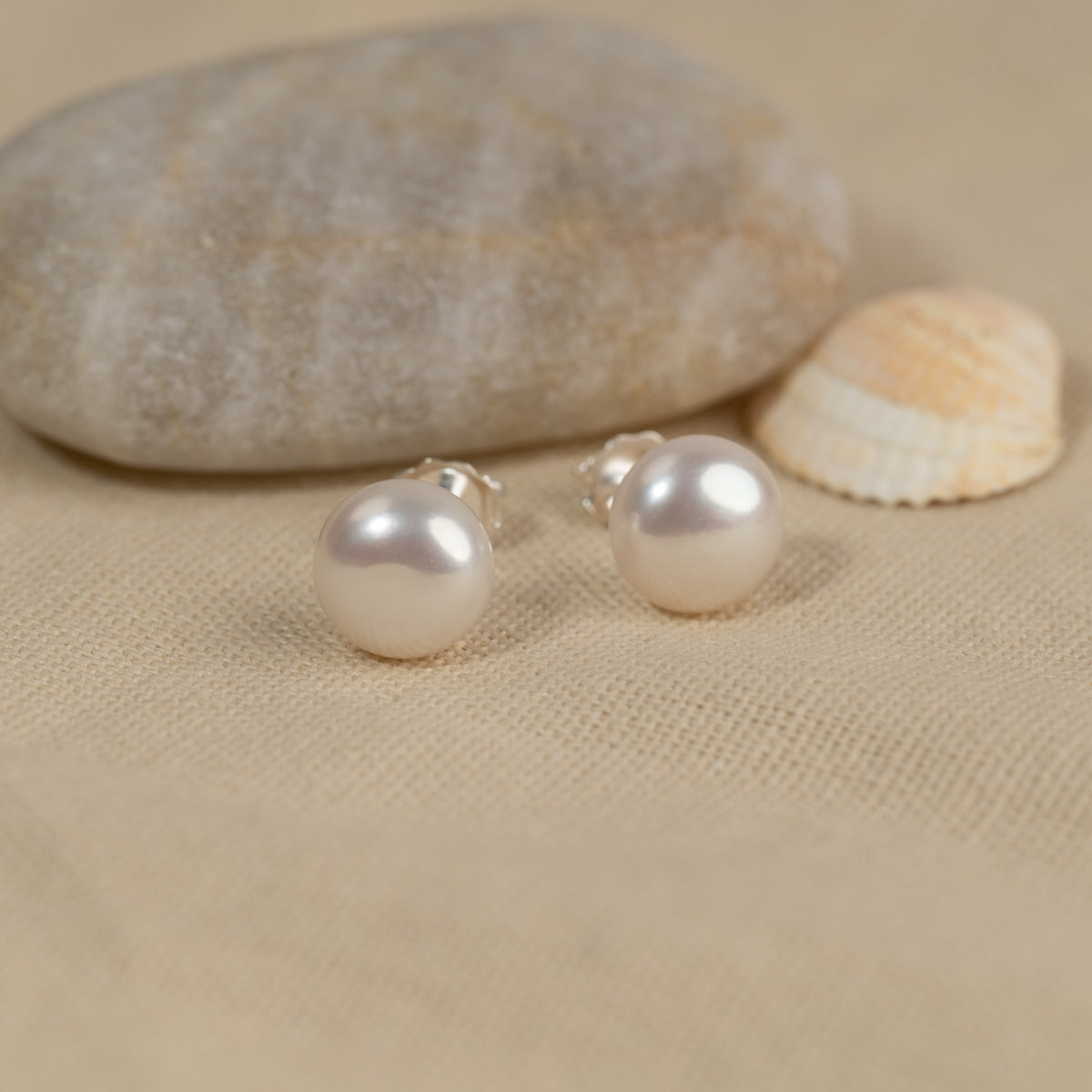 These elegant pearl earrings are made of 100% recycled 925 sterling silver, with white 'button' cultured freshwater pearls. You can choose the pearl earrings in 5mm, 7mm, or 10mm sizes.