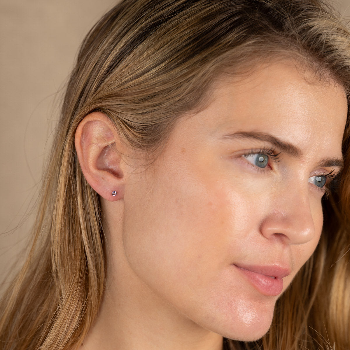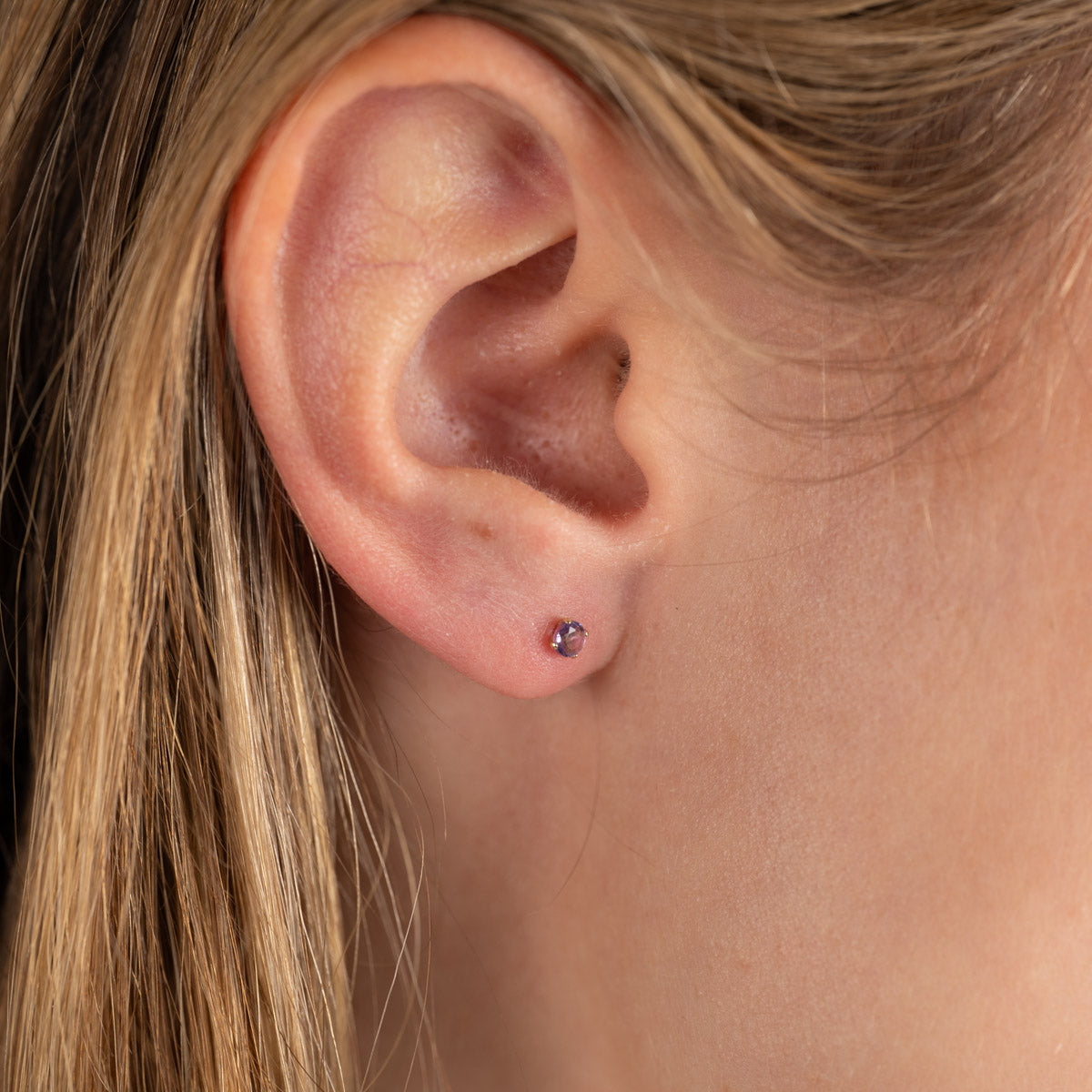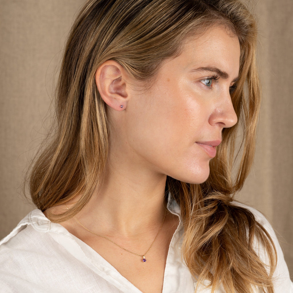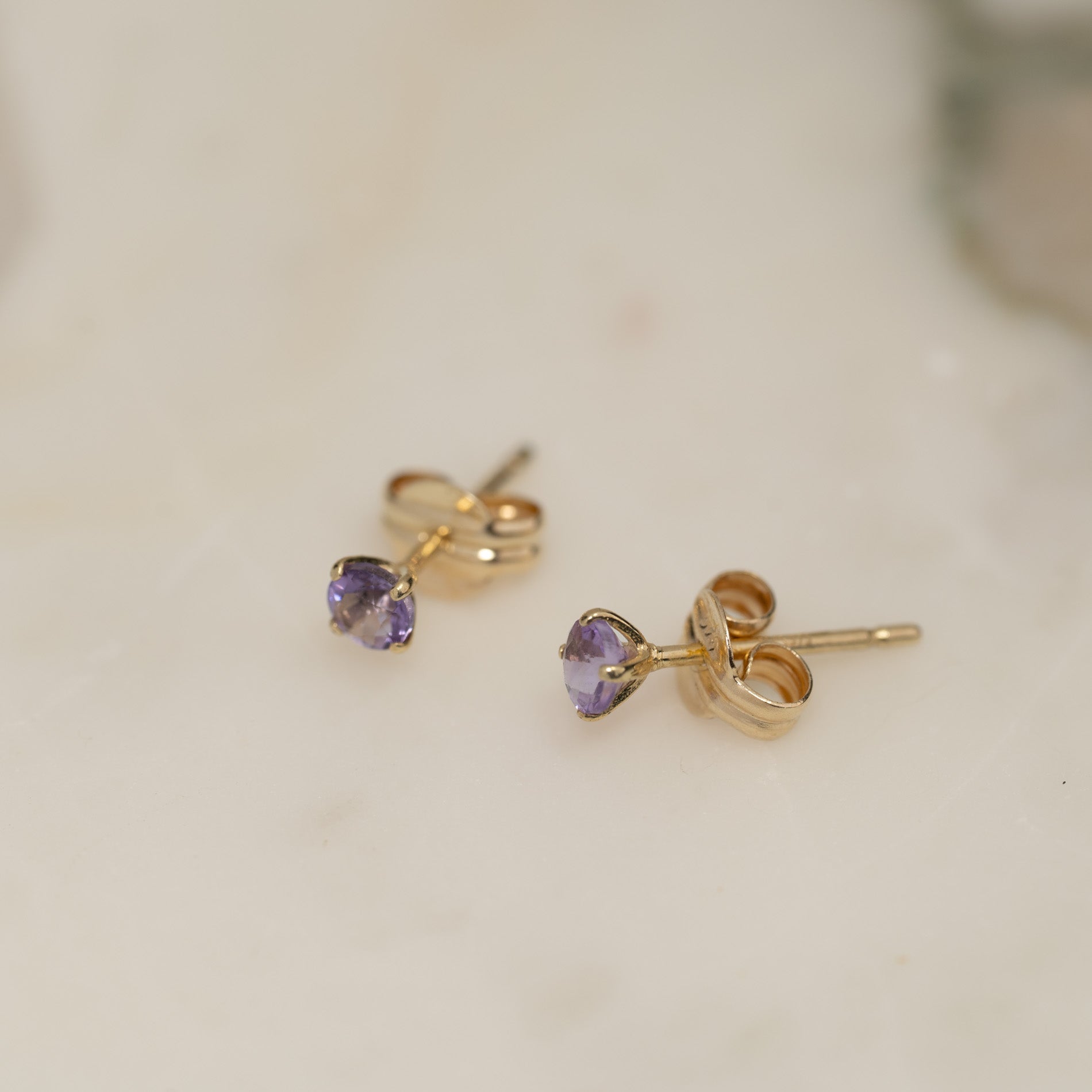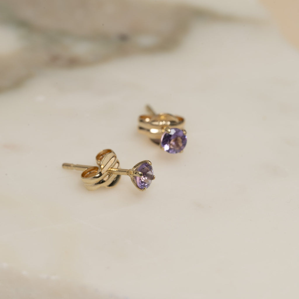 These earrings are made from 100% recycled 9 karat solid gold. These earrings are fine and classic, featuring a 3mm faceted purple amethyst set in a classic prong setting.