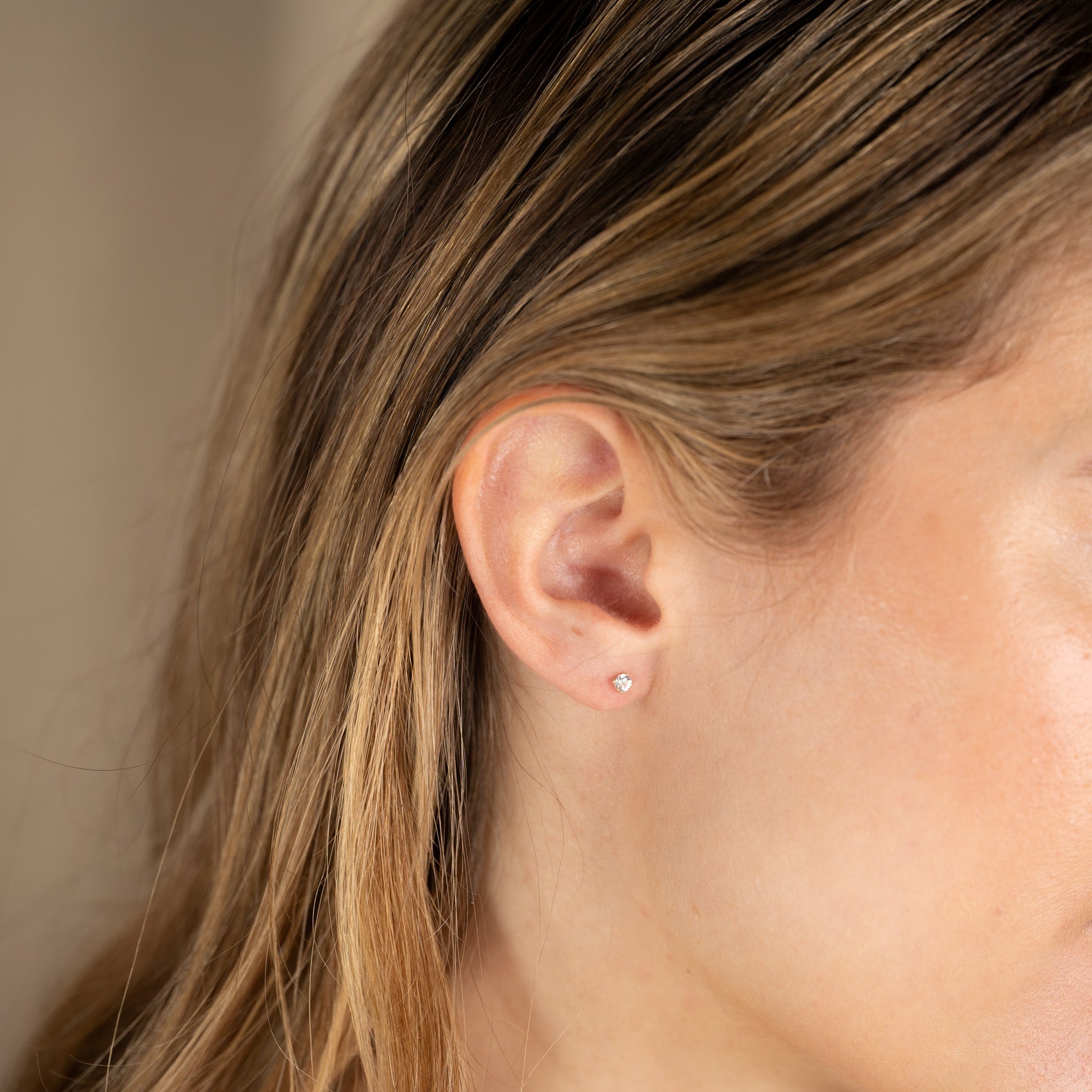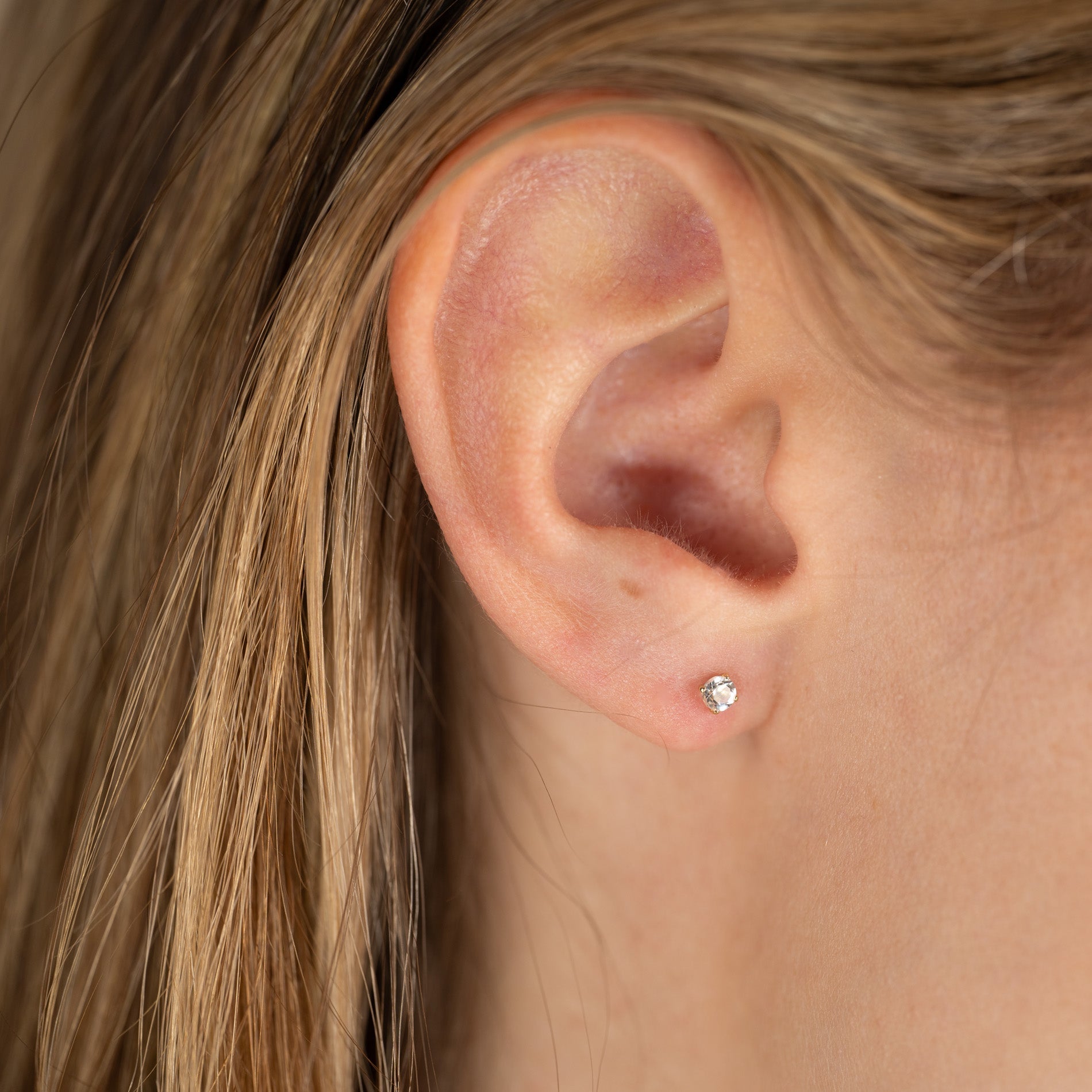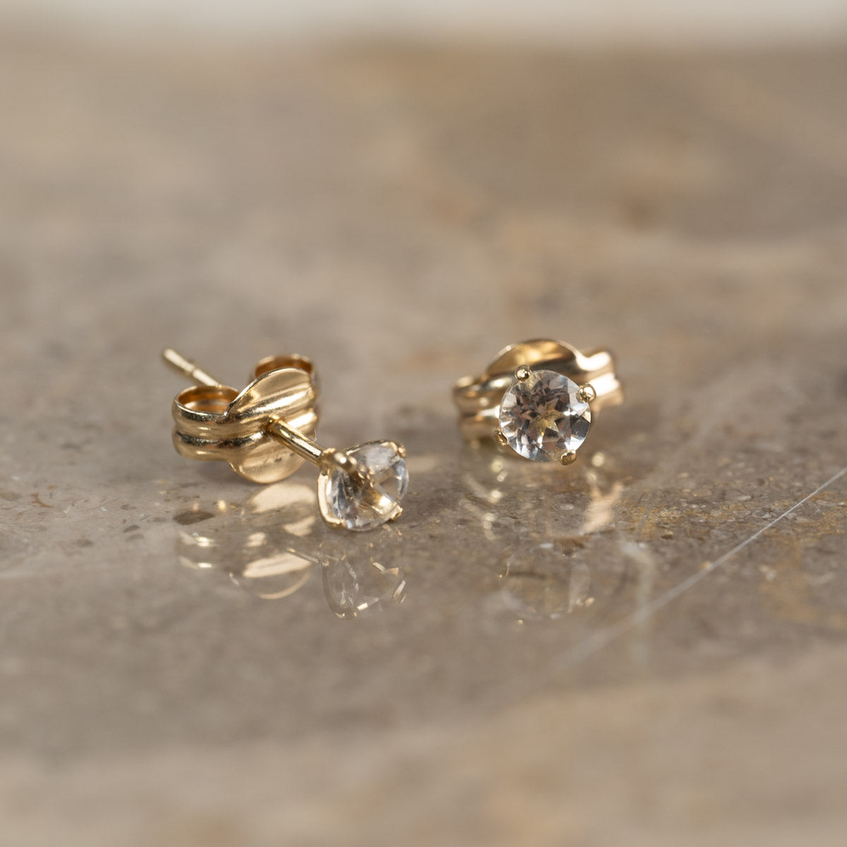 These earrings are made from 100% recycled 9 karat solid gold. These earrings are fine and classic with a faceted white topaz gemstone set in a classic prong setting. The stone has a diameter of 3mm.