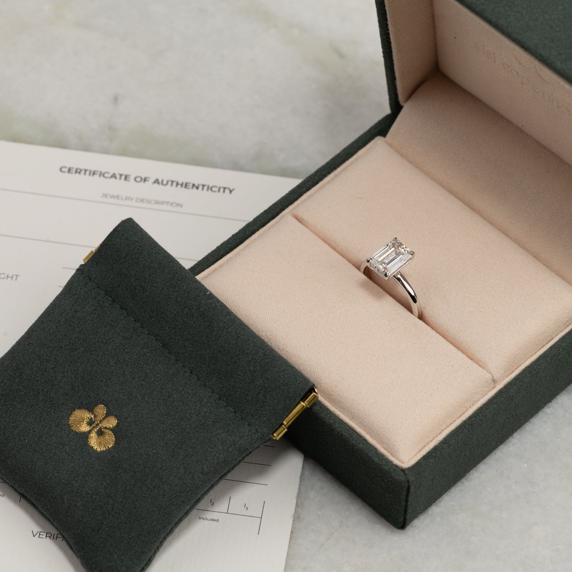The ring is delivered in our exclusive Diamond Collection box, which includes a jewelry case, a certificate and a travel pouch.