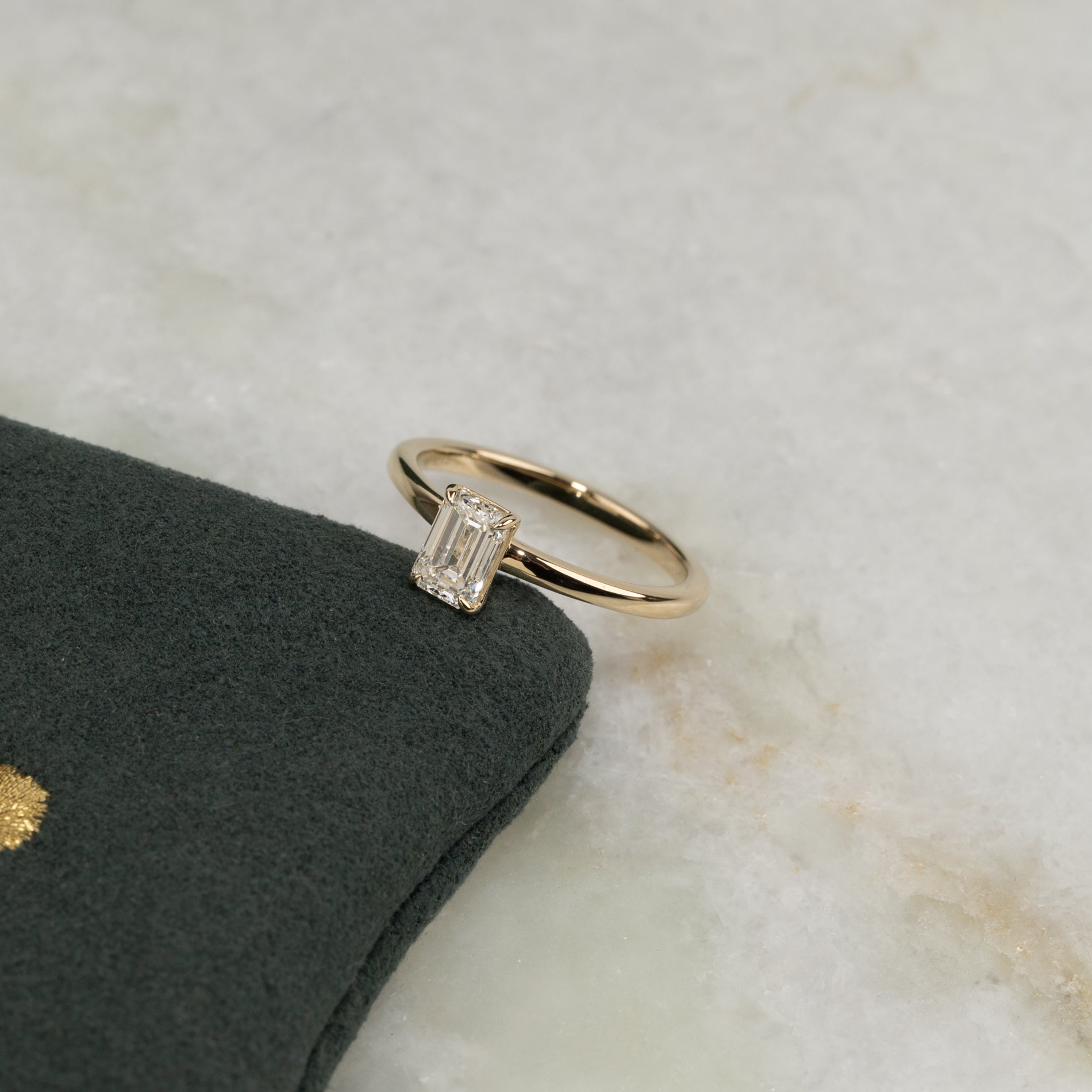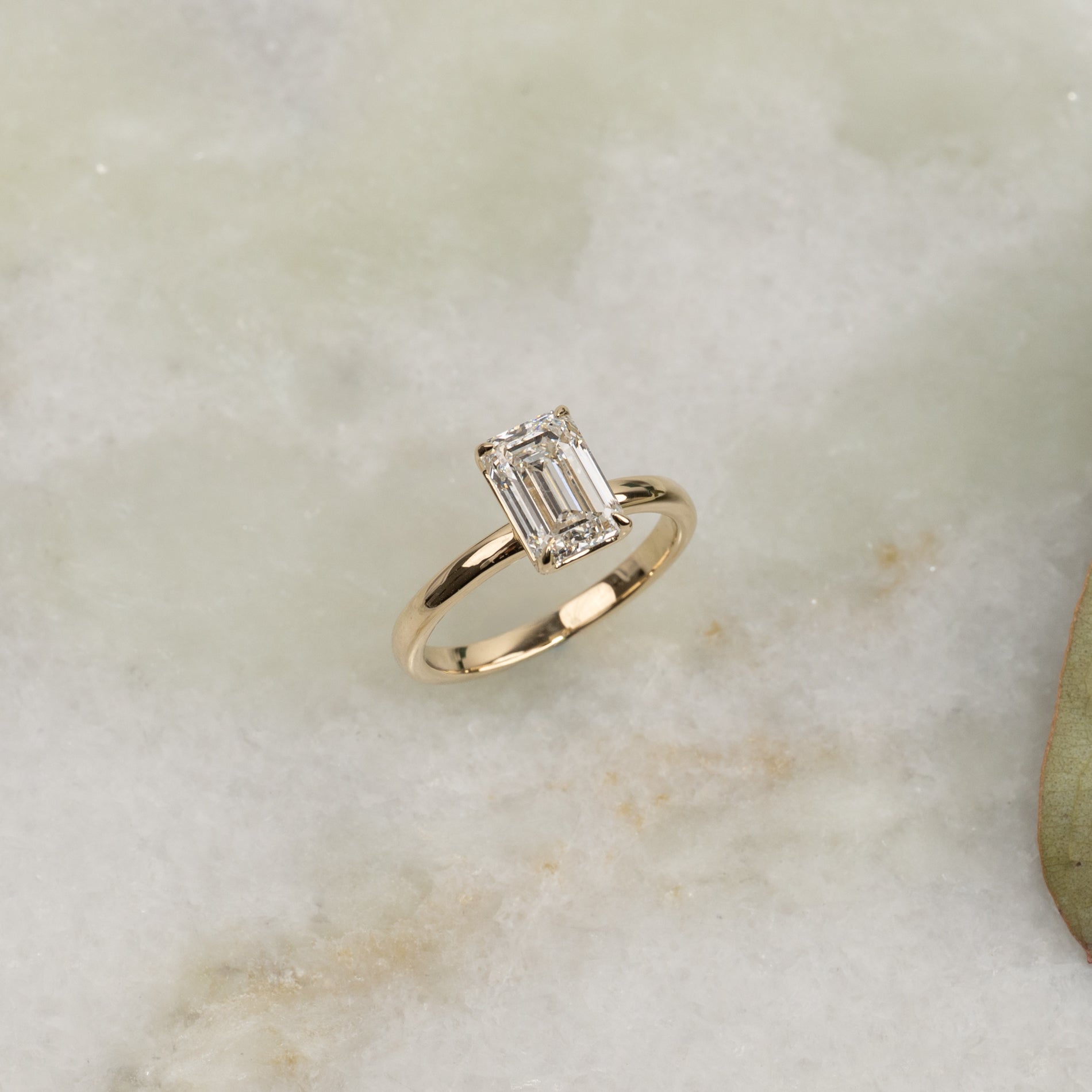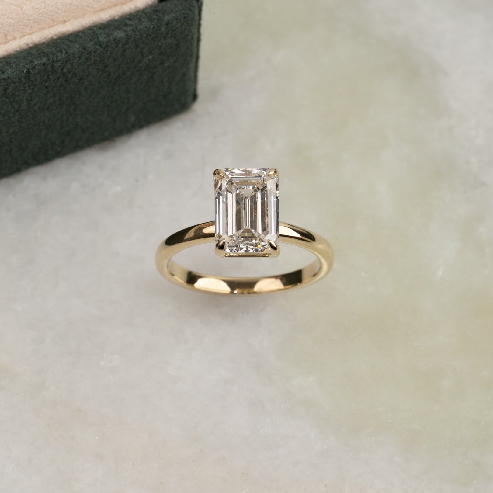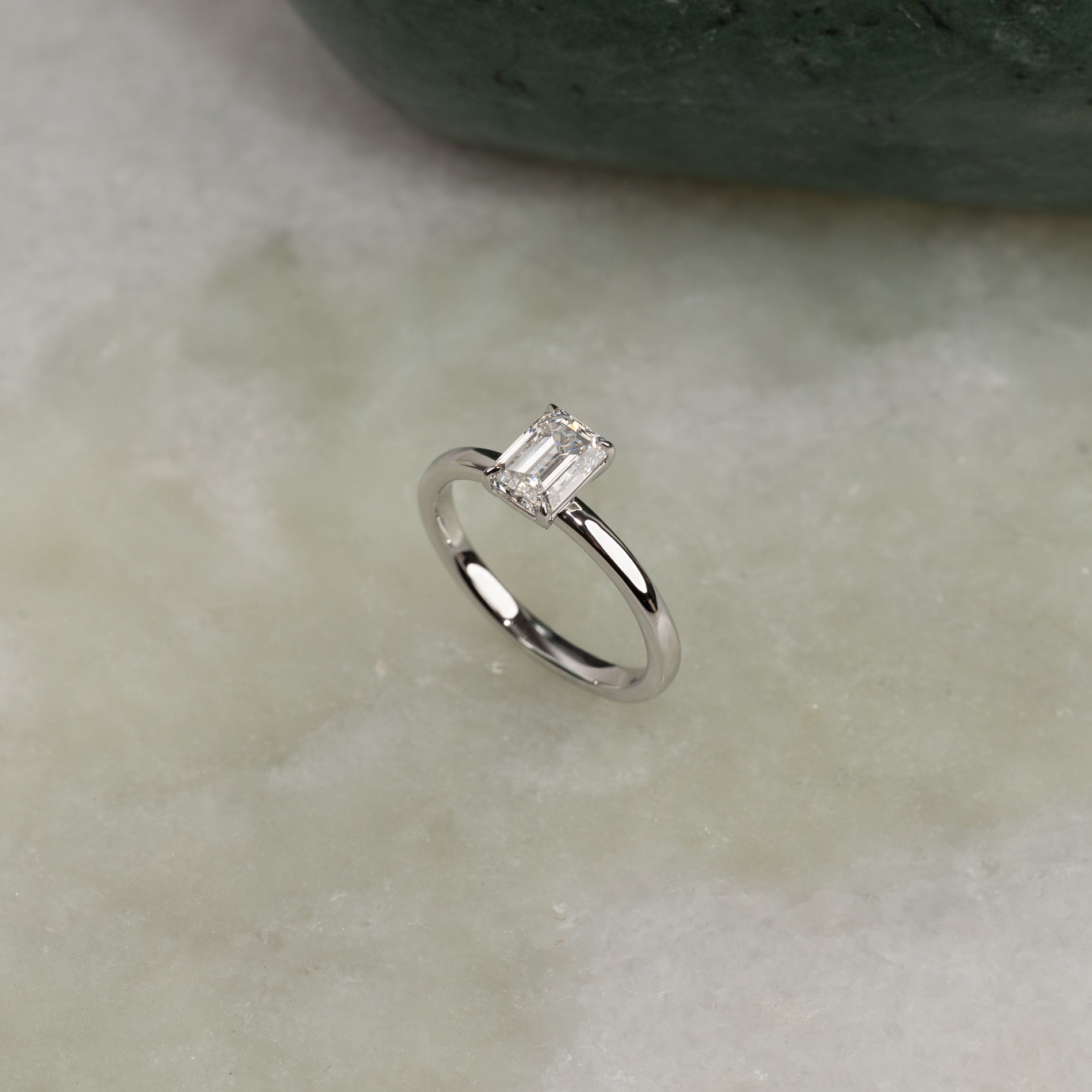 Timeless ring with an emerald-cut lab-grown diamond. The diamond is elegantly set in a slightly elevated basket setting, enhancing its clear, mirror-like brilliance and the step-cut facets.
