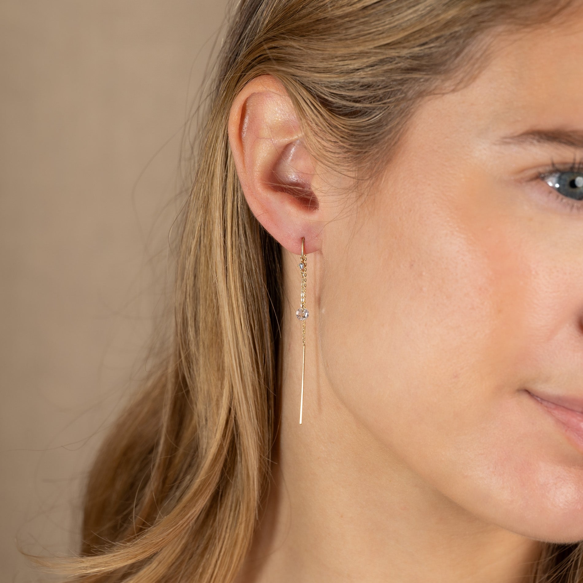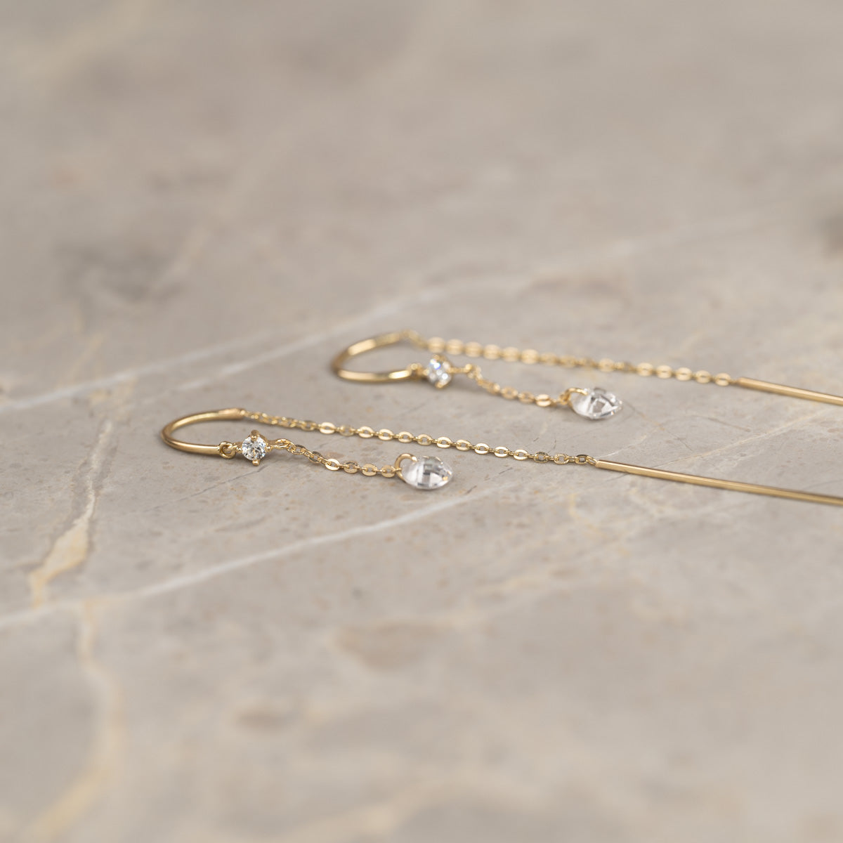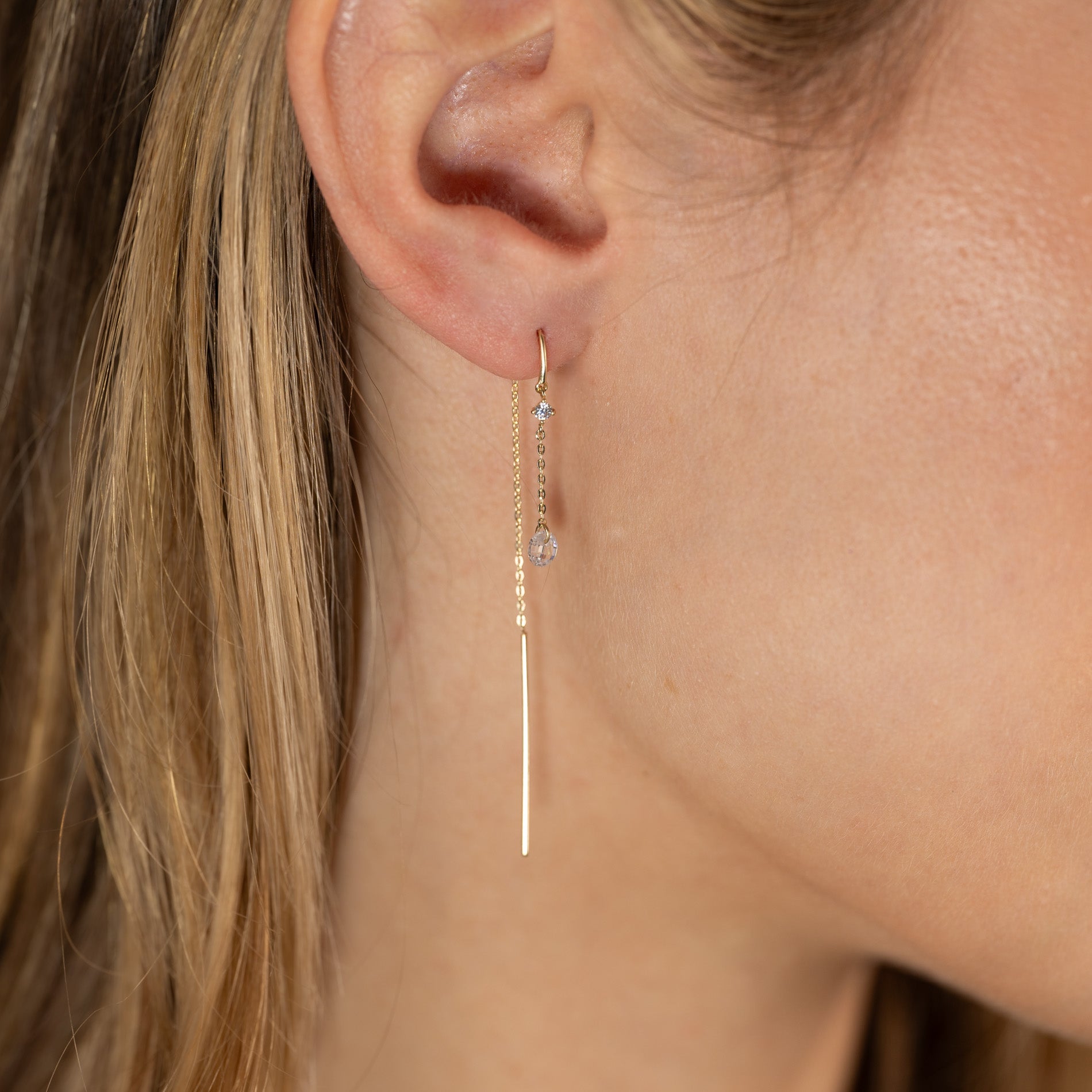 The earrings are designed with a hoop and a fine thin chain that is threaded through the ear until the earring hangs like an ear hook. Each earring has two white zirconia in two different sizes—the bottom one measures 4mm, and the top one measures approximately 2mm. The earrings have an elegant and feminine look.