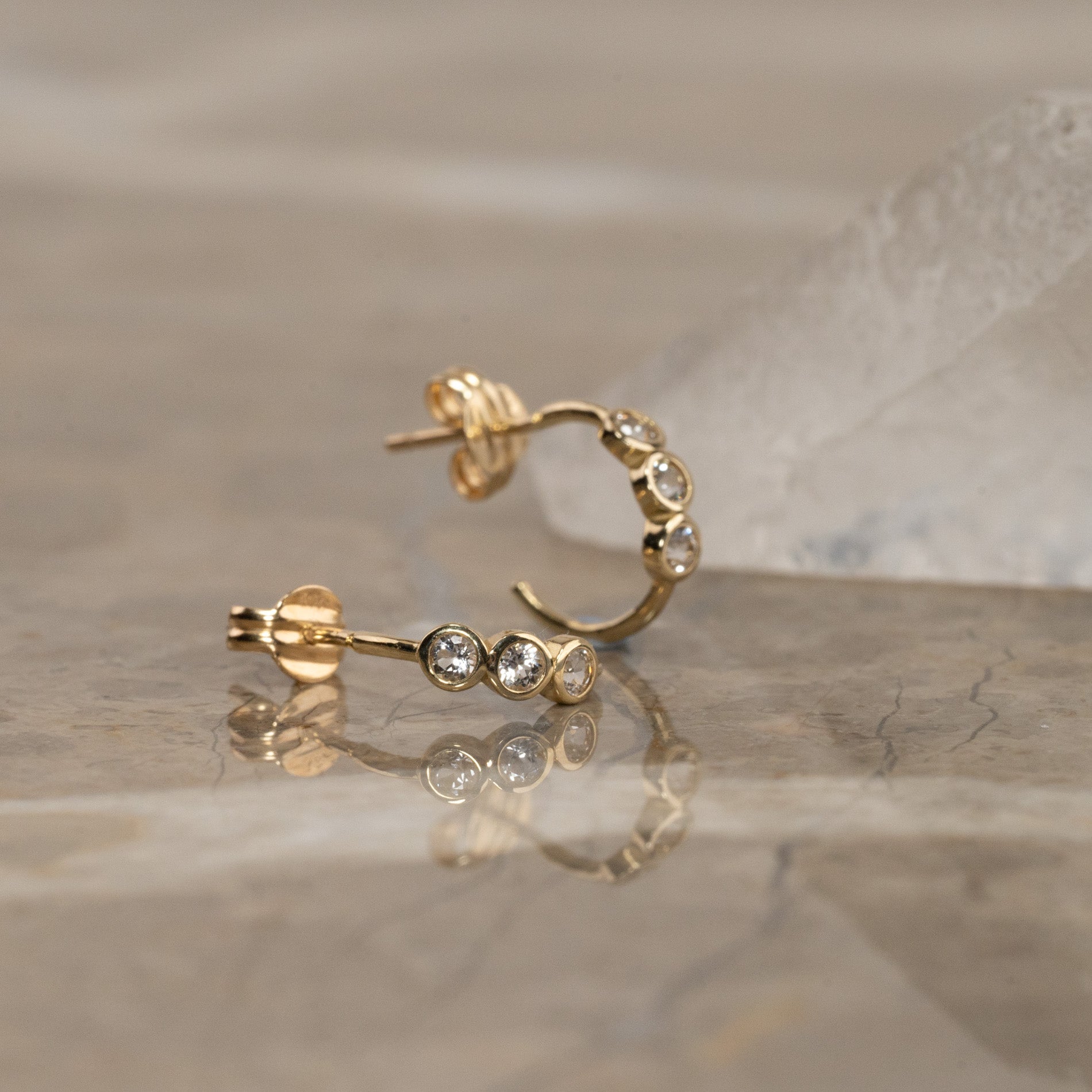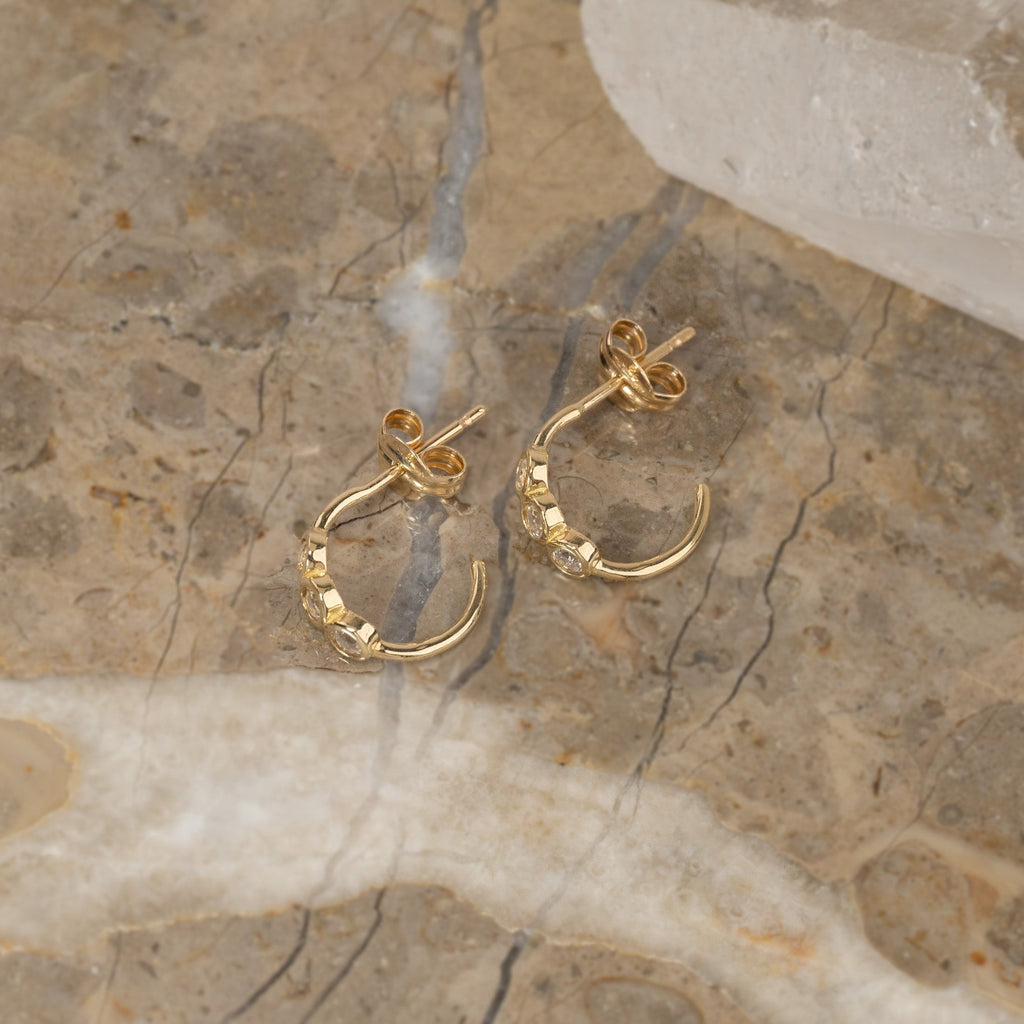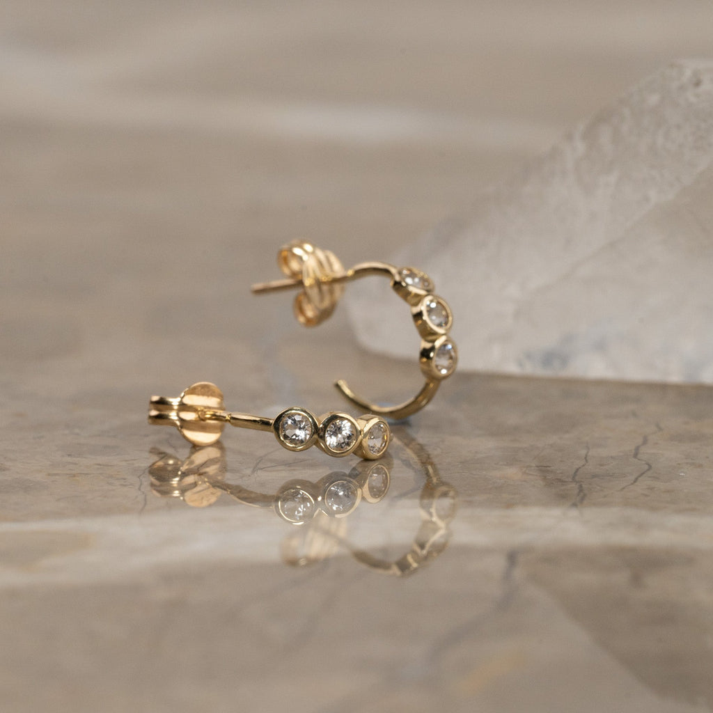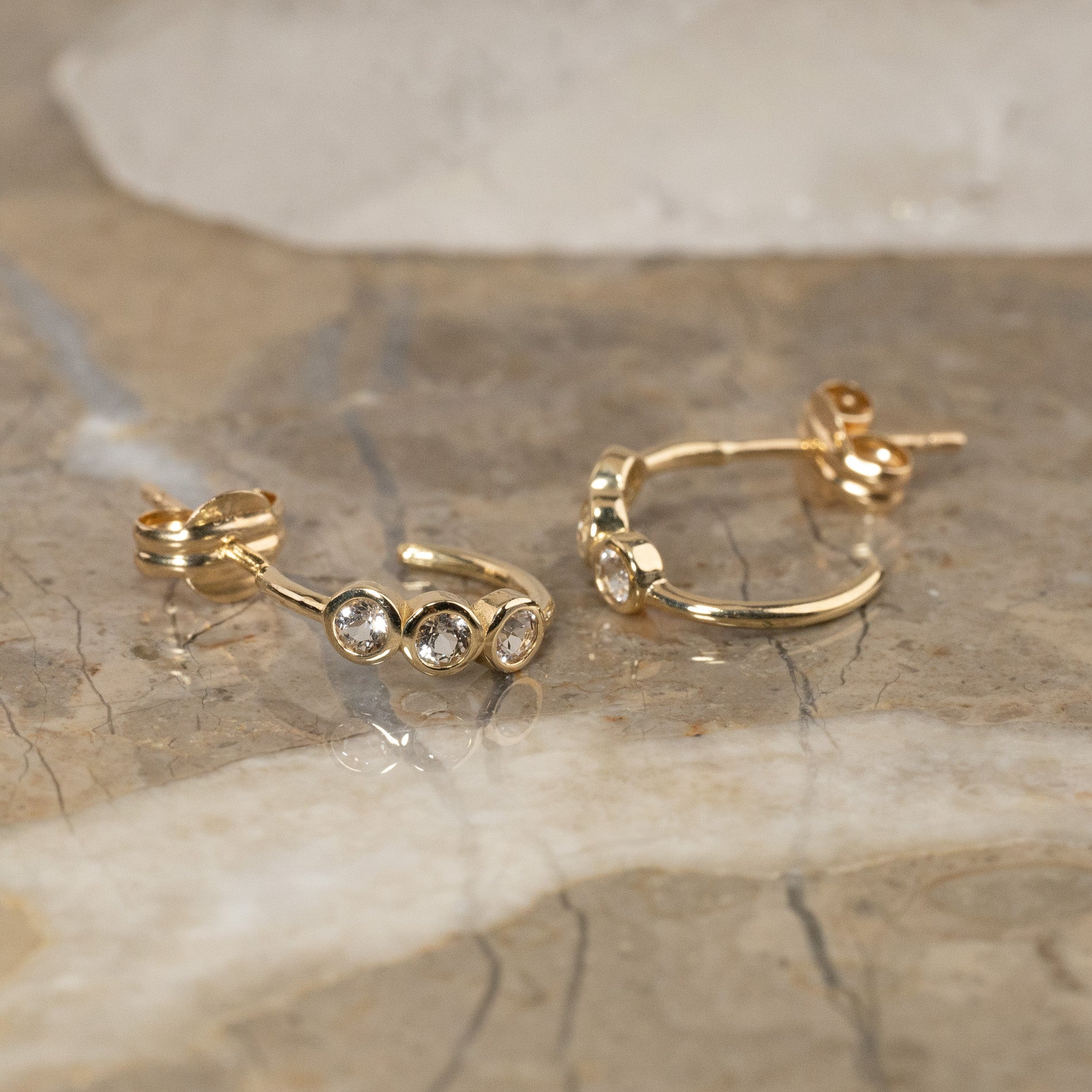 Beautiful earrings made from 100% recycled solid 9 karat gold. The earrings consist of three white topaz stones, which gives the earrings unique details and a feminine look.