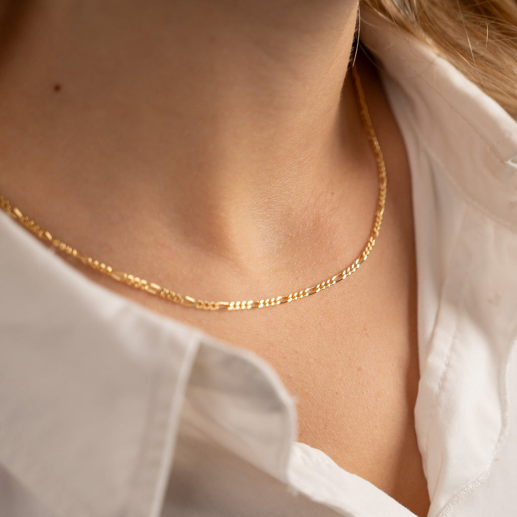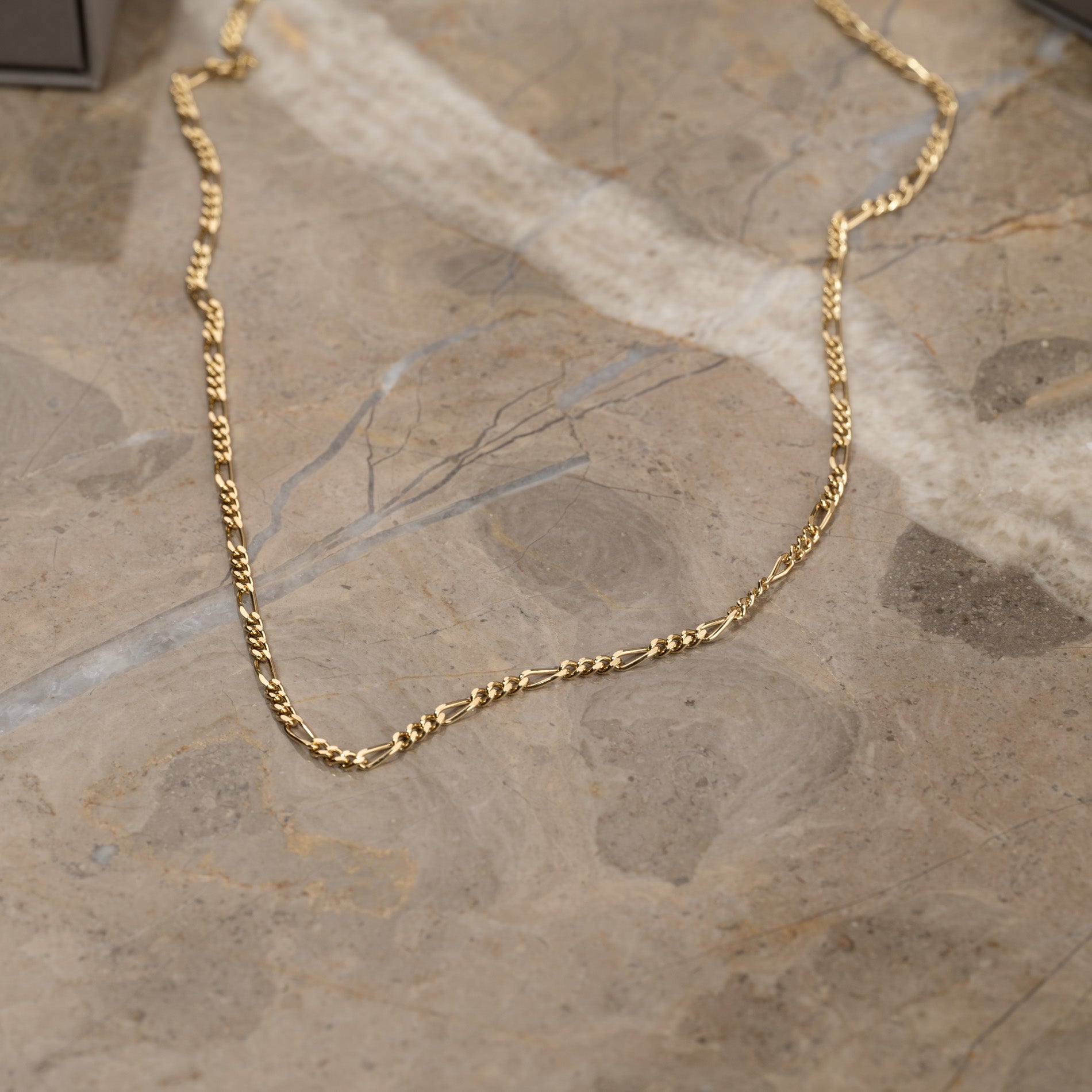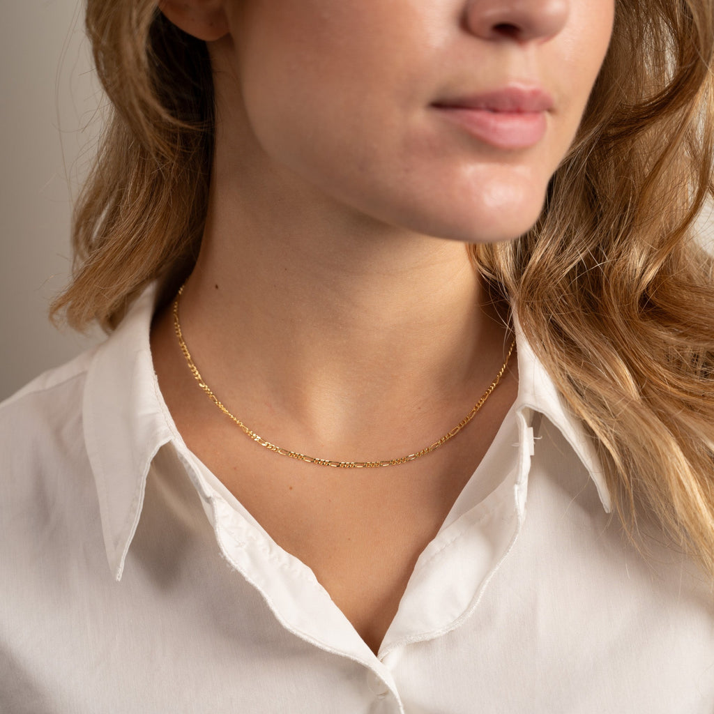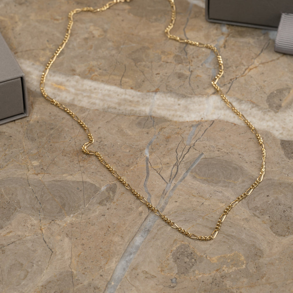 Unsere Uma-Halskette hat einen eleganten und modernen Ausdruck. Die Kette ist ein Twist von der klassischen Panzerkette, da die Kette aus einem Muster von drei kleinen und einem länglichen Gelenk besteht. Eine elegante Halskette, die zu allen Gelegenheiten passt