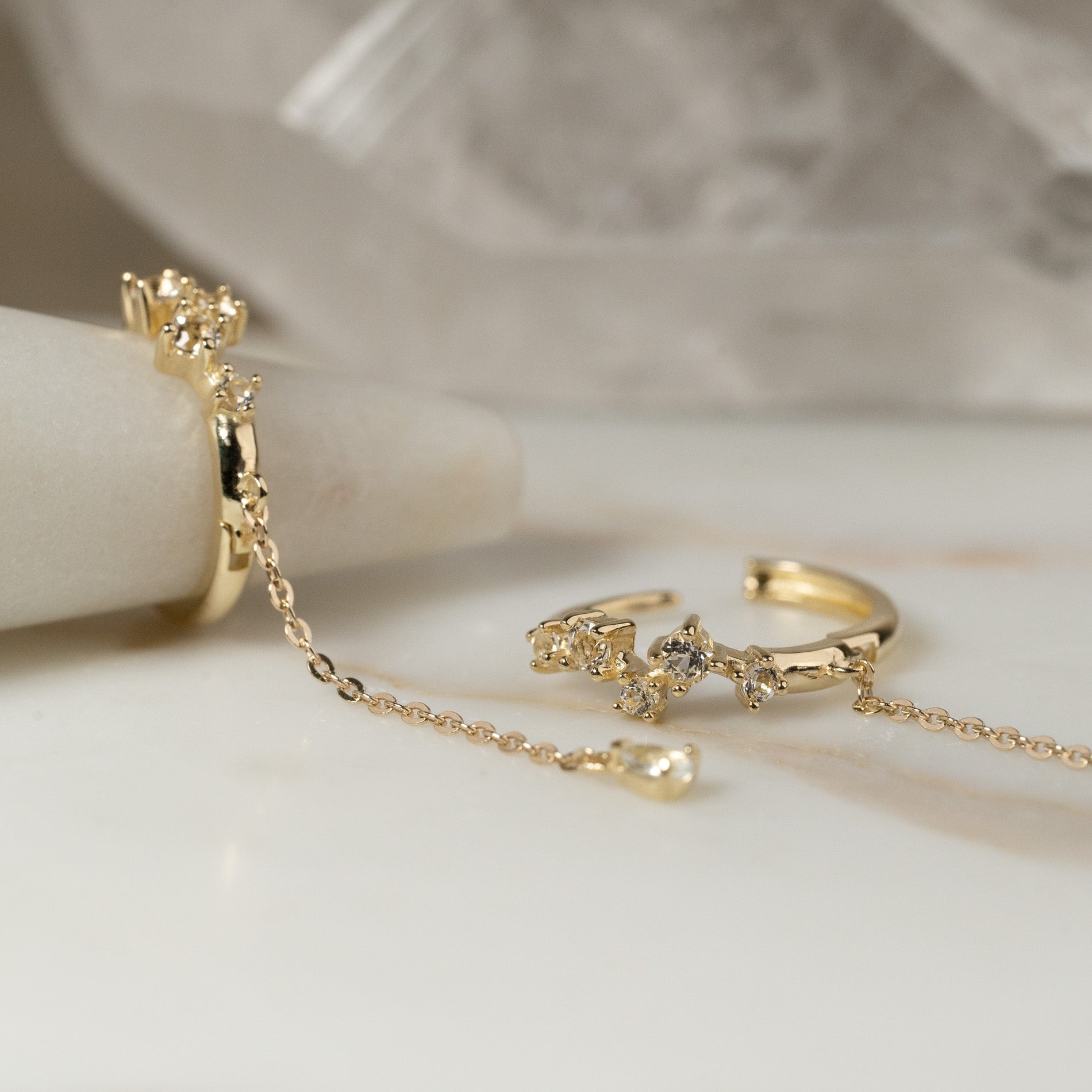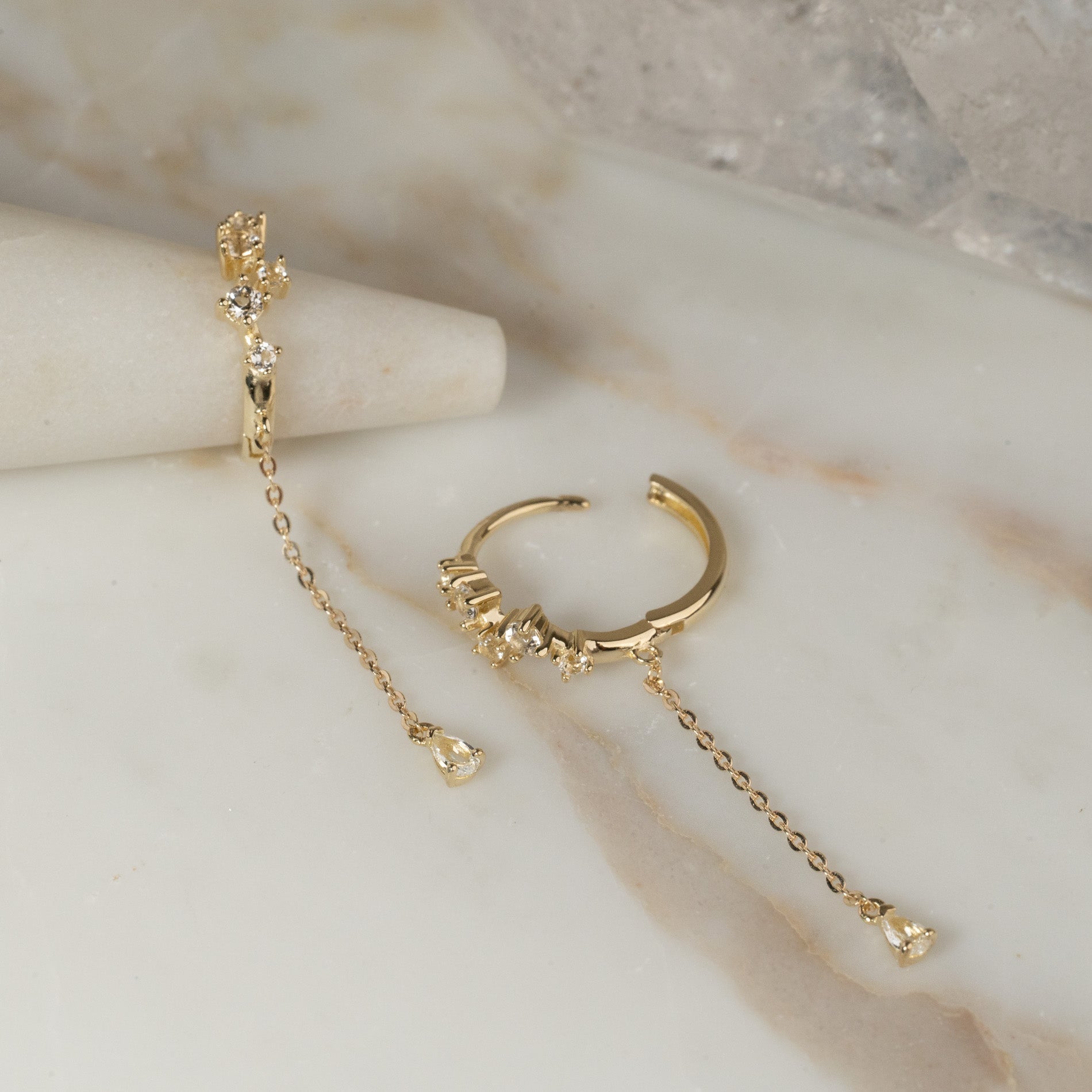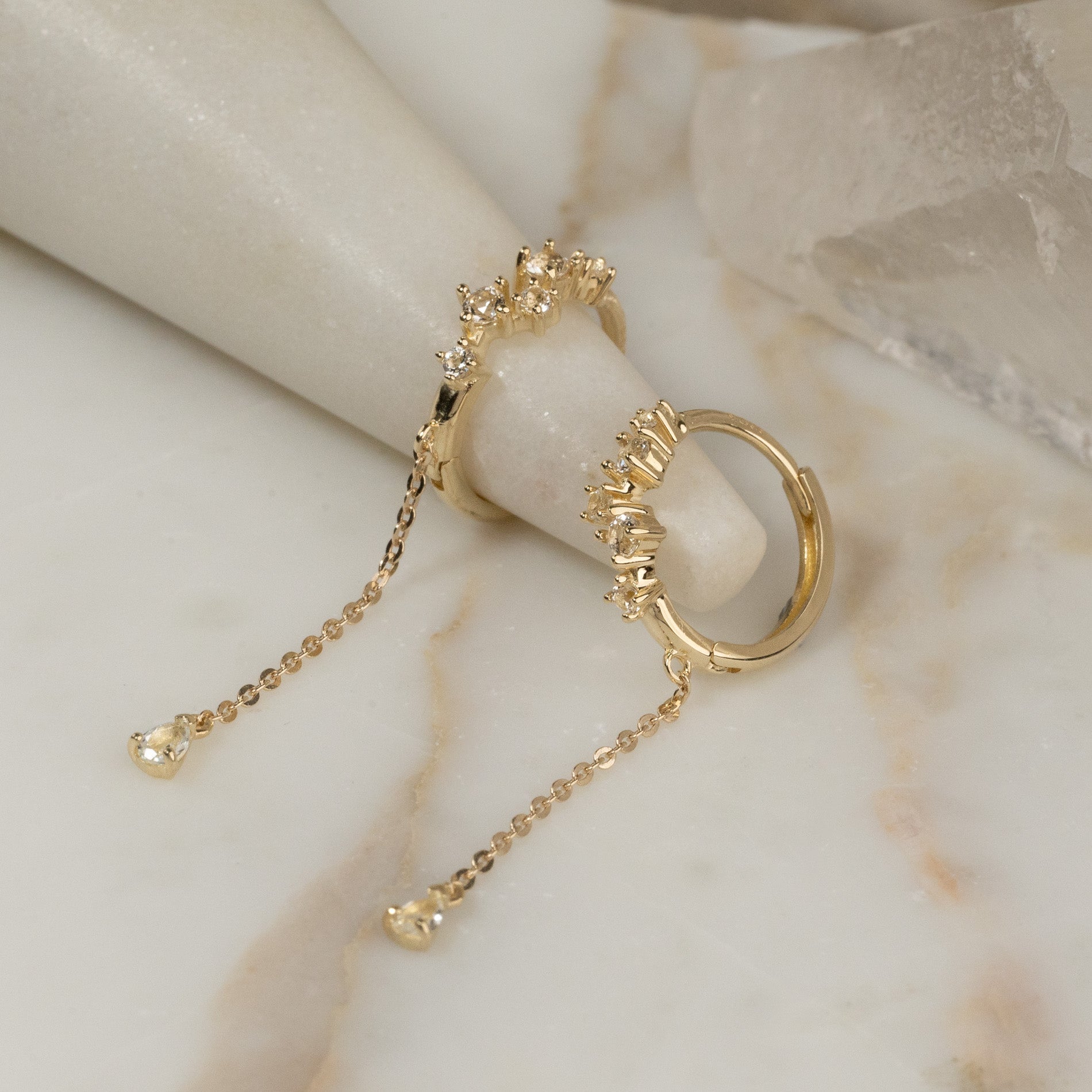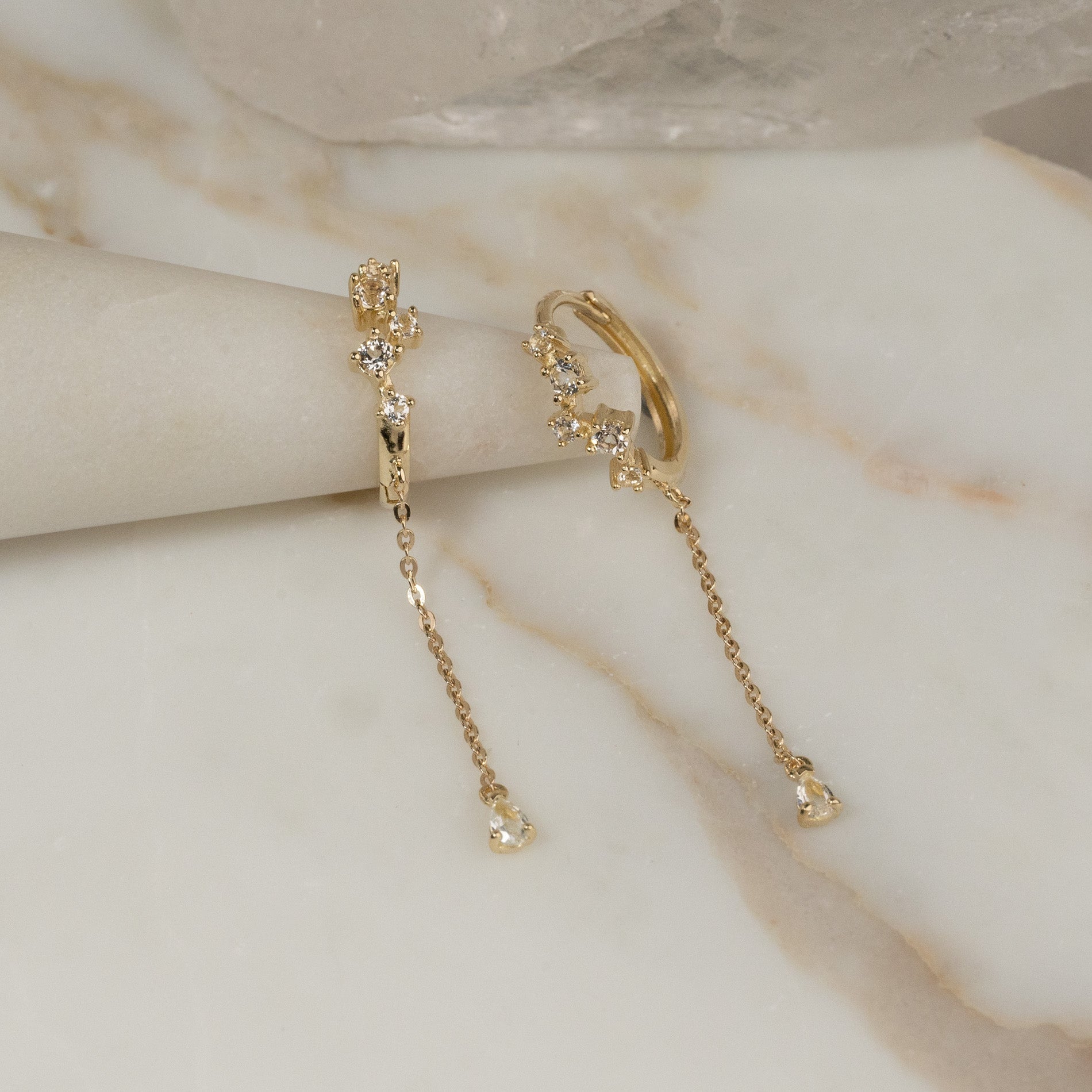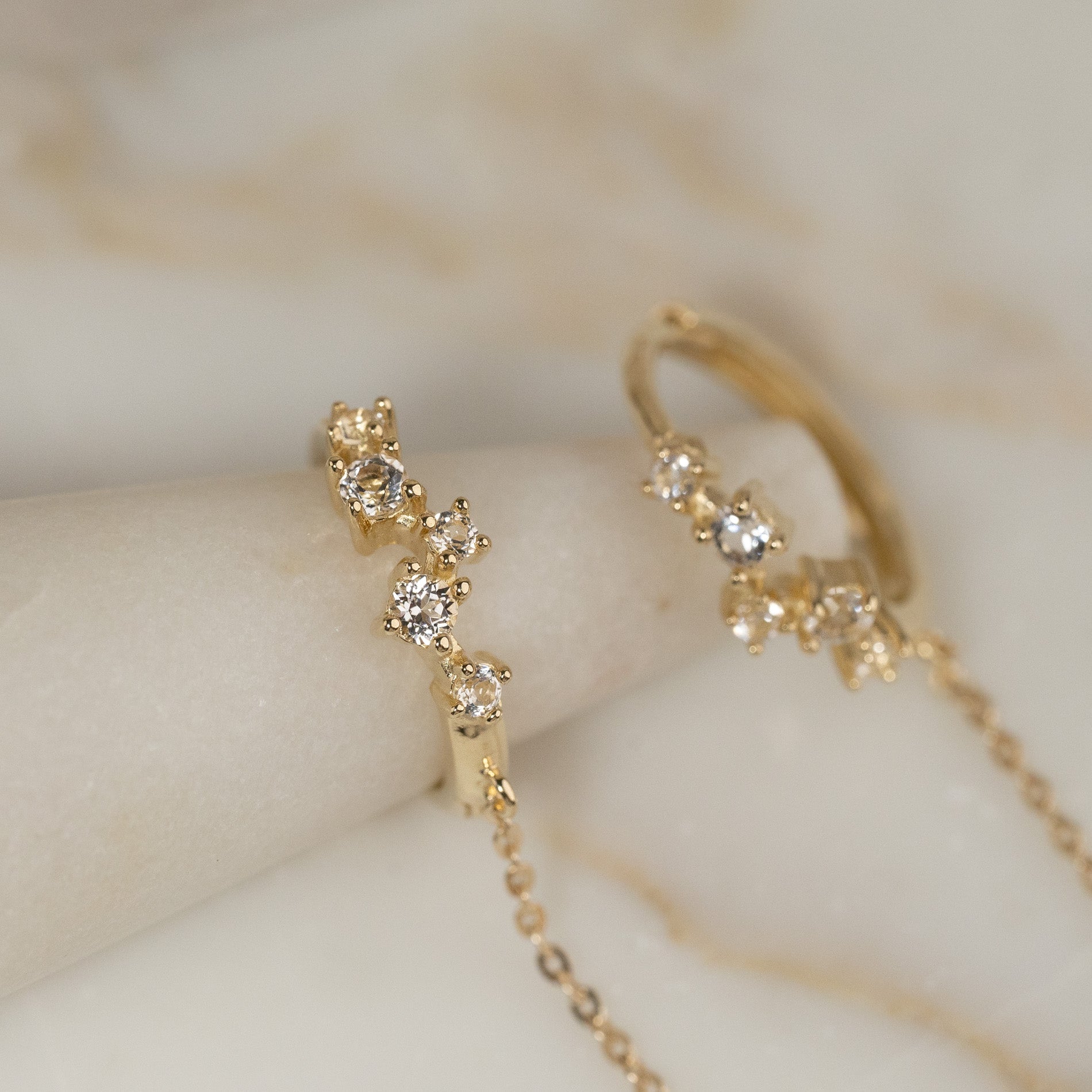 The earrings consist of a hoop set with five white topazes. From the hoop hangs a chain piece, which is finished with another topaz at the end.