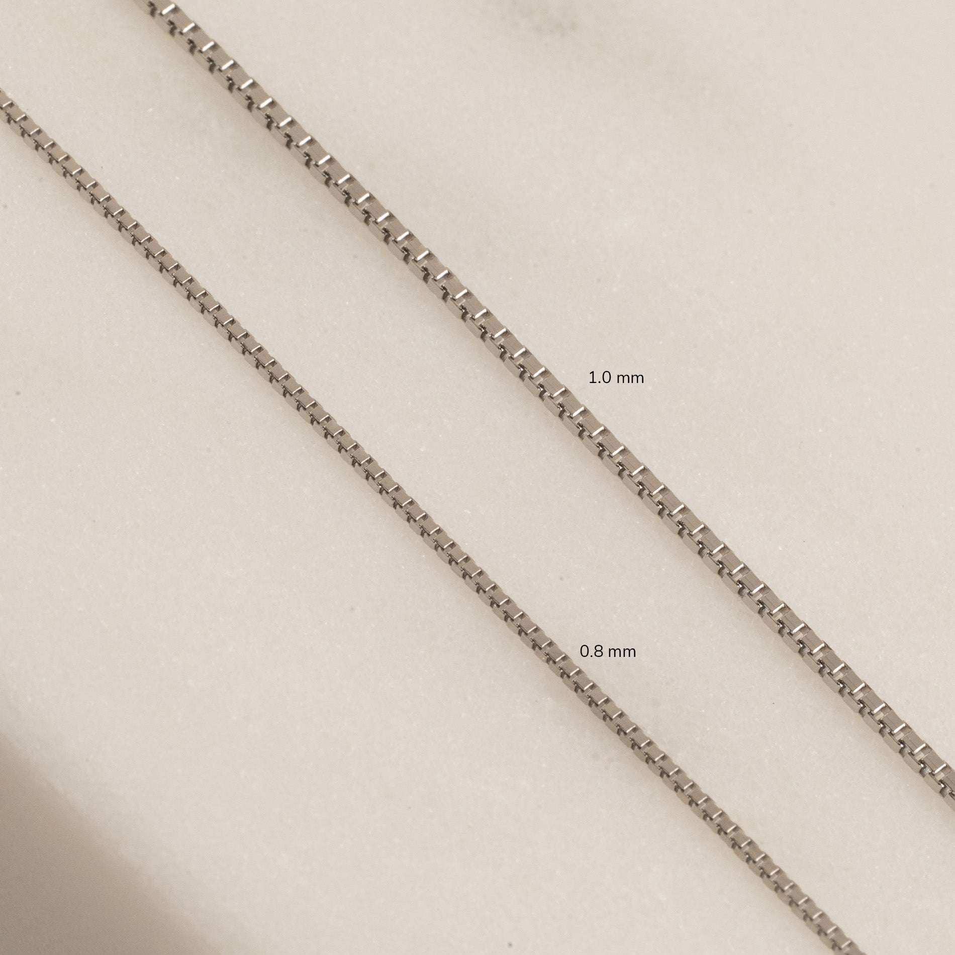 The chain is 1.0 mm wide and is available in several lengths. You can choose between 40 cm, 42 cm, 45 cm, 50 cm, and 55 cm. If you are unsure about how long you want the chain to be, you can see our size guide here.