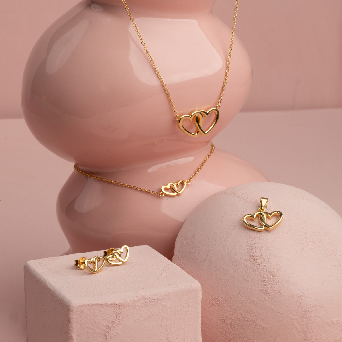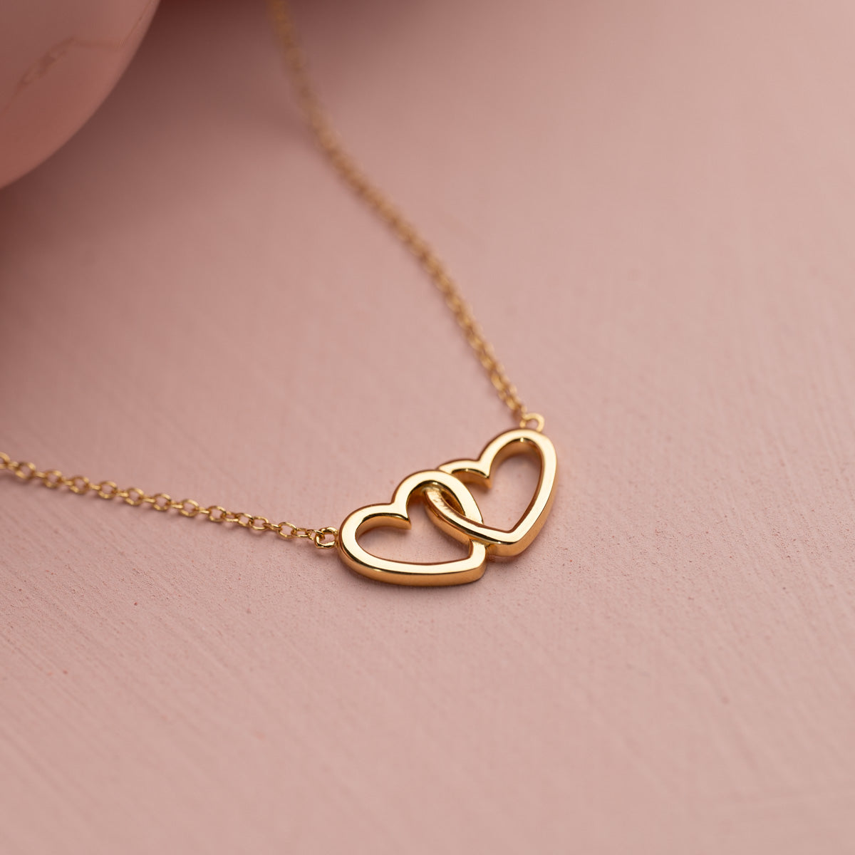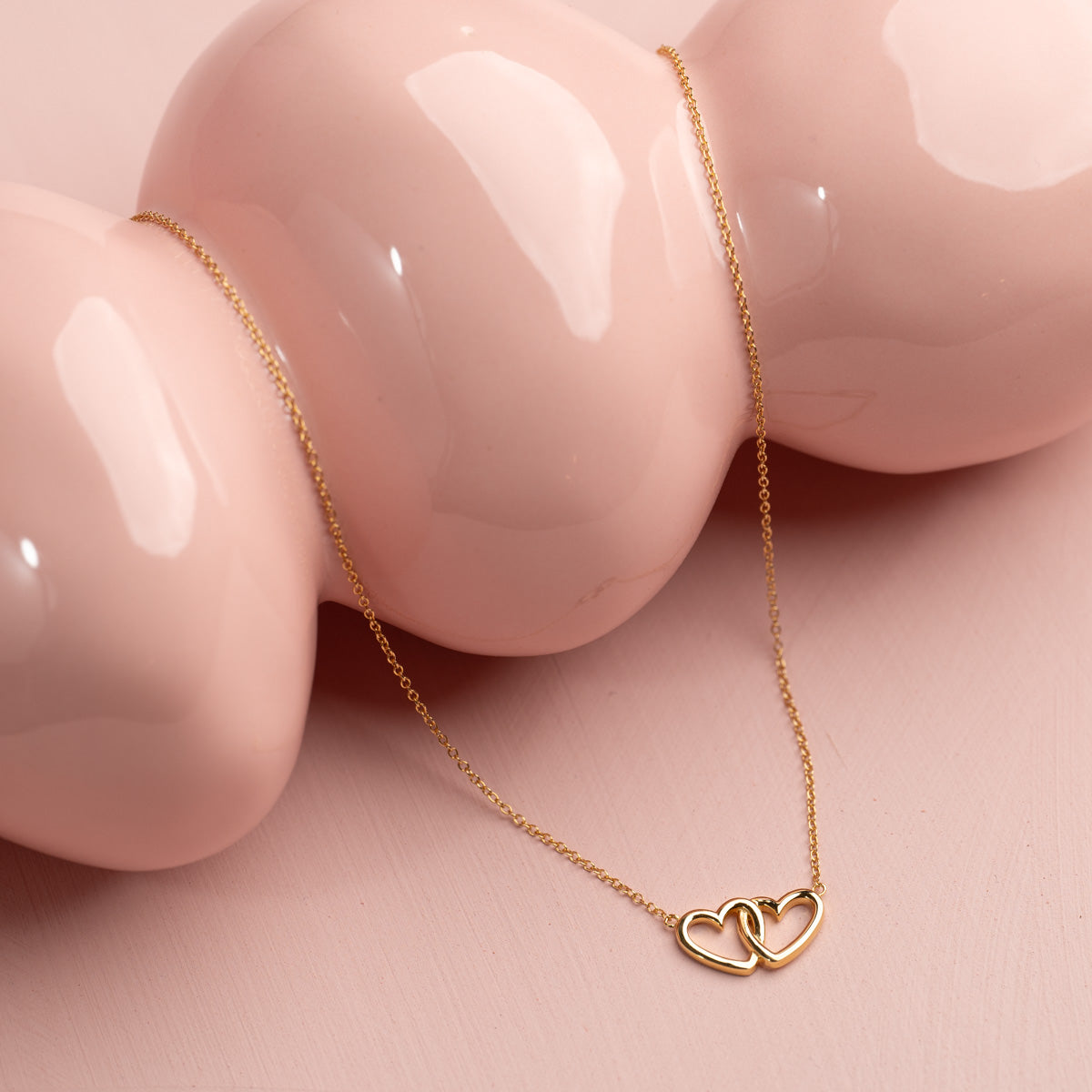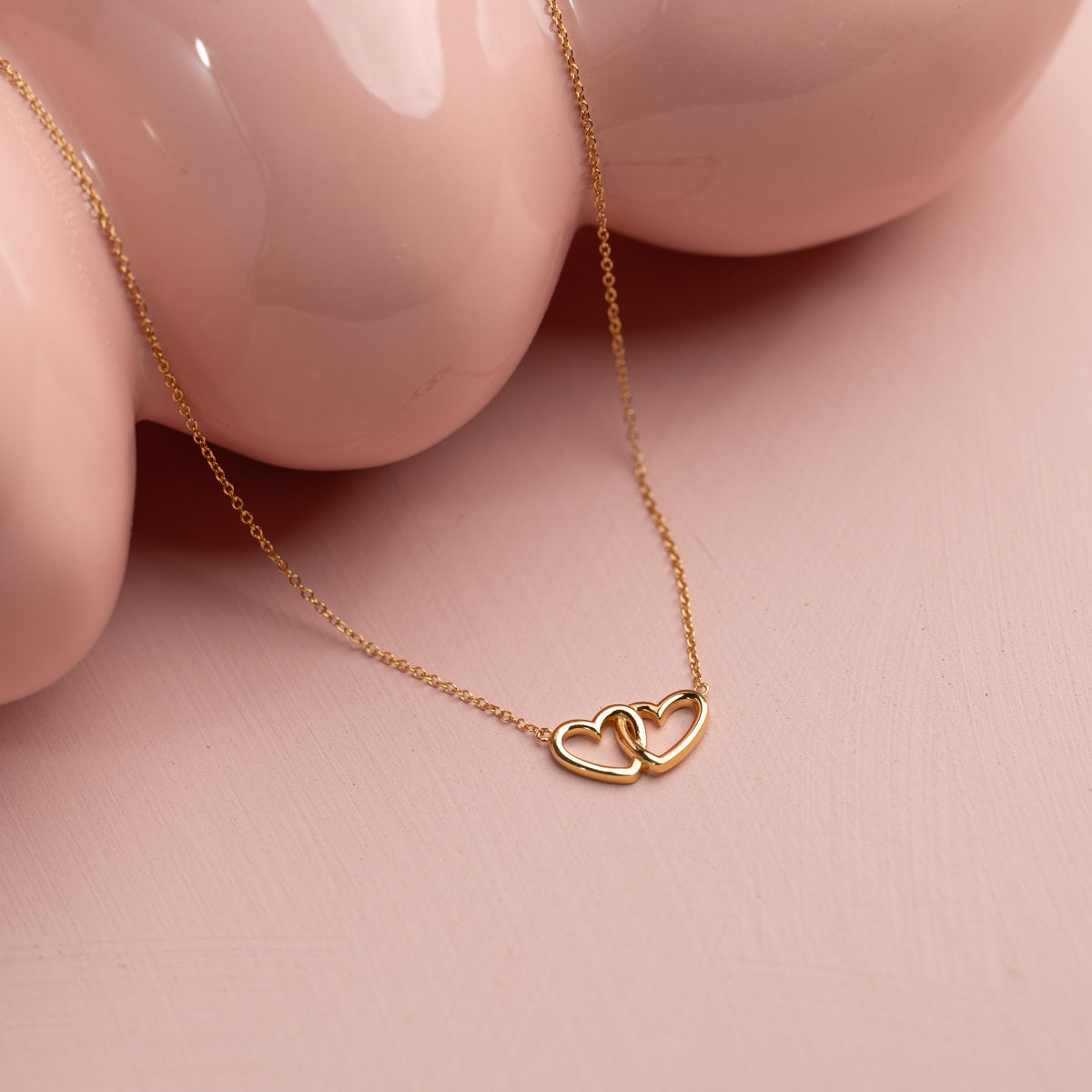This heart necklace is crafted from recycled 18-carat gold-plated silver, featuring two hearts that hang together, seamlessly integrated with the chain itself.