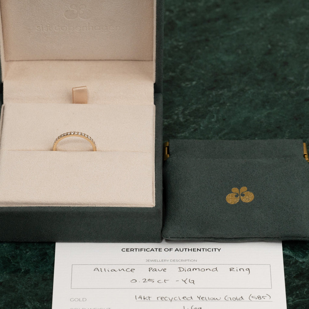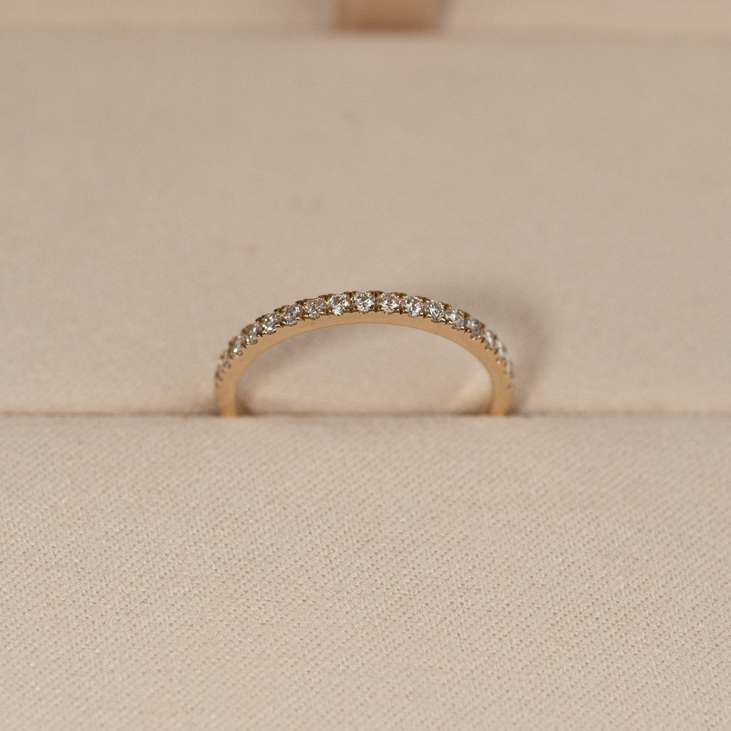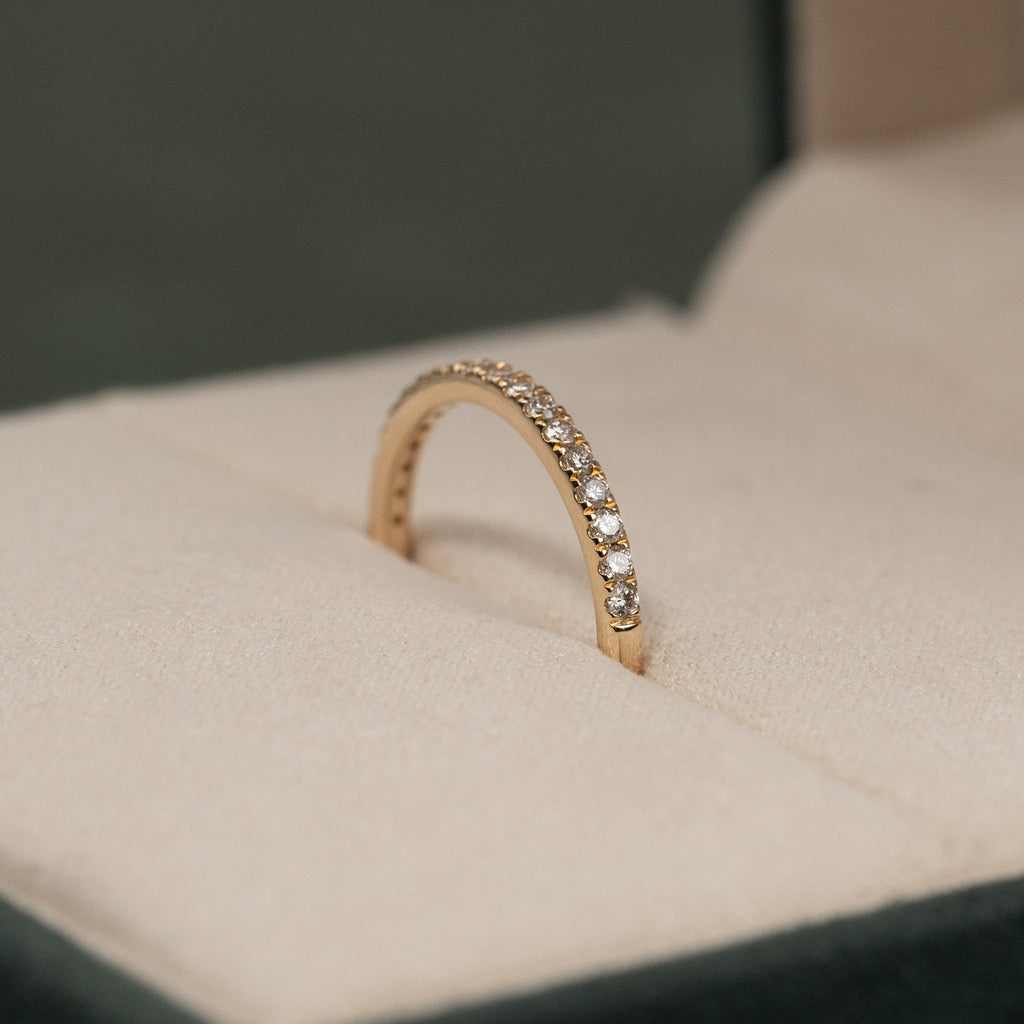 The ring is crafted in 14 karat solid gold with 18 lab-grown diamonds with a total weight of 0.25 ct. The band itself has a width of 2 mm. The diamonds have a color grade of E/F (River) and clarity of VVS. This piece of jewelry is thoughtfully made; the diamonds are produced using solar energy, and the gold is 100% certified recycled.