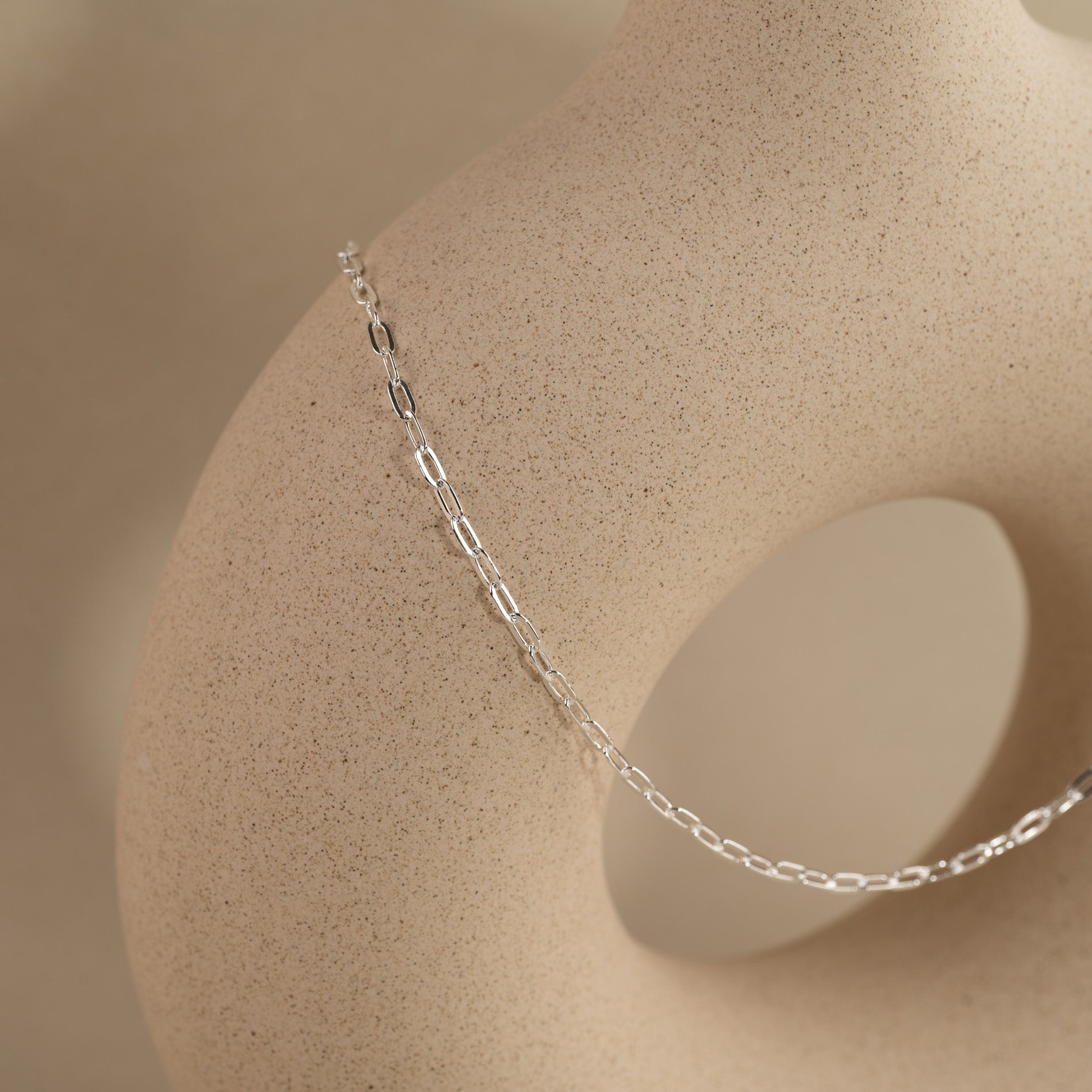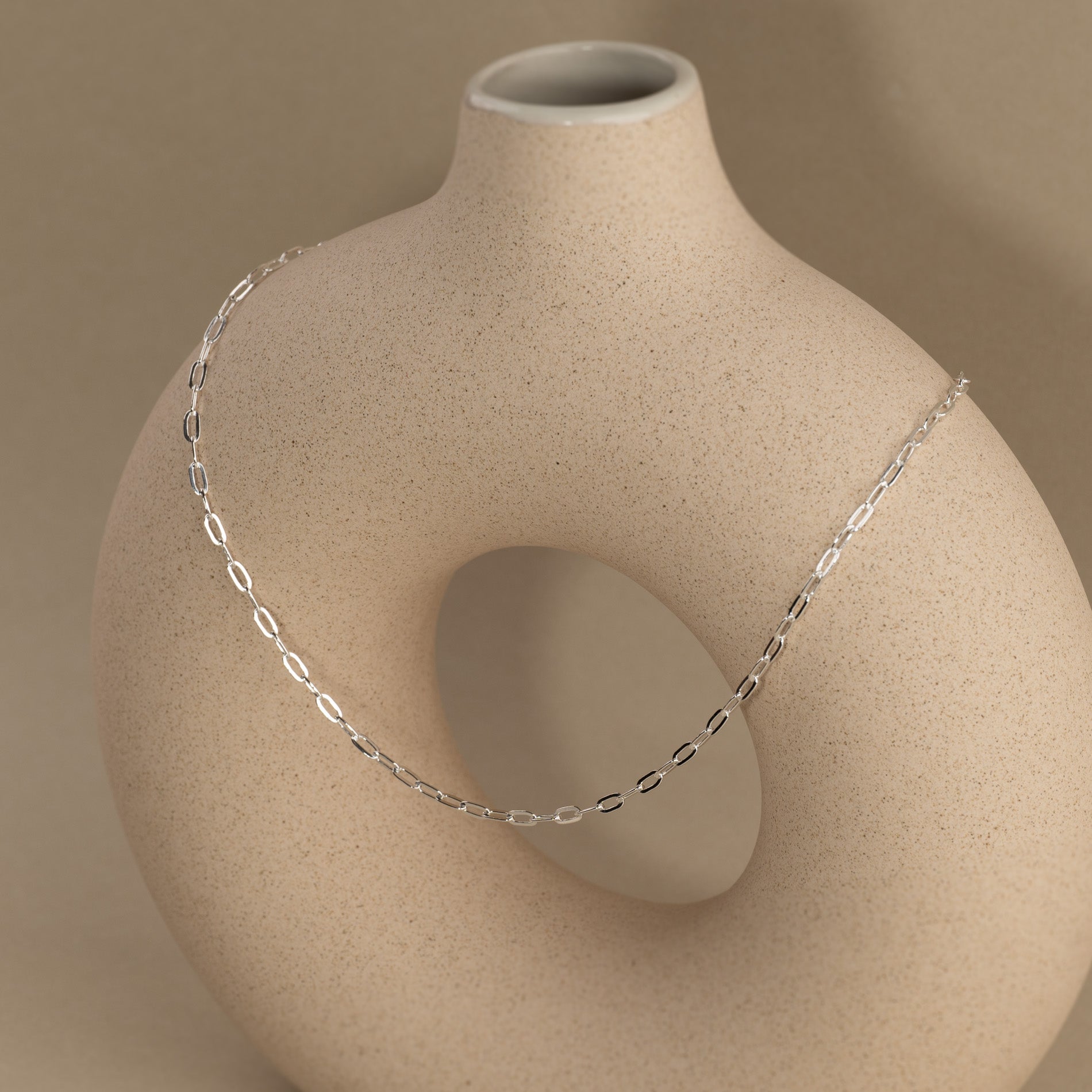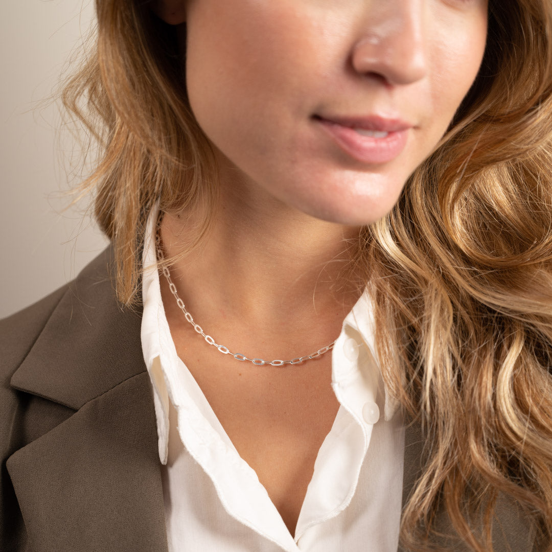 Our Alma medium link necklace has a simple and industrial design. The chain is slightly more feminine than our Alma large link-series, and has therefore also a more minimalistic expression, which makes it easy to combine the chain with other jewelry.