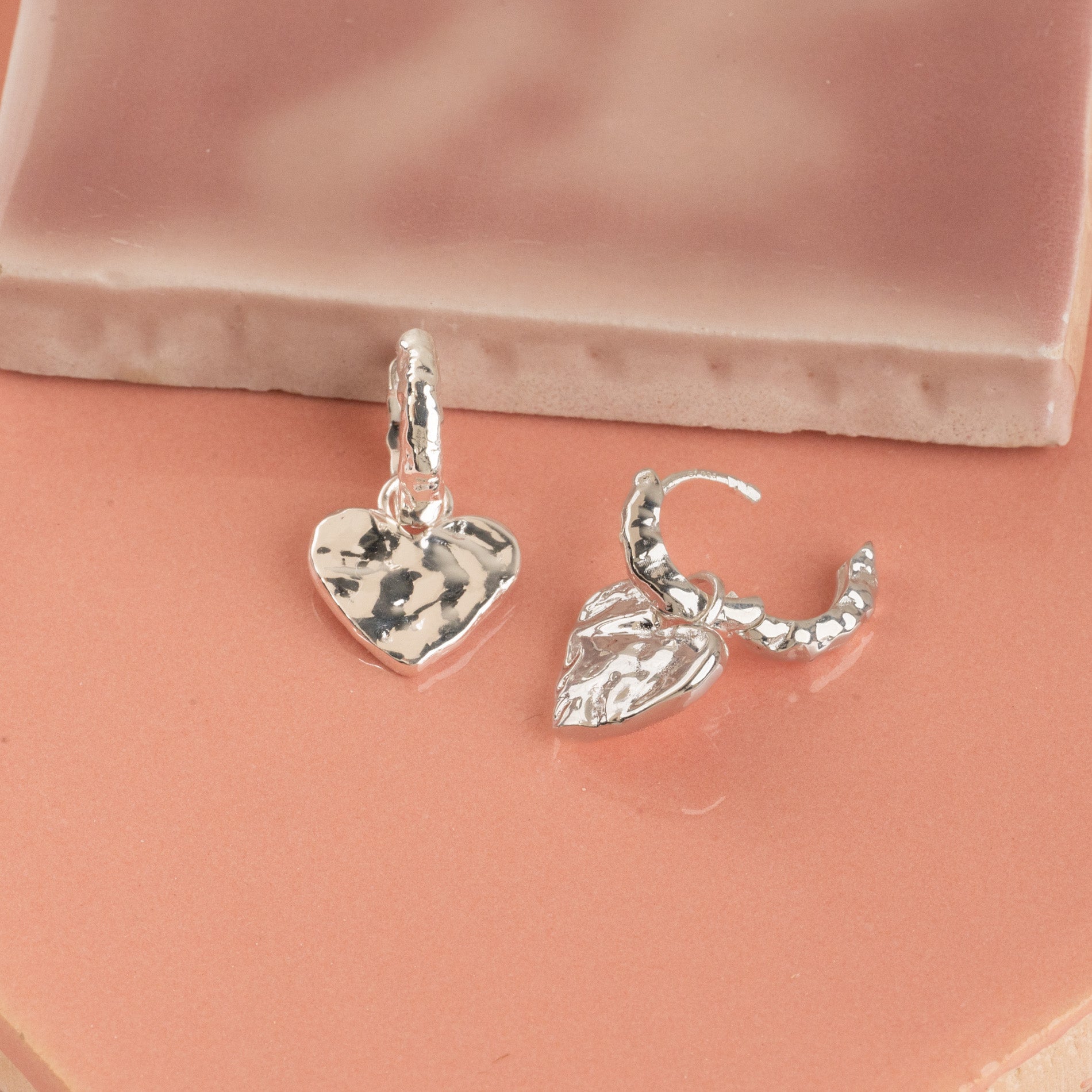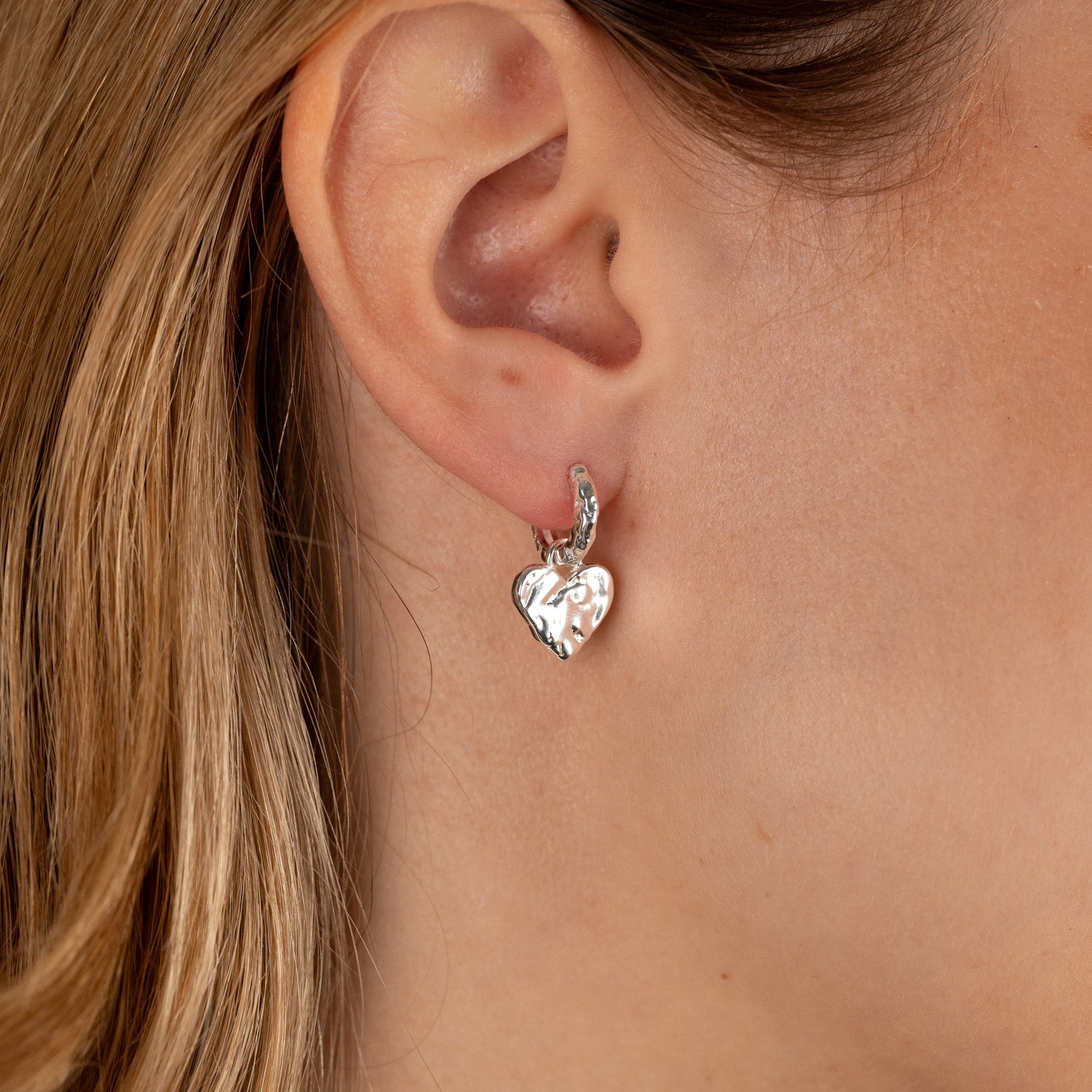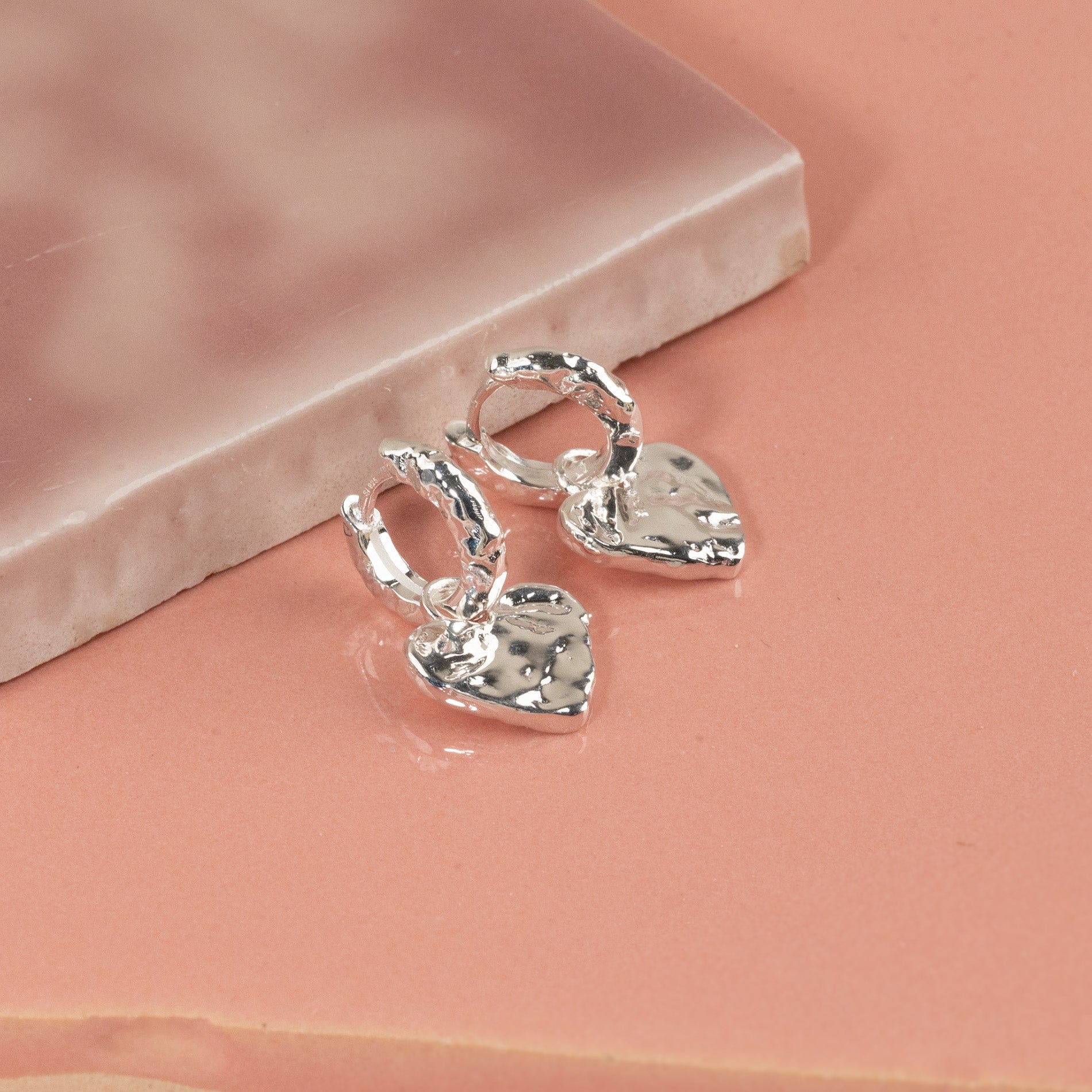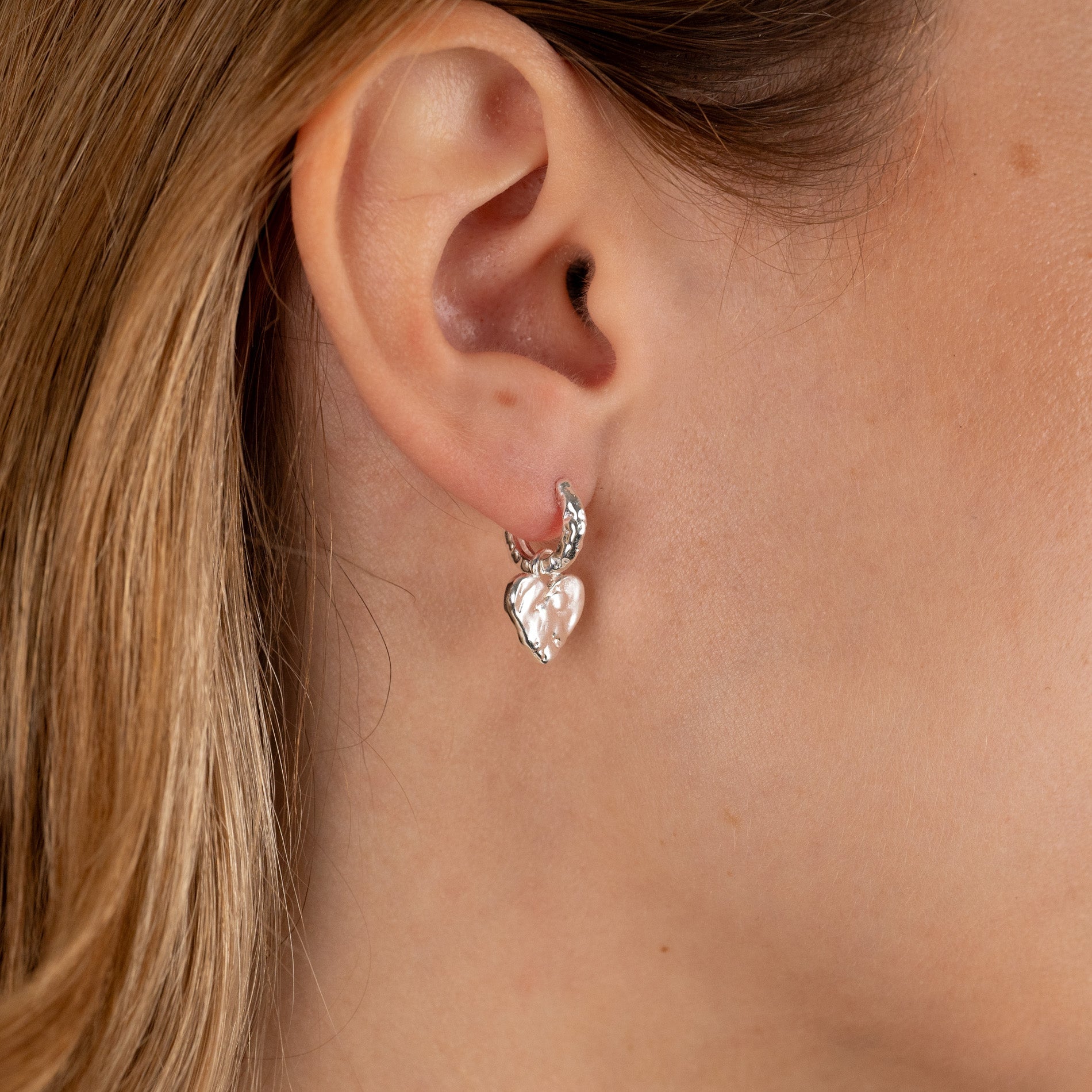 Huggies in 100% recycled sterling silver with a heart pendant. The earrings have a raw surface inspired by melted metal.