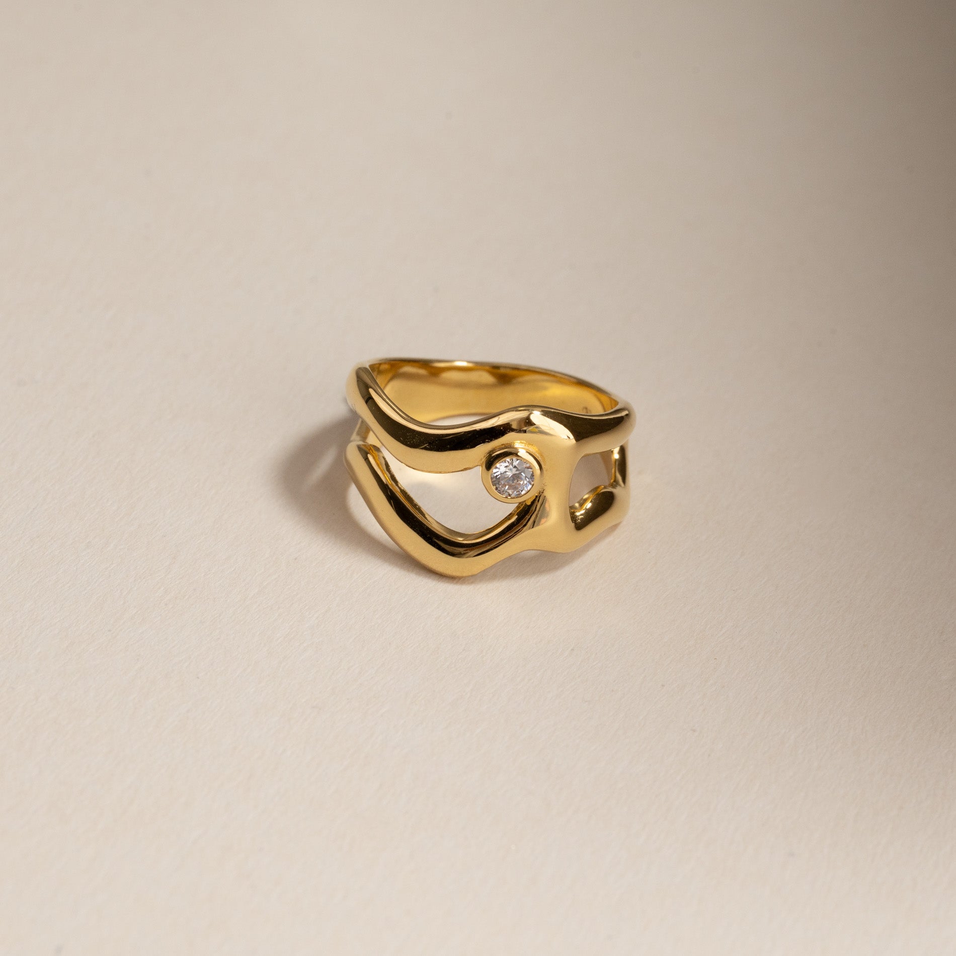 Crafted from 100% recycled 18k gold-plated sterling silver, this ring is set with a clear zircon among soft, organic lines. The flowing design creates a feminine yet bold expression, making it both elegant and eye-catching