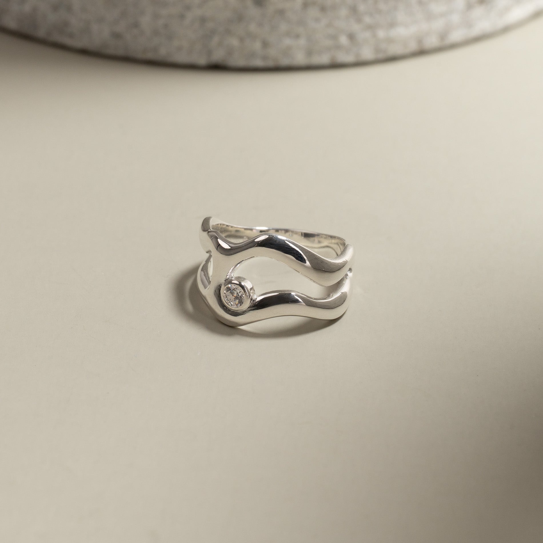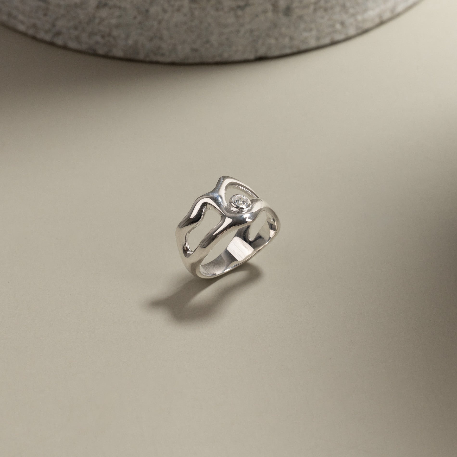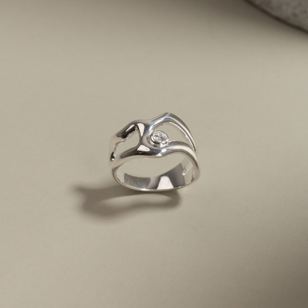 Sterling silver ring with soft, organic lines and a clear zircon
