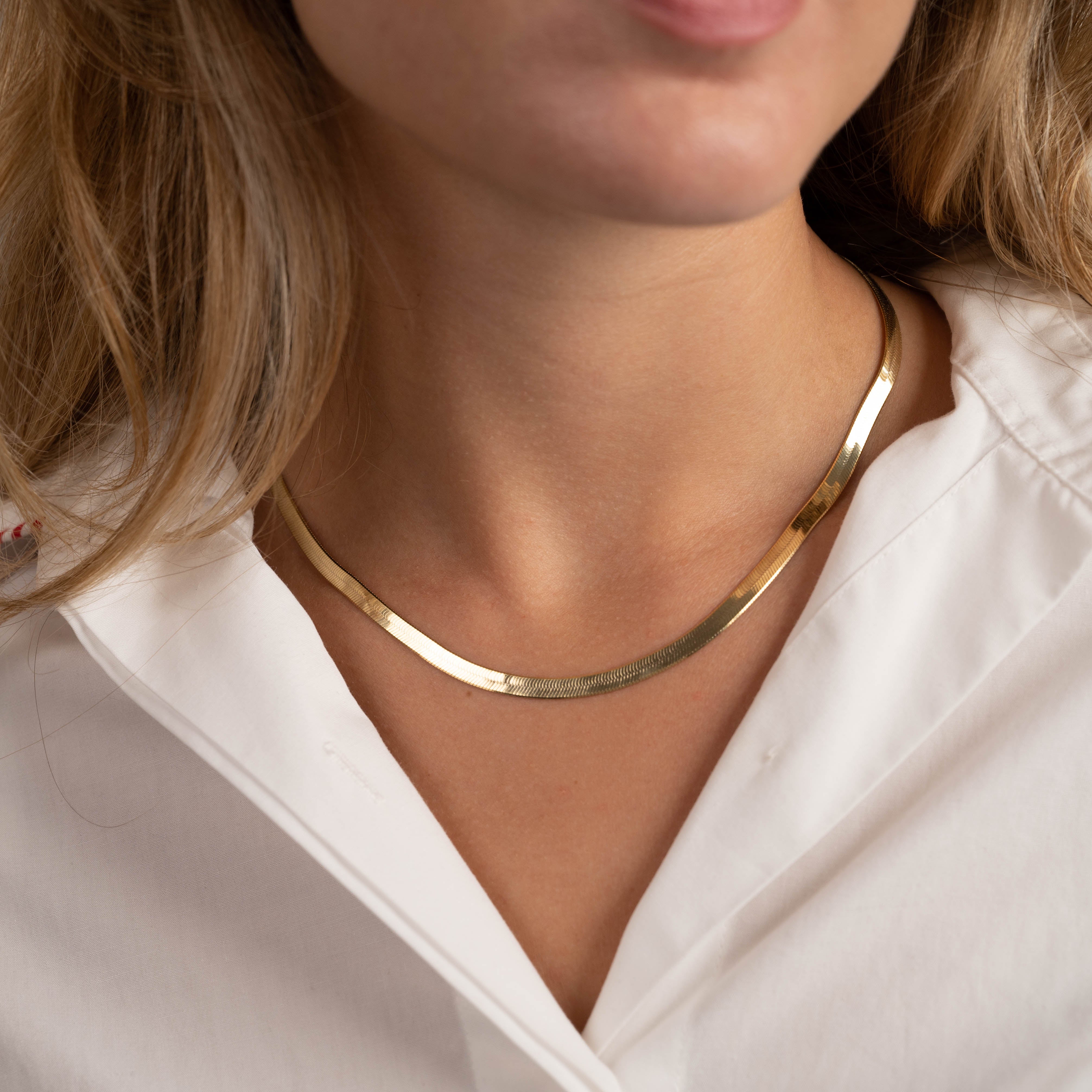 Our Aya chain is the perfect addition to your jewelry collection. The chain is simple and elegant, and falls incredibly well around the neck. The chain links sit close to each other and give a snake-like look with their shiny surface.