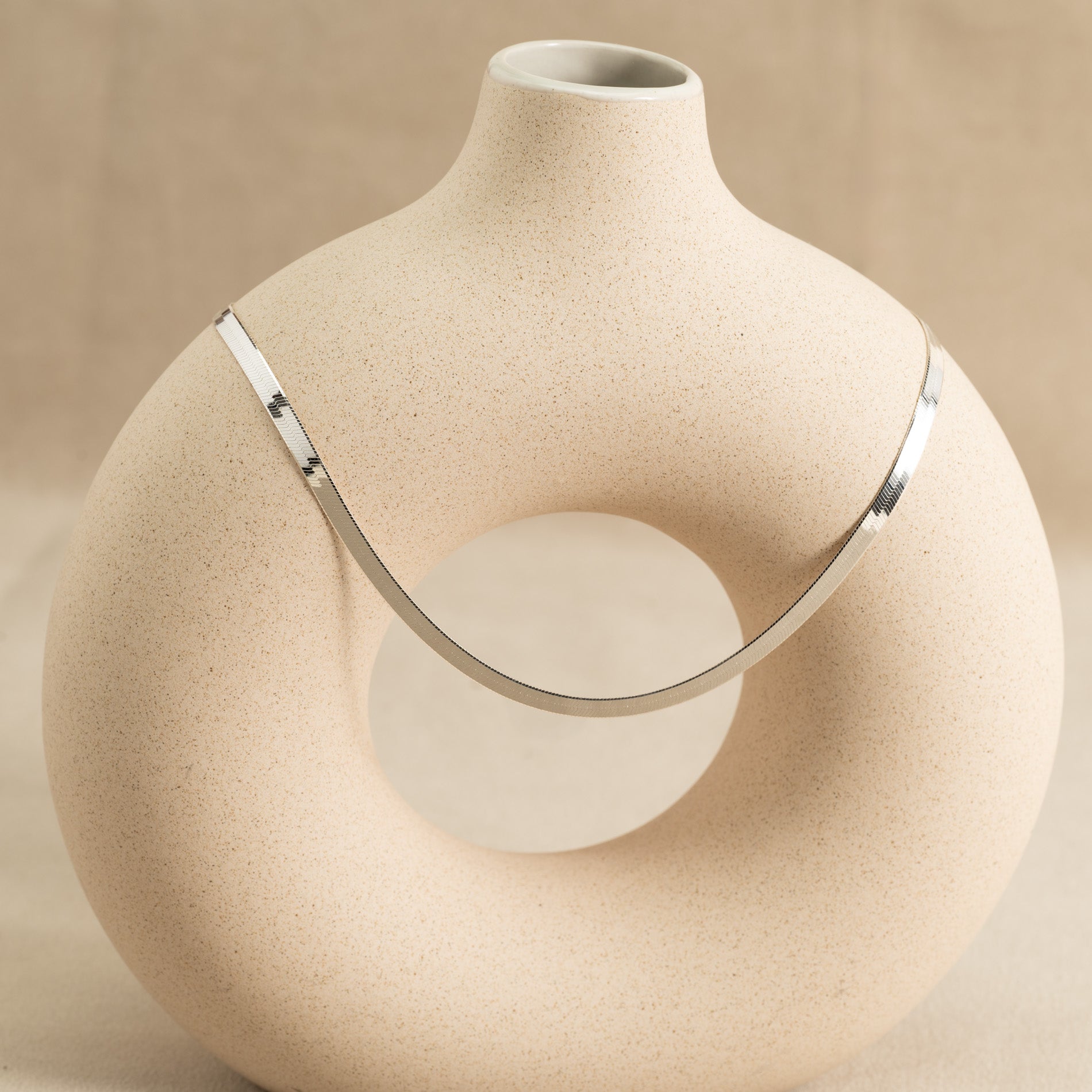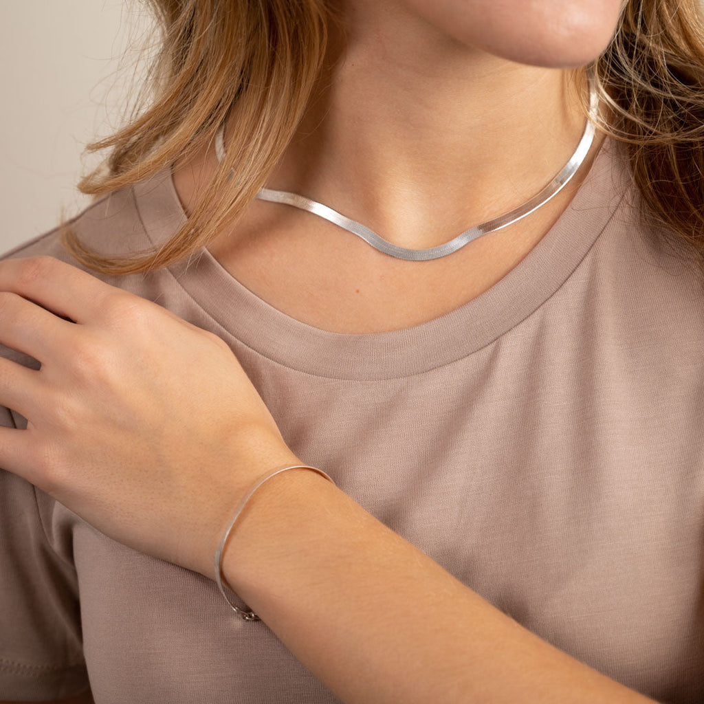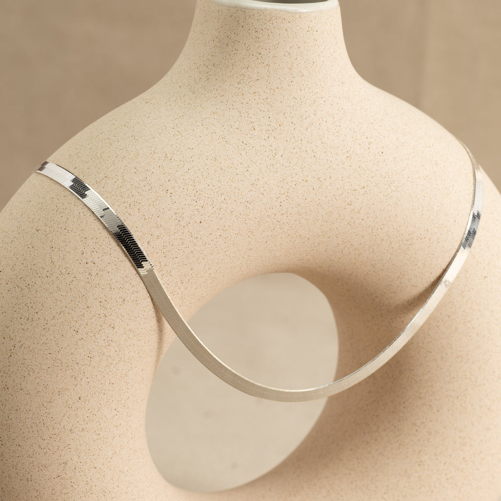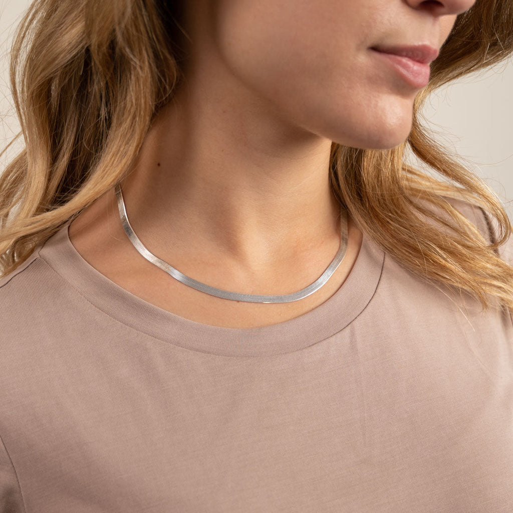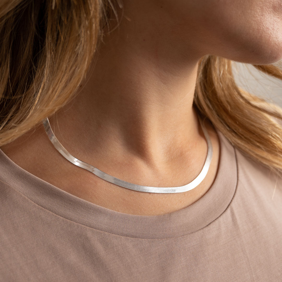The chain is 5mm in width and 42cm in length. The necklace is also avilable in gold-plated silver or as a part of a jewelry set. See our Aya gold-plated herringbone chain or Aya silver herringbone bracelet. .