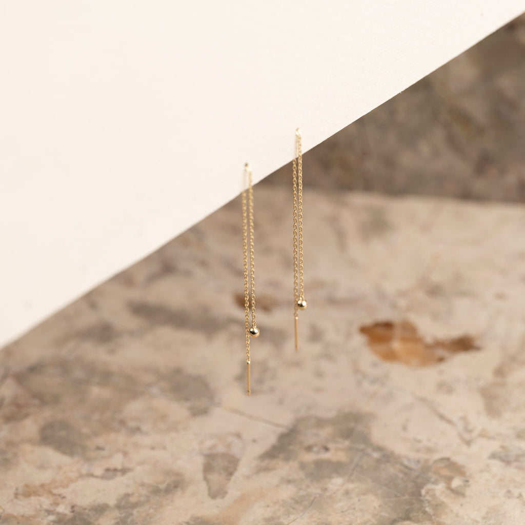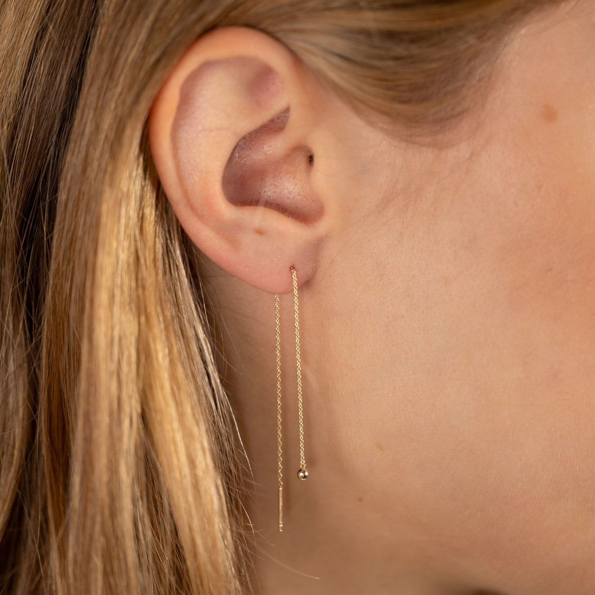 These earrings are crafted from 100% recycled solid 9-karat gold. The earrings consist of a delicate, thin chain that is threaded through the ear. At the end of the chain, there is a small gold bead. If you have multiple earlobe piercings close to each other, you can also thread the chain through multiple piercings, creating a unique and layered look with the jewelry.