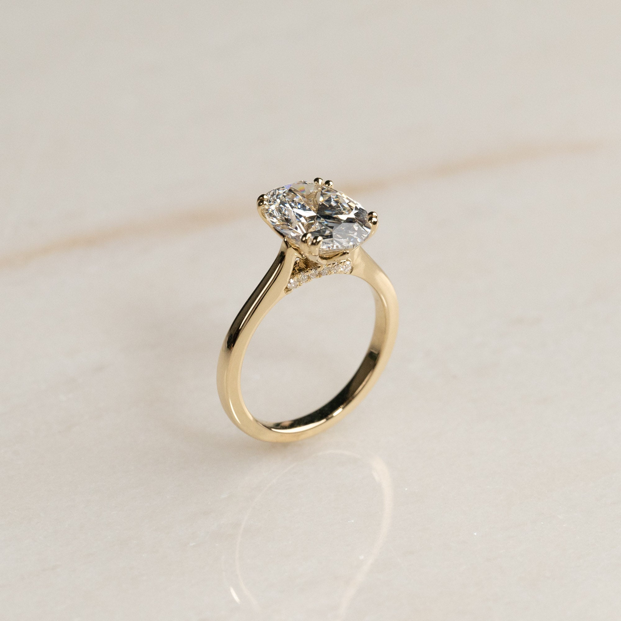 As an exclusive detail, a row of lab-grown diamonds is set just beneath the center stone along the side of the band, adding an eye-catching touch. Altogether, the ring has a total diamond weight of 3.0 ct., with diamonds in River color and VVS1 clarity.