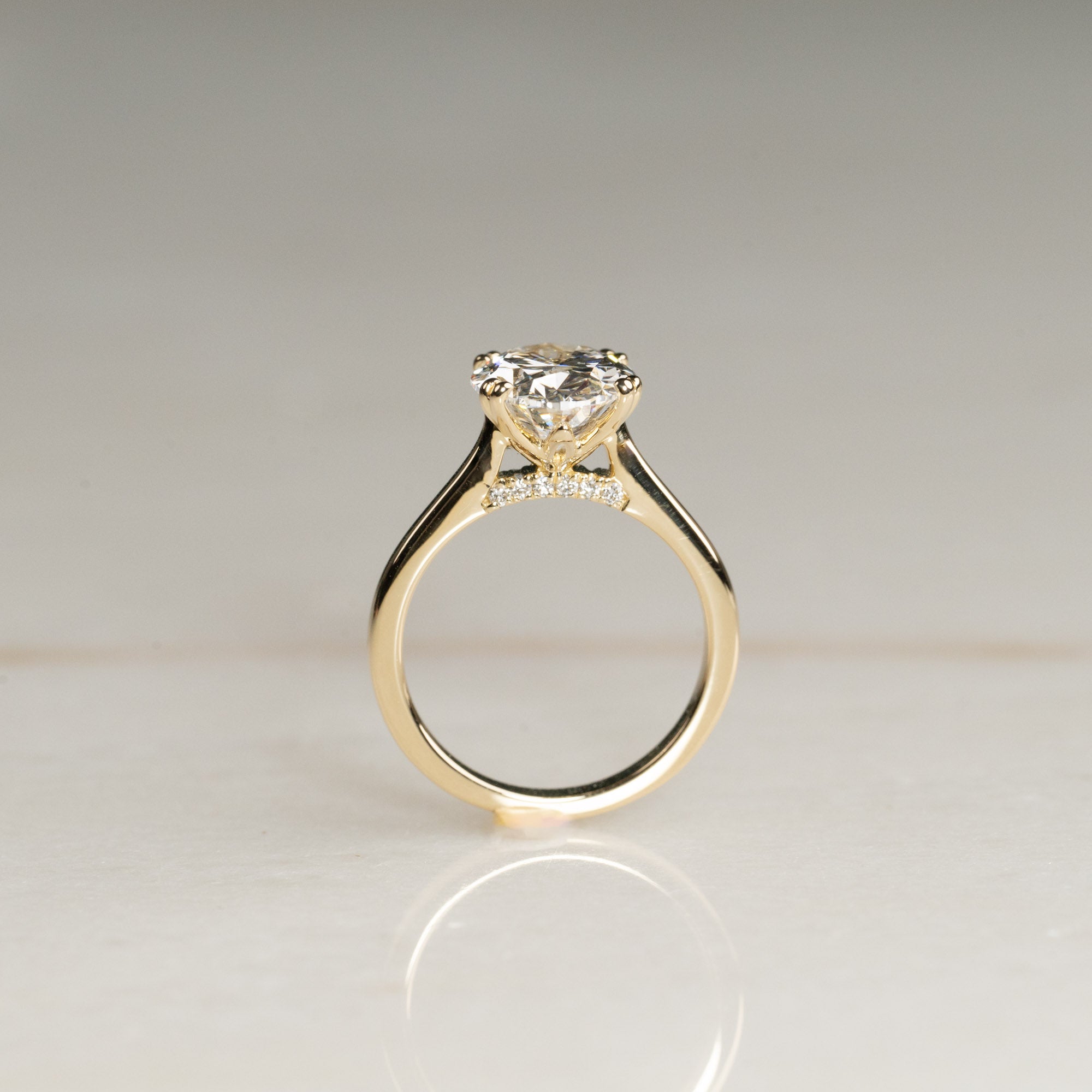 As part of the process, you’ll choose the diamond quality that best suits your preferences – including both colour and clarity. We typically use colour grade E-F, which ensures beautifully clear, colourless stones with exceptional brilliance. For clarity, we work with VVS2 as a minimum, meaning any inclusions are extremely minimal and not visible to the naked eye.