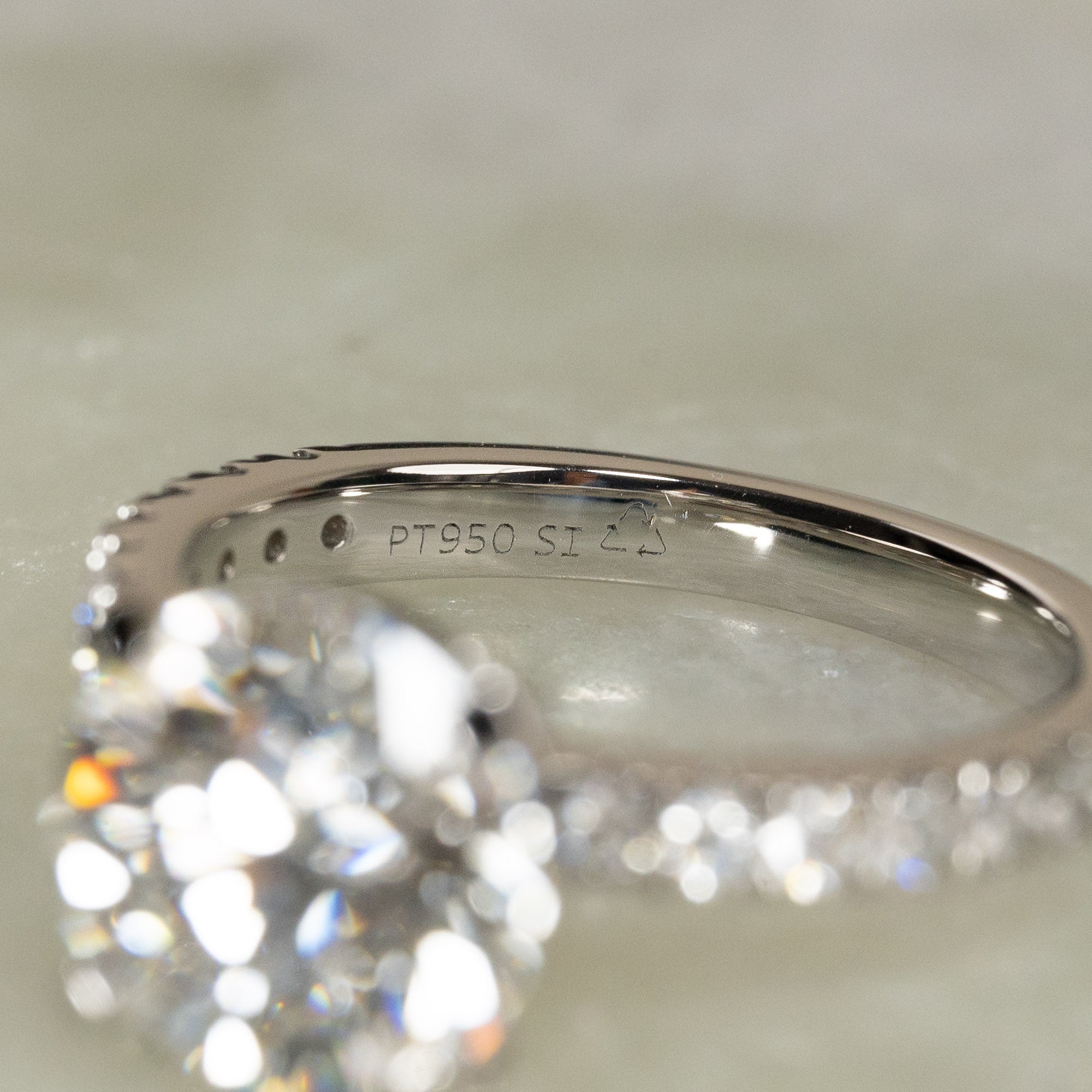 The ring is crafted in 950 platinum and has an elegant, luxurious look. The impressive center diamond sparkles in perfect harmony with the smaller diamonds set along the band. This design has a timeless expression, with every diamond catching the light from all angles.