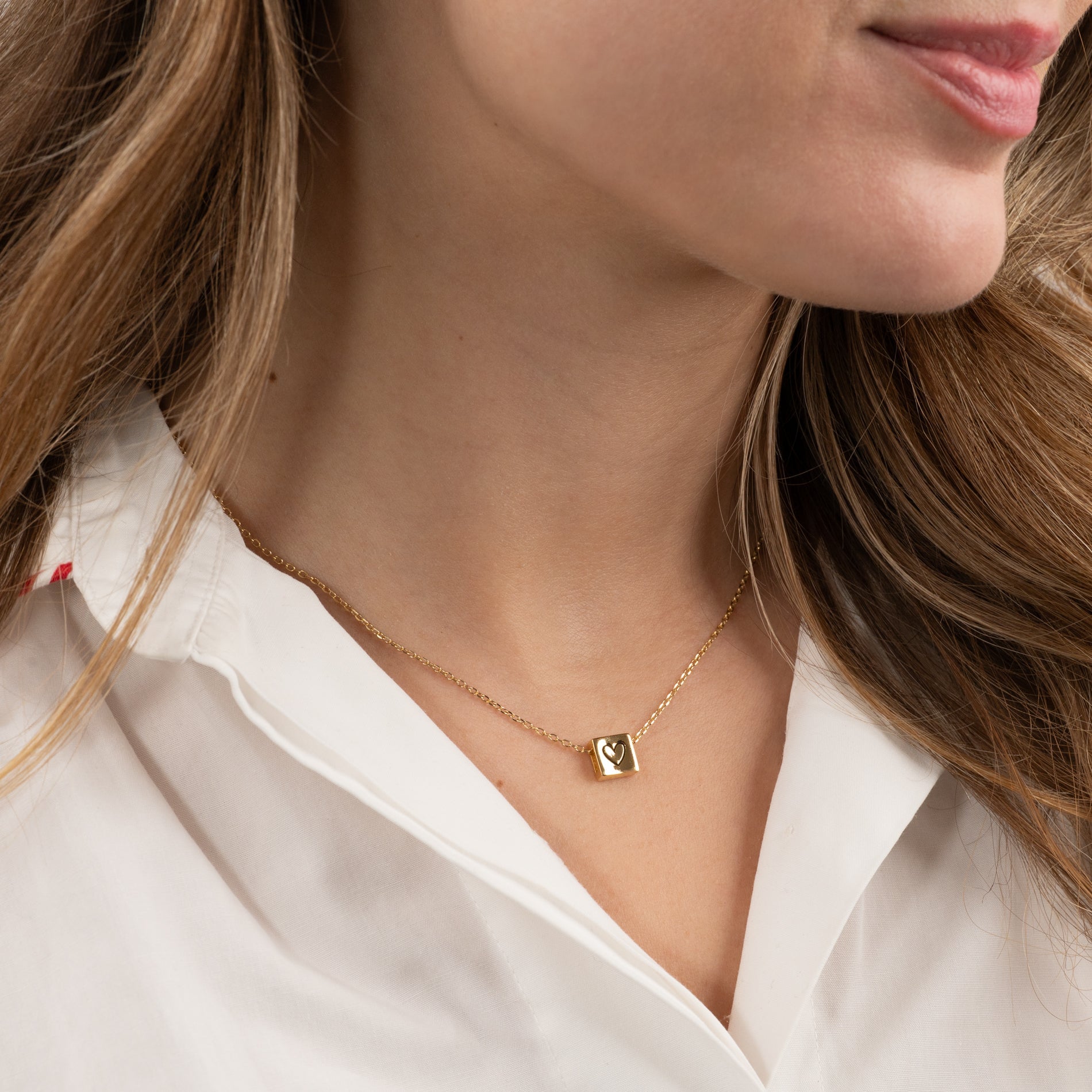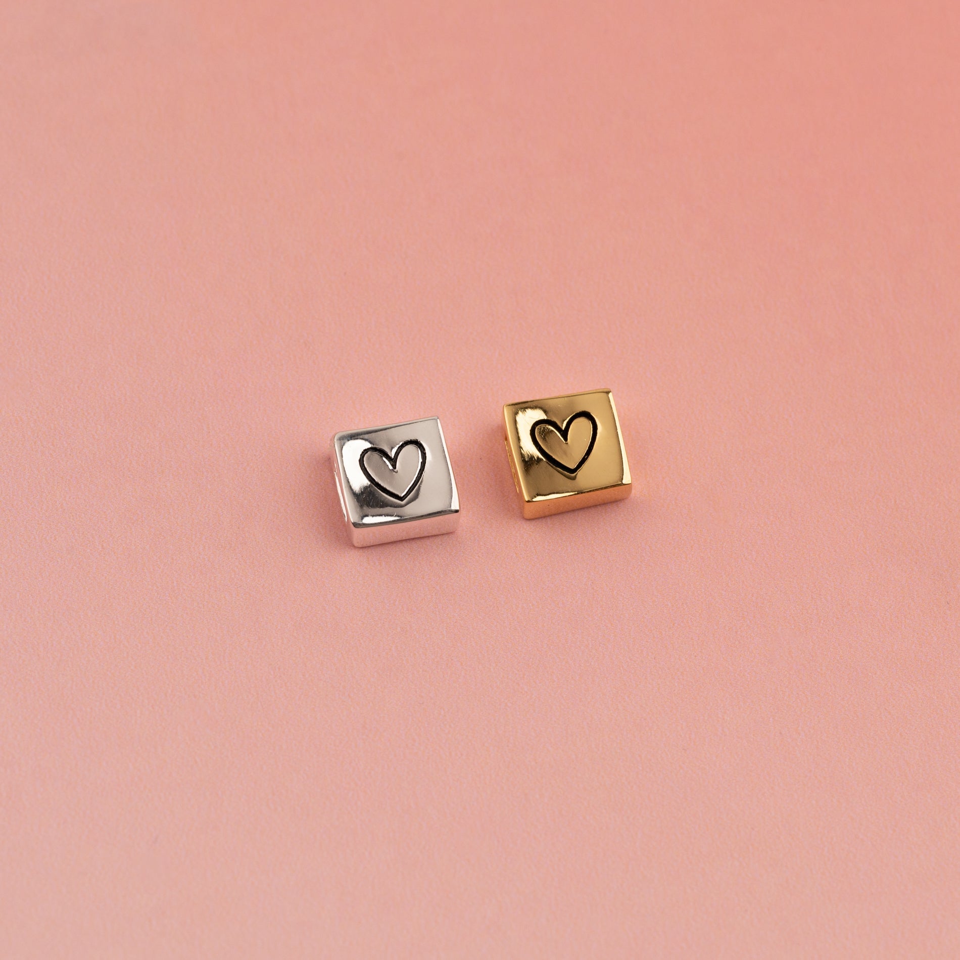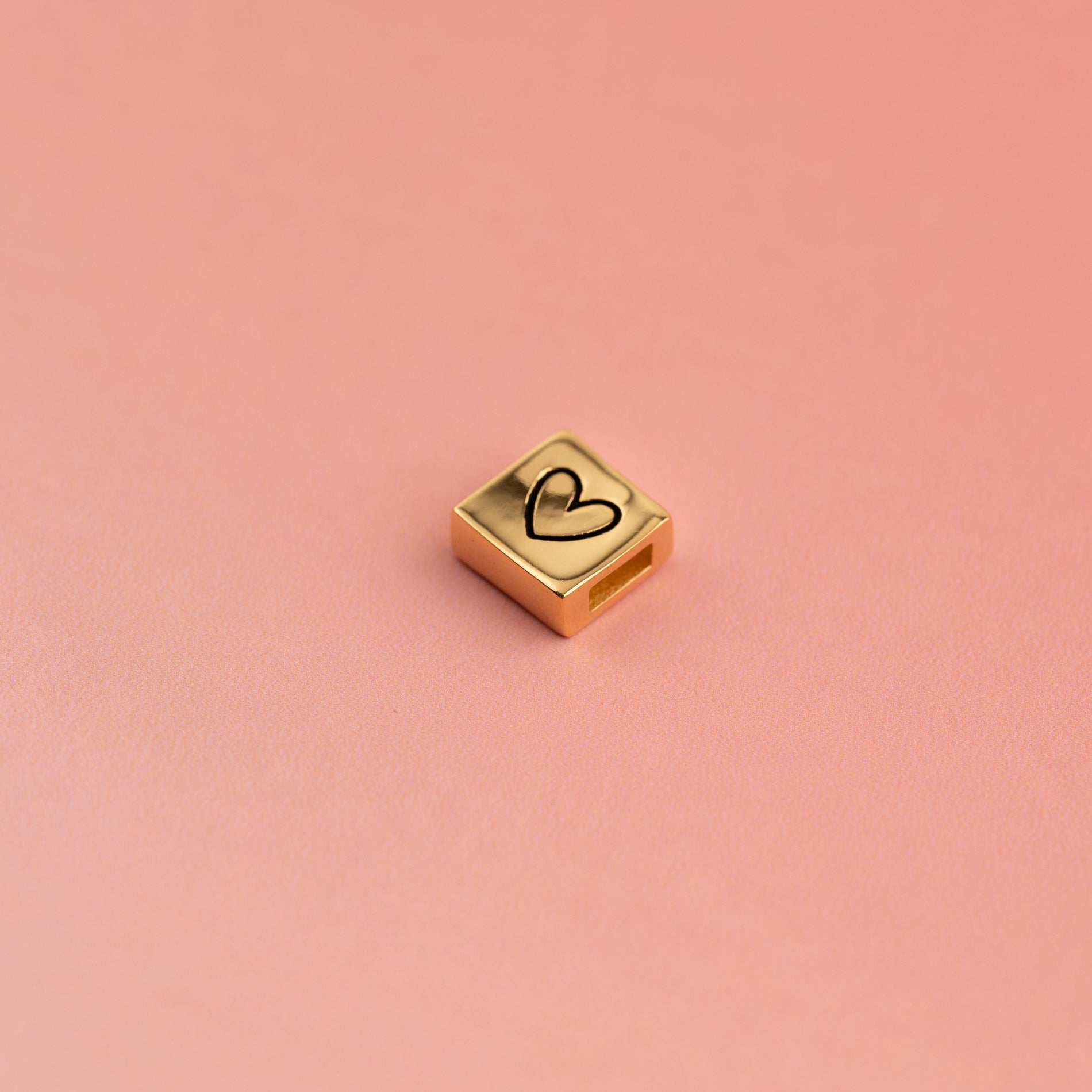 A pendant with subtle retro influences, inspired by classic keyboard keys. The design appears on both sides of the pendant. It measures 8 x 8 mm and has a slide-in opening of approximately 4 mm, making it easy to add to a necklace.