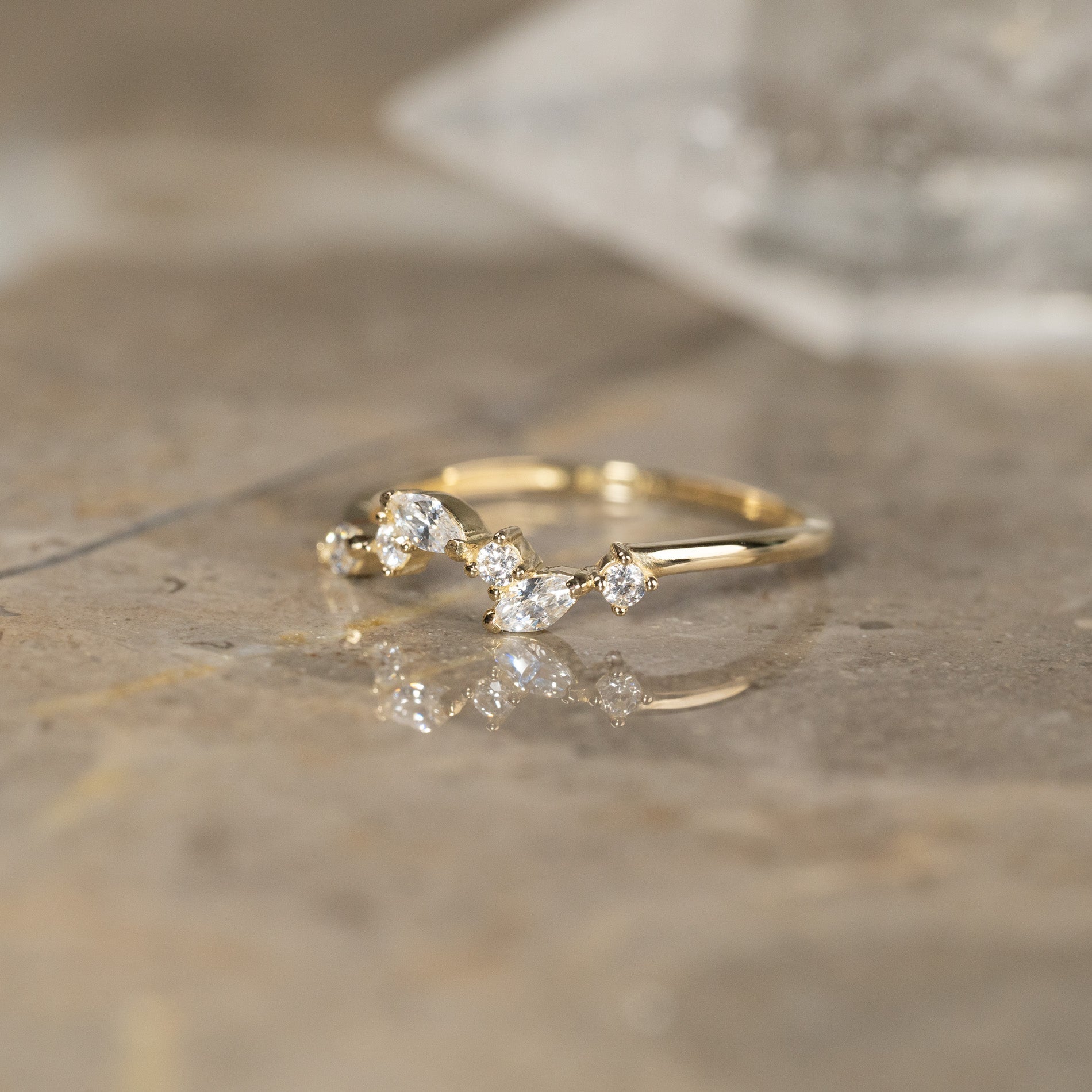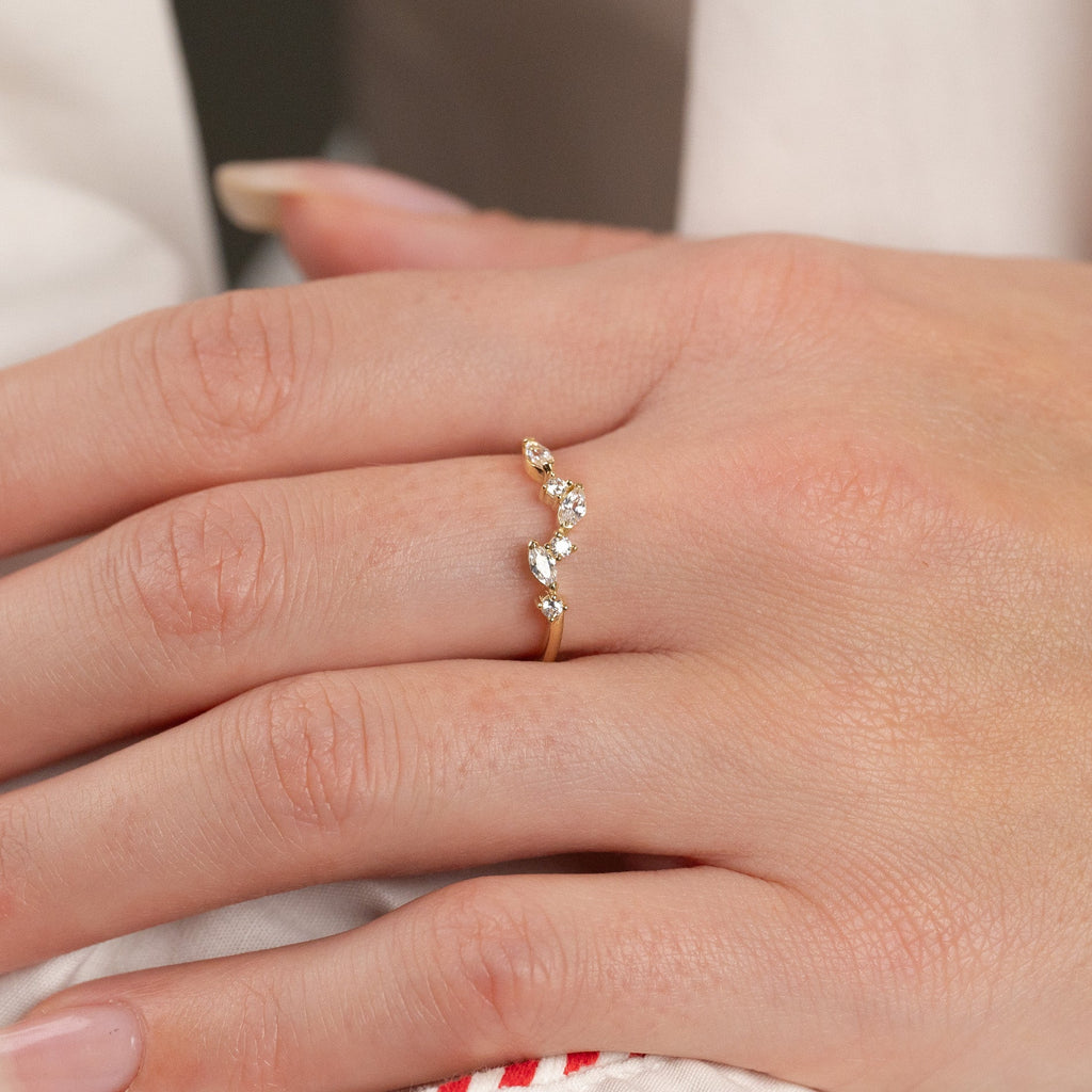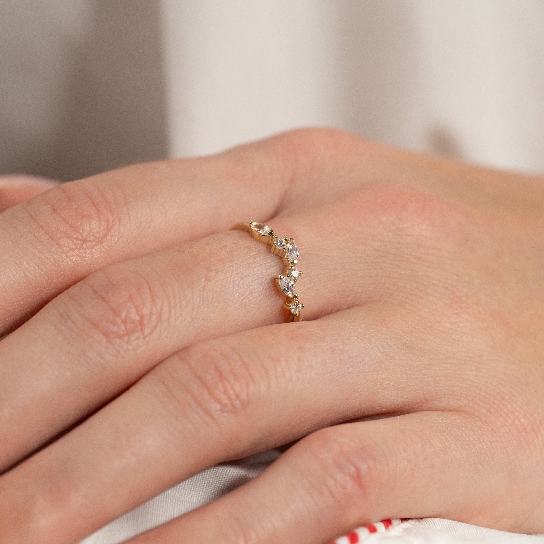 The ring has a feminine look with elegant clear zirconias that sparkle in the light and add a sophisticated detail along the front. The clear zirconias are arranged in an asymmetrical cluster that beautifully adorns the top of the ring band.