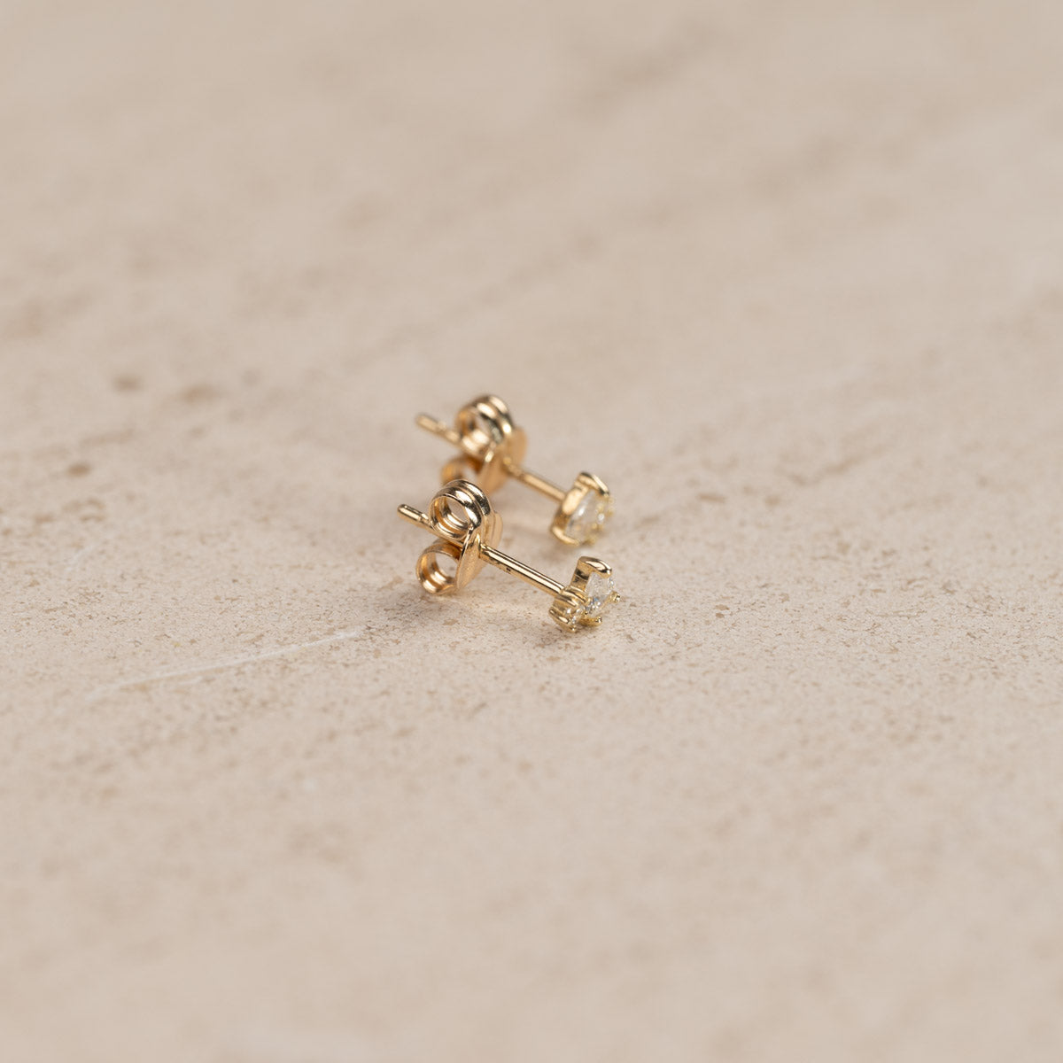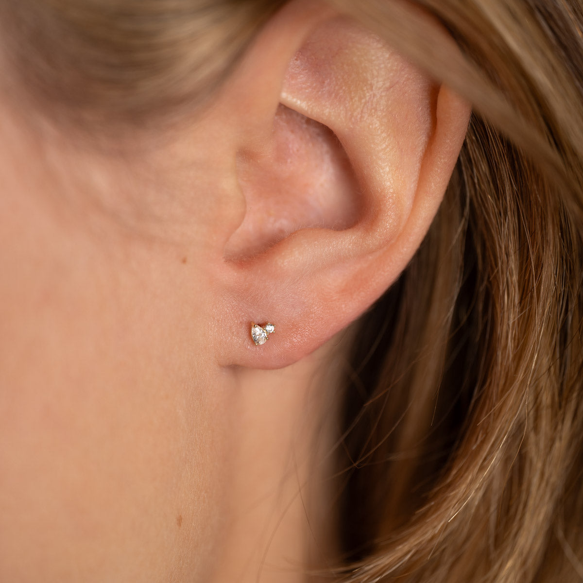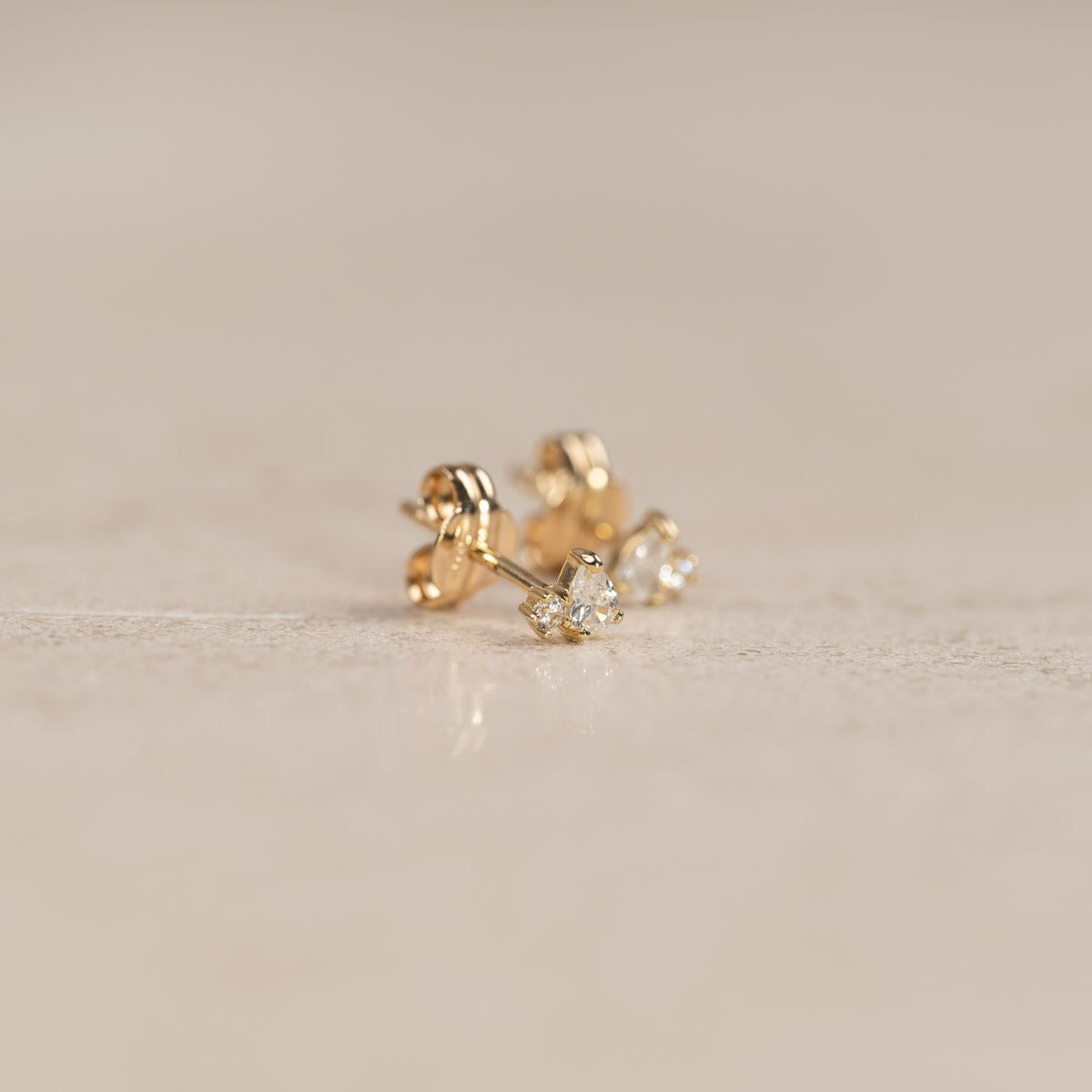 Ciela earrings are made of 100% recycled solid 9-karat gold. The earrings consist of a small round cubic zirconia and a slightly larger teardrop-shaped cubic zirconia in a small cluster. The earrings are incredibly elegant and feminine. Moreover, they are perfect for pairing with other earrings if you have multiple ear piercings or to be worn alone.