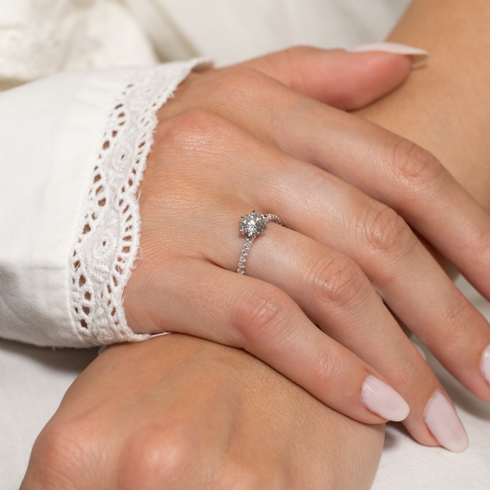 The ring has a classic, elegant, and feminine design, making it perfectly suited as an engagement ring.