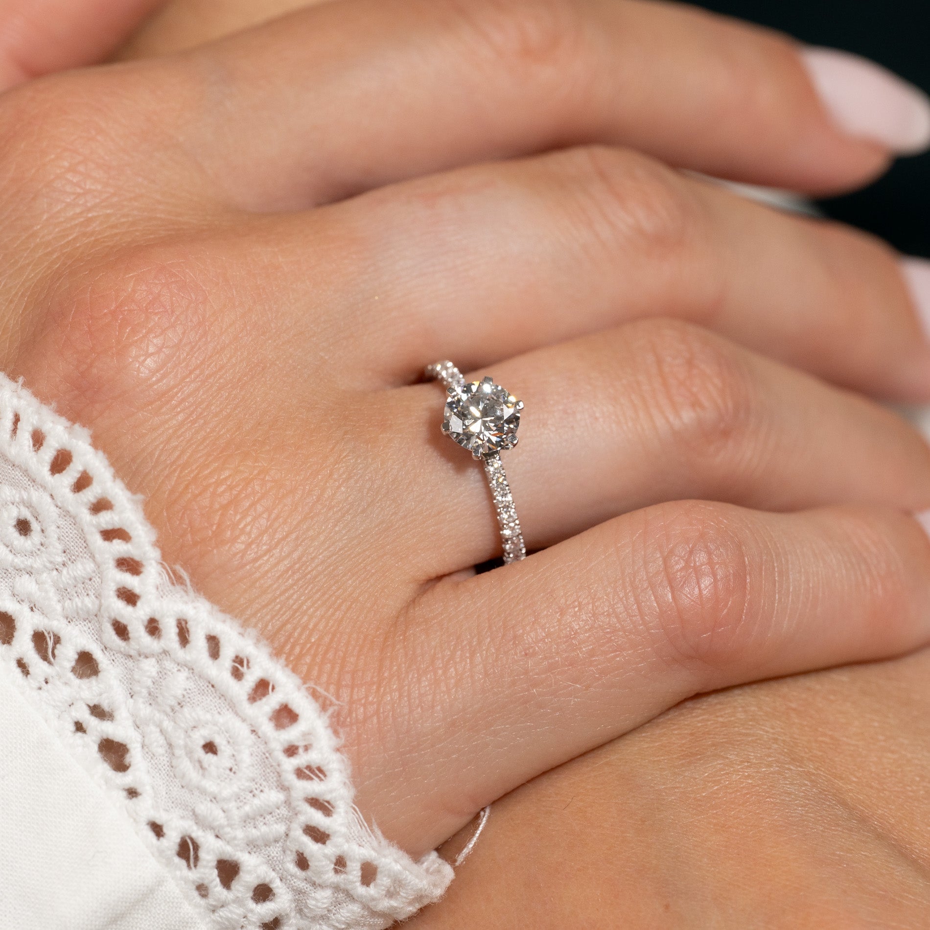 Beautiful ring in 14 karat solid white gold with lab-grown diamonds. The ring has a 1.0 ct. center stone secured in a classic six-prong setting. Diamonds are set along the band, which is slightly tapered, meaning it is wider at the base and slimmer near the center stone. This subtle detail creates balance and refined look.